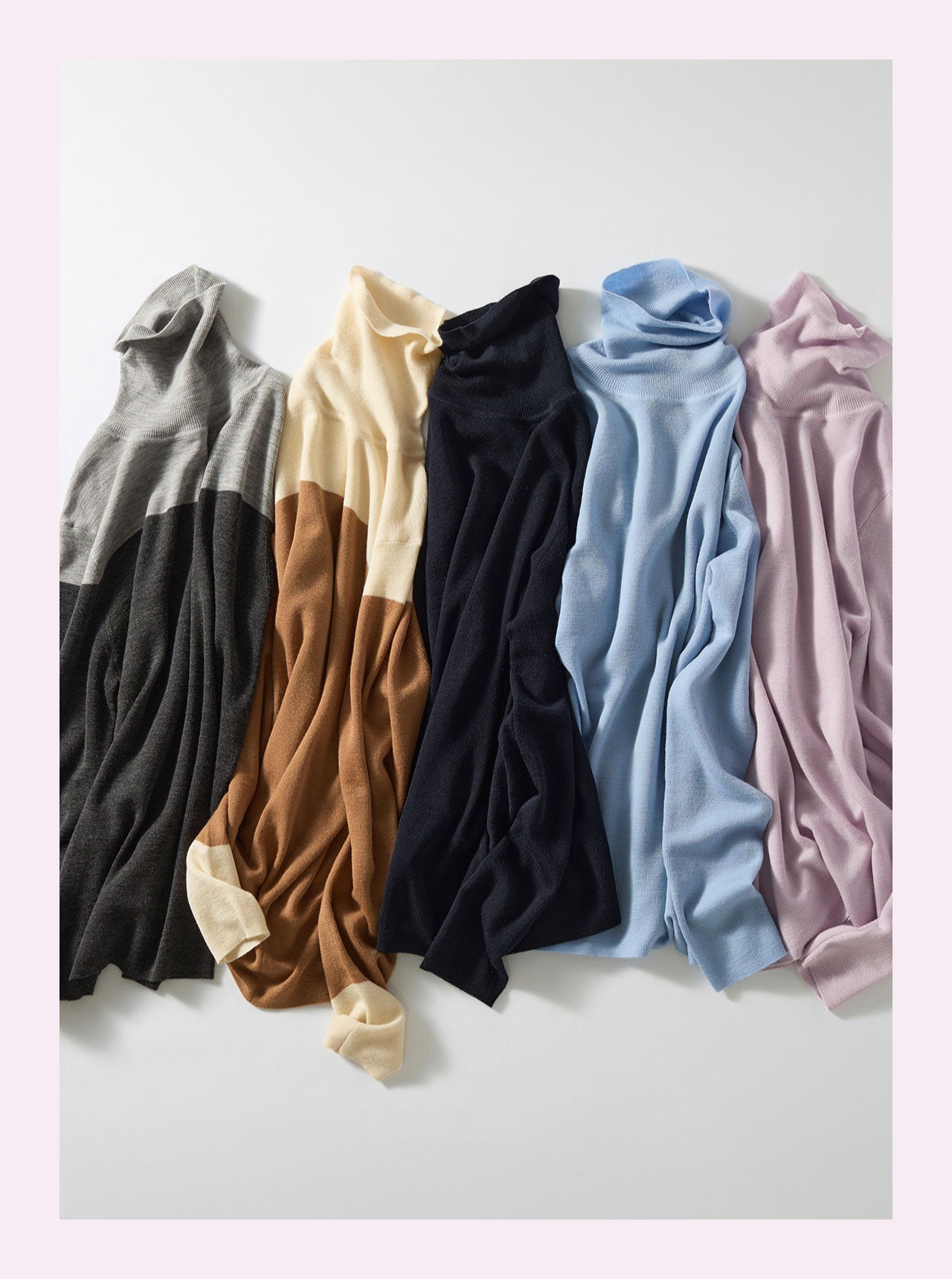 繊細なピュアウールをシルケット加工でなめらかに仕上げ、とろけるような柔らかタッチで仕立てたタートルネックニット。ネックの裏側は縫い目が出ないようすべて手作業でかがり、肌に当たらないなめらか仕立てにしました。ウールのちくちく感やタートルの肌当たりが苦手な方にこそおすすめしたい、秋冬のマストアイテムです。