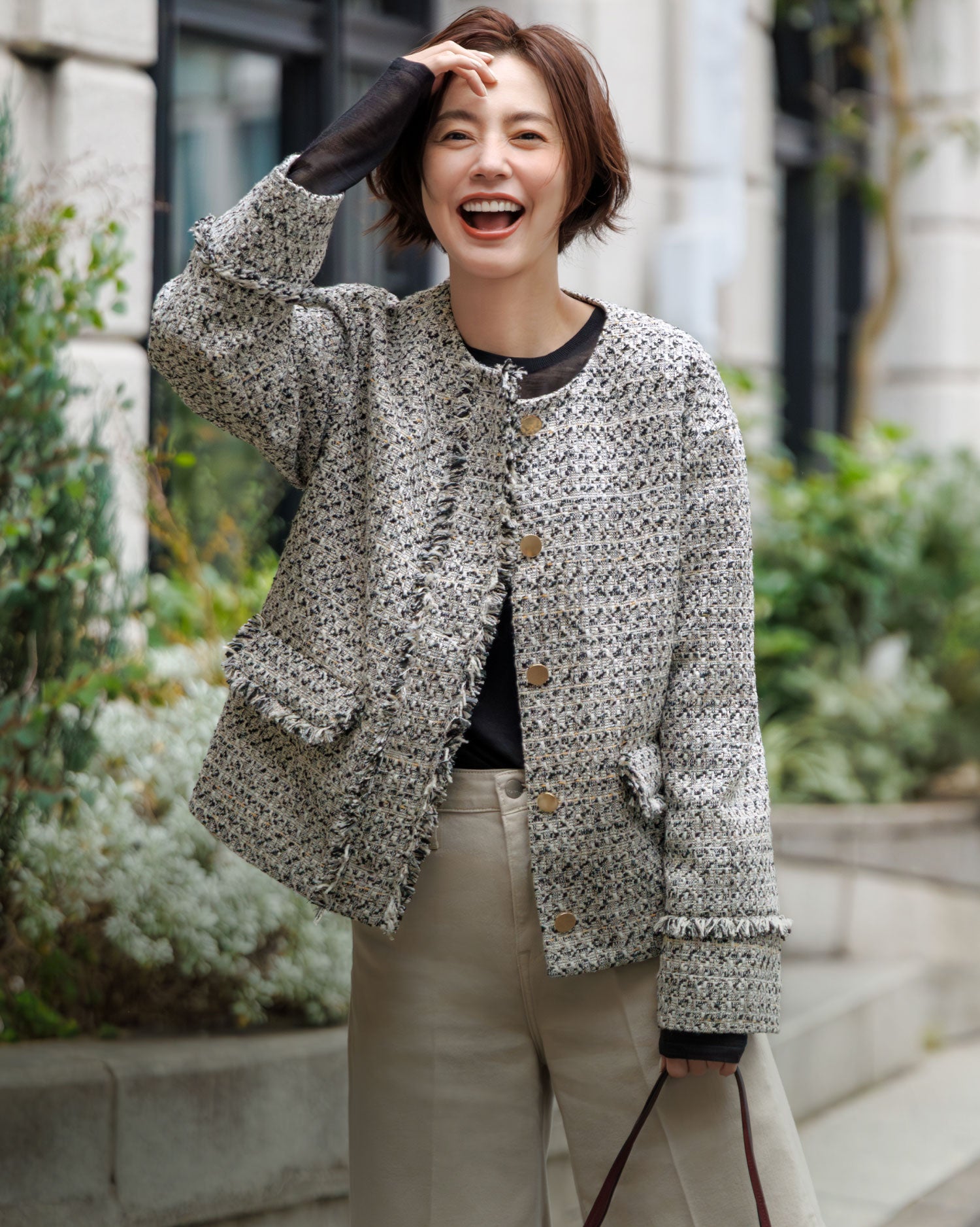 ラメ、スラブ、テープヤーンなど、さまざまな意匠糸とカラーヤーンを織り上げたファンシーツイードのノーカラージャケット。ツイードならではの品格はそのままに、ほどよいオーバーサイズとフリンジのディテールがこなれ感を演出します。デニムやワイドパンツを合わせて、大人らしいリッチカジュアルを楽しんで。