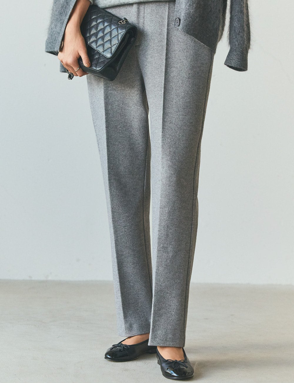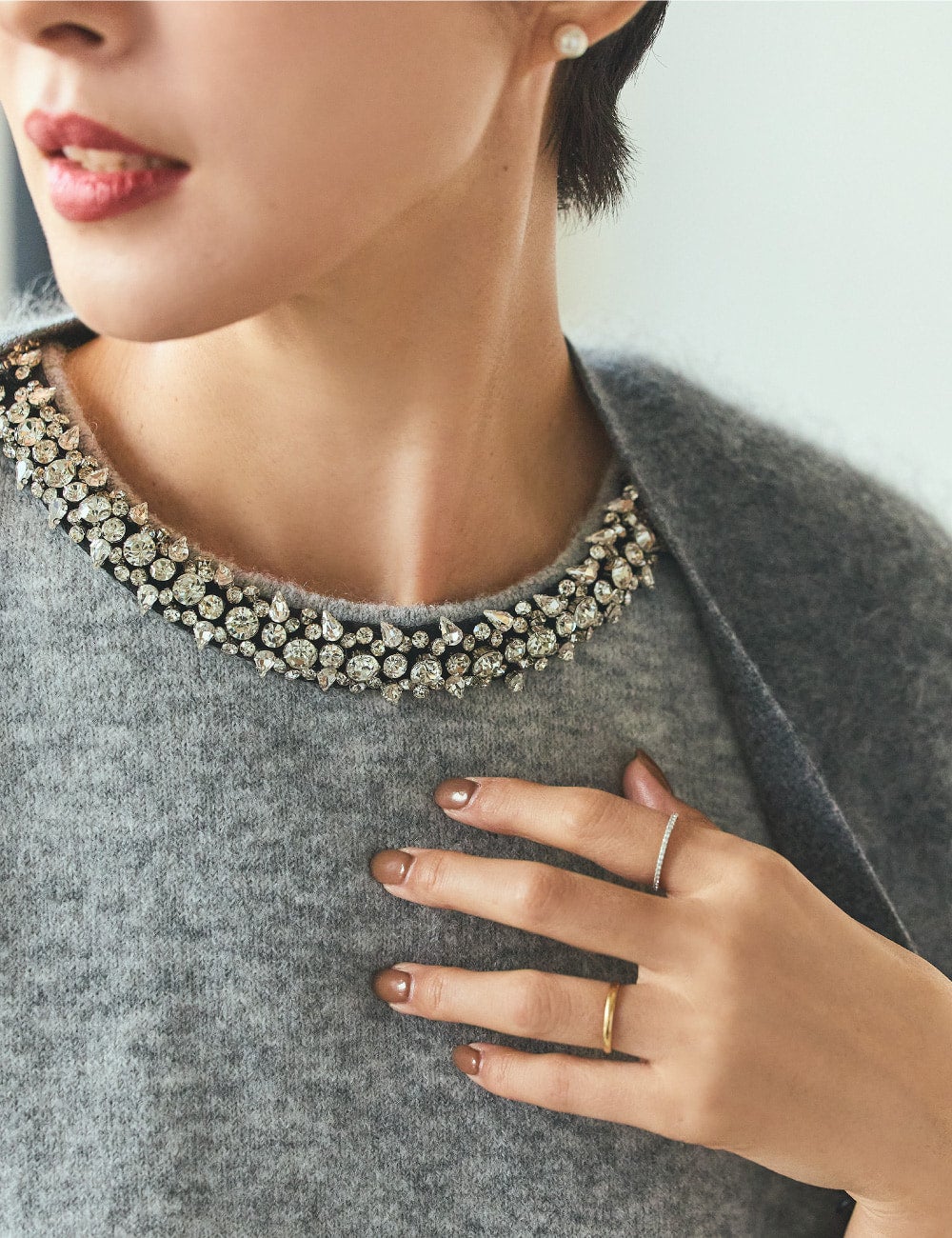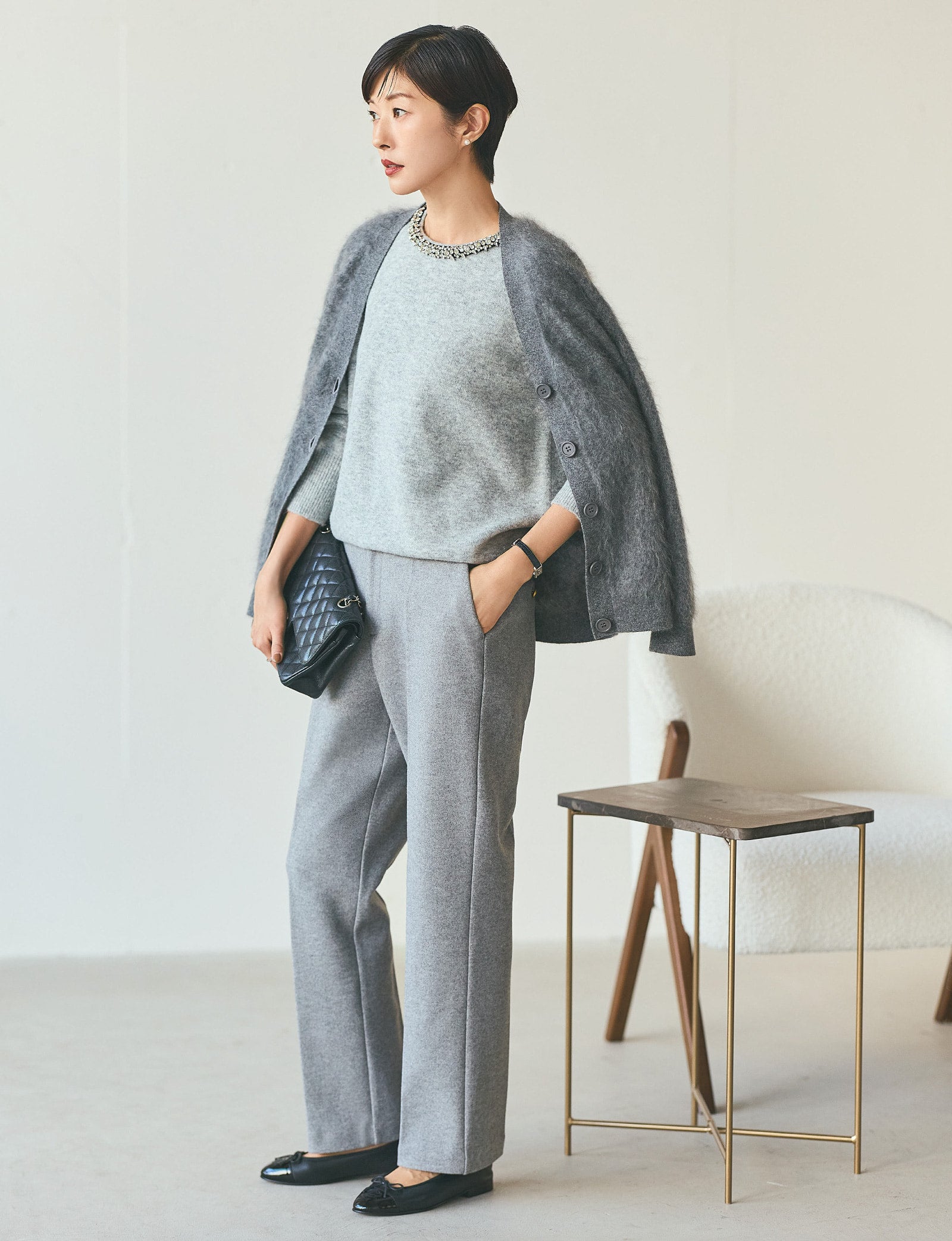 普段から辛口のモノトーン派で、グレーも大好きです。首元のビジューがポイントになったニットは、私にはちょっと珍しい、初めてのアイテム。他のアクセサリーがいらないくらい華やかで、だけれどトゥマッチではないところがとても素敵。集まりの多いこれかの季節、こういう一枚があるととても便利ですよね。いつものキャラクターを変えずにトライできるのも気に入りました。優しいグレーをレイヤードして、さらに豊かな風合いのカシミヤのカーディガンを羽織って。会食やお呼ばれした日のコーディネートに。
