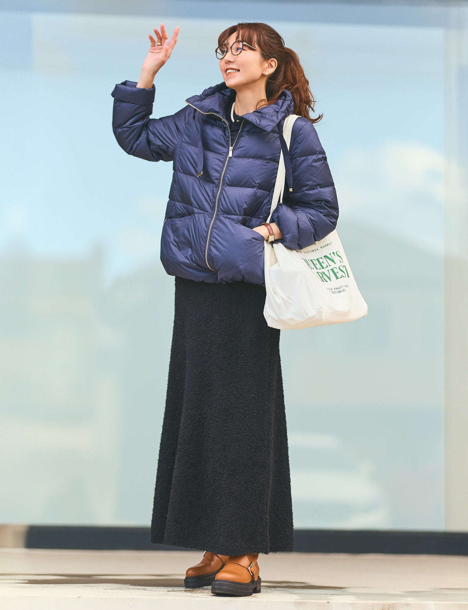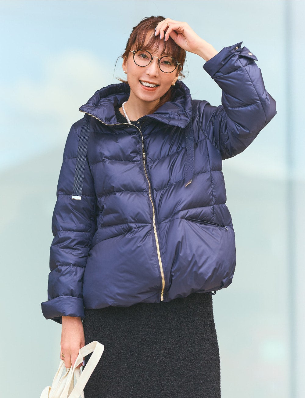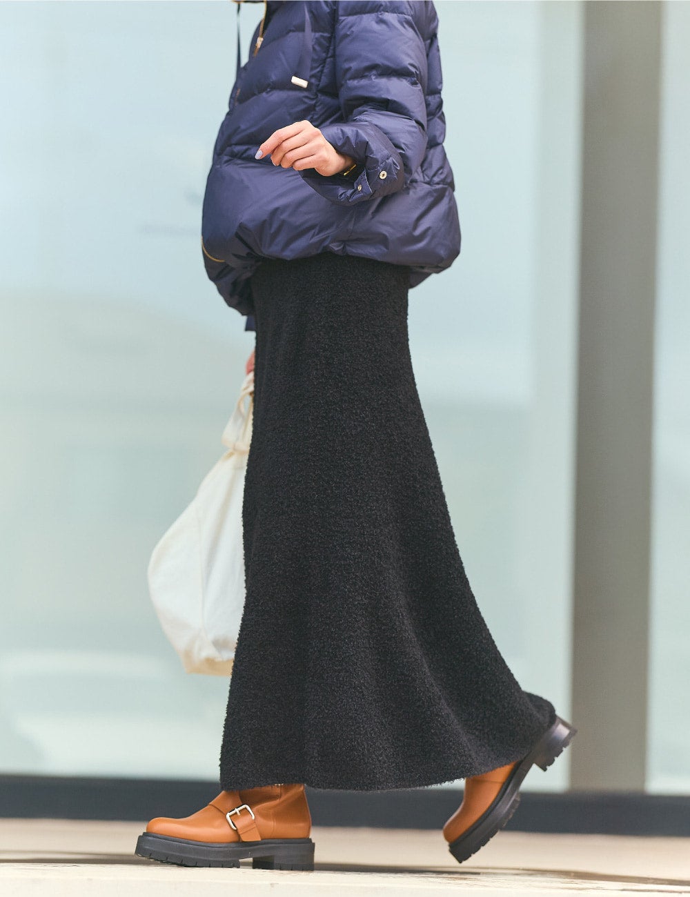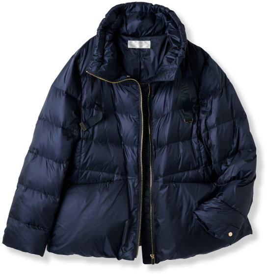 つい防寒として選びがちですが、”されどダウン”と思わせてくれたのが、こちら。ダウンジャケットでこんなにおしゃれができるなんて、感激です。高めに設定されたスタンドカラーとゴールドのメタルジッパー、グログランリボン、裾のコードでシルエットが変えられたり、カラバリが豊富だったり・・・、そしてこの価格!と、とにかく優秀。ブークレーのスカートと合わせ、ネイビー×黒の大好きな配色で。着心地がらくちんなので、撮影の日やデイリーコーディネートに最適です。