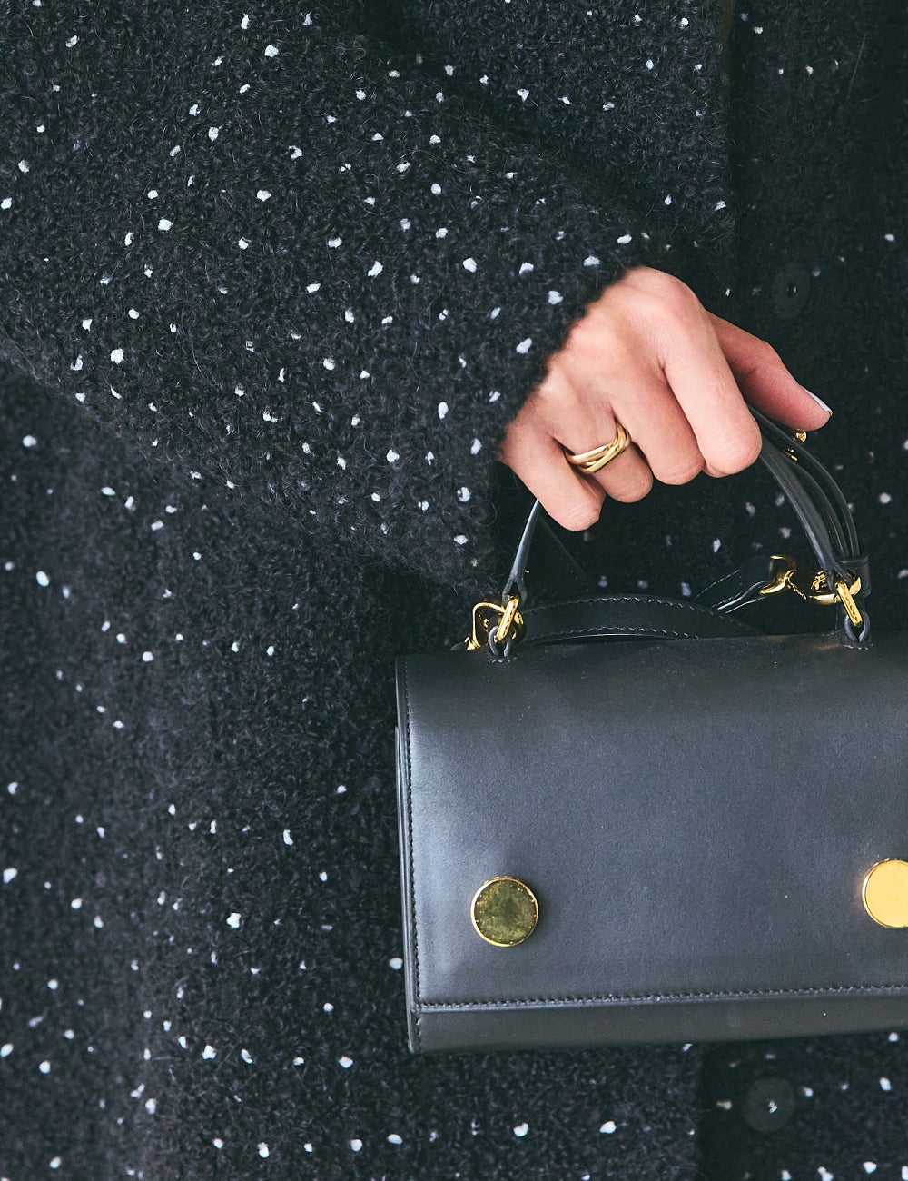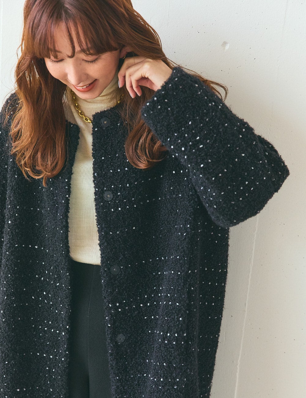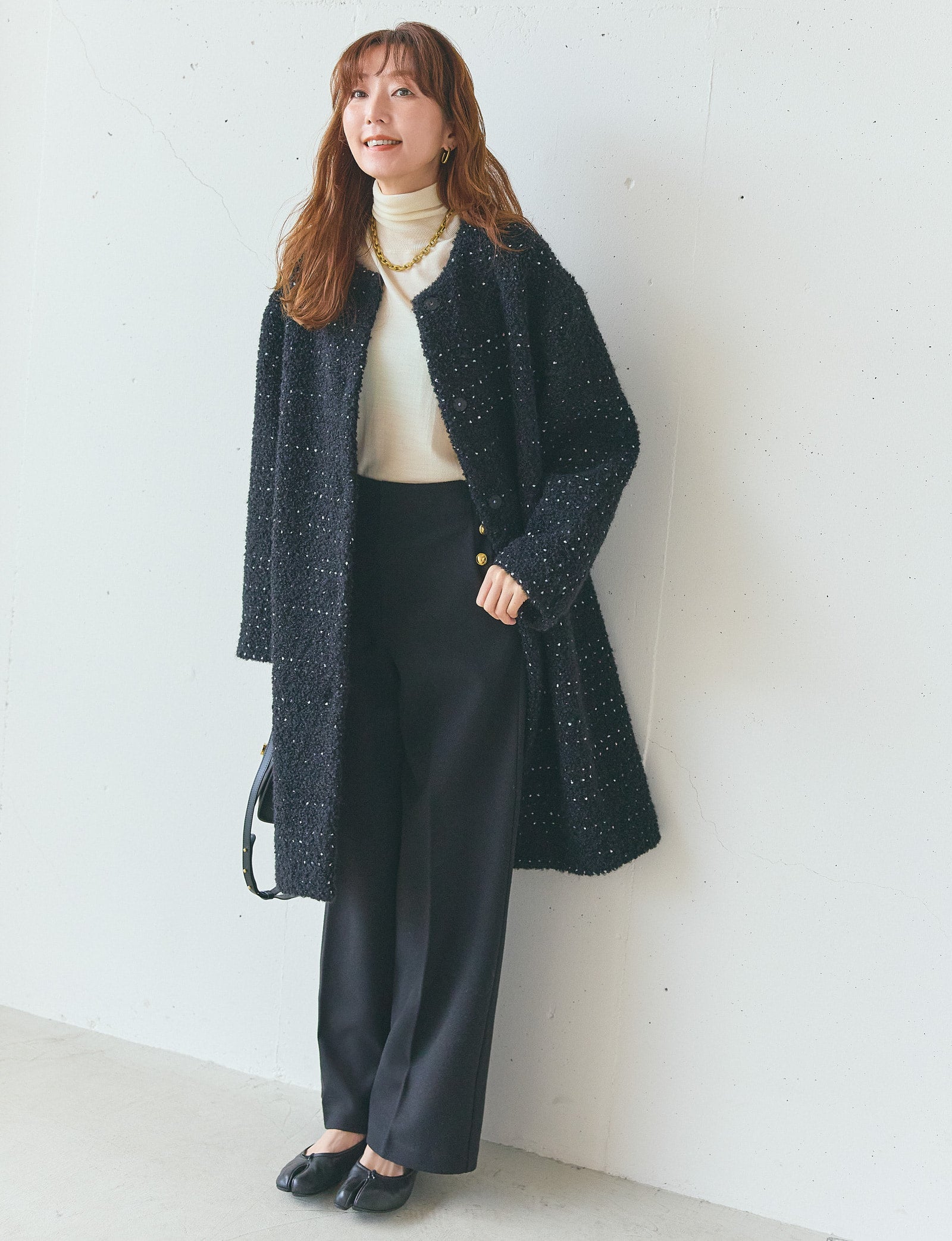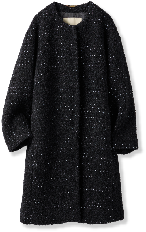 キレイめにも着こなせる、華やかでエレガントな雰囲気のコートは、お出かけやお呼ばれの多い12月にとても重宝する一着だと思います。袖を通して驚いたのが、とても軽いこと。観劇にもよく行くのですが、アウターが預けられない会場だったり、逆に寒くて預けたくない時など、膝の上に置いていても気にならないくらい。ジャケット以上、コート未満という佇まいもよくて、マリンパンツと合わせたらセットアップのようにしっくり馴染みました。