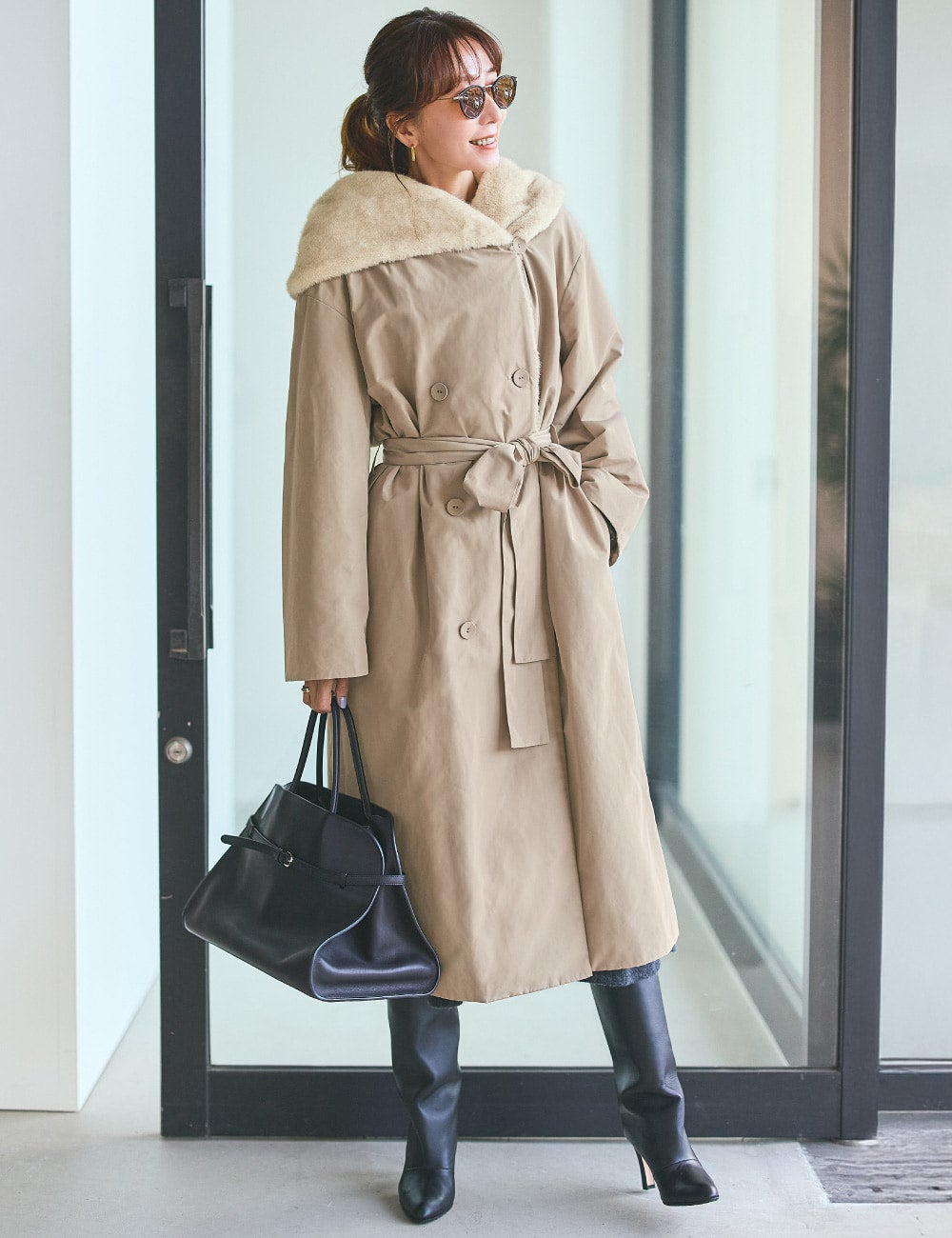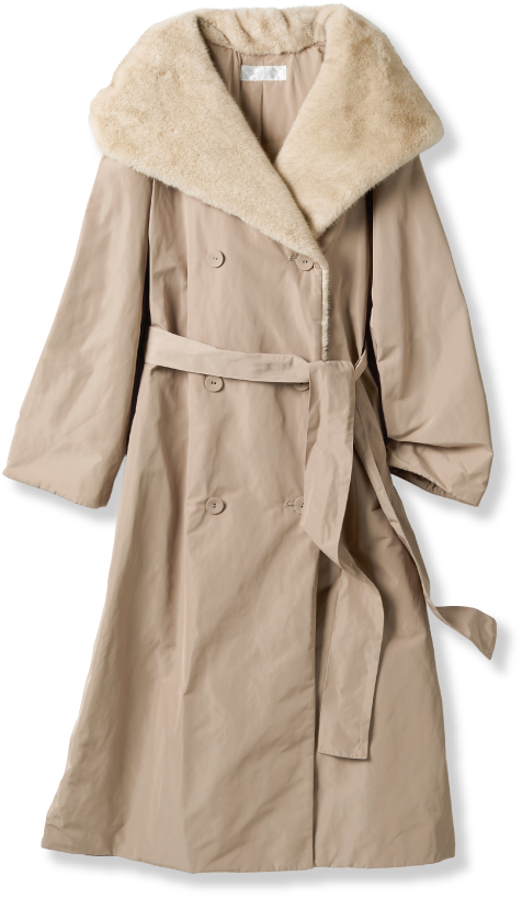 ファーのフードがポイントになったコートを主役に、ニットワンピースとブーツを合わせて、真冬の旅スタイルをイメージしました。オーバーサイズのシルエットとテクニカル素材のコンビネーションも新鮮で、インパクトも抜群です。 軽いのに、マジカルサーモ素材がとにかく暖かくて秀逸・・・! フードはケープのようにもアレンジできたり、ウエストをキュッと結ぶとドレスのようにまとえたり、と一枚でいろんな着こなしが楽しめるので旅にも重宝します。