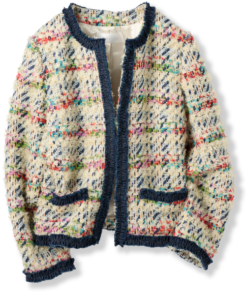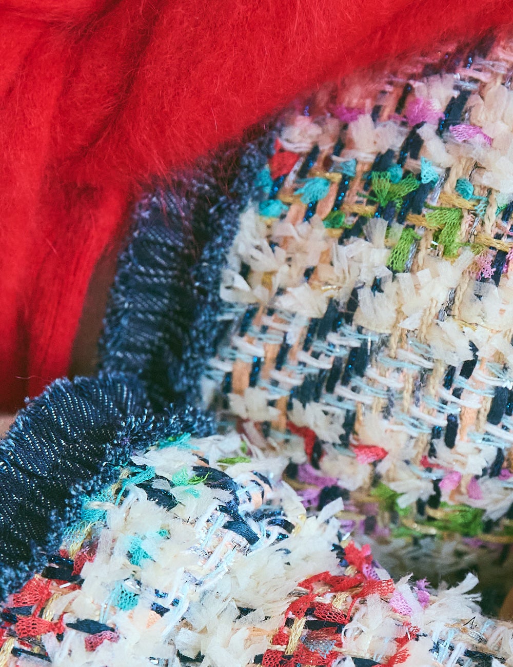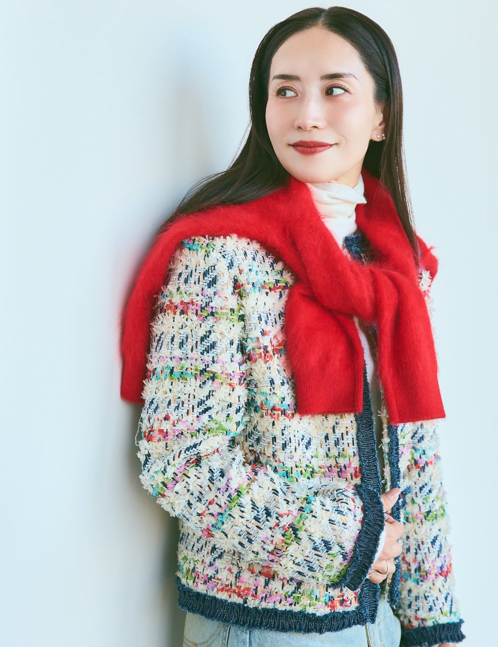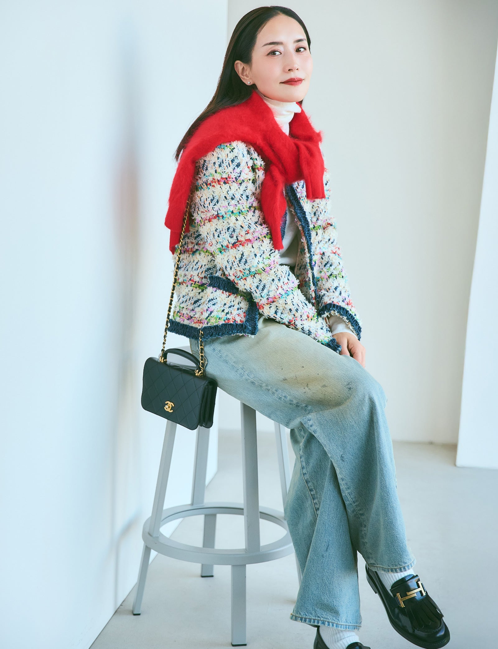 白をベースに、ブルーやレッド、グリーンなど彩り豊かなファンシーツイードのジャケットは、一枚で着映えを約束してくれる主役アイテム。ノーカラーの正統派デザインなので、ウォッシュの効いたデニムで少しハズして。柄の赤を引っ張ってニットを肩掛けして、アクセサリーがわりのアクセントにしてみました。首元と足元に白を覗かせて、抜け感と清潔感をポイントに。