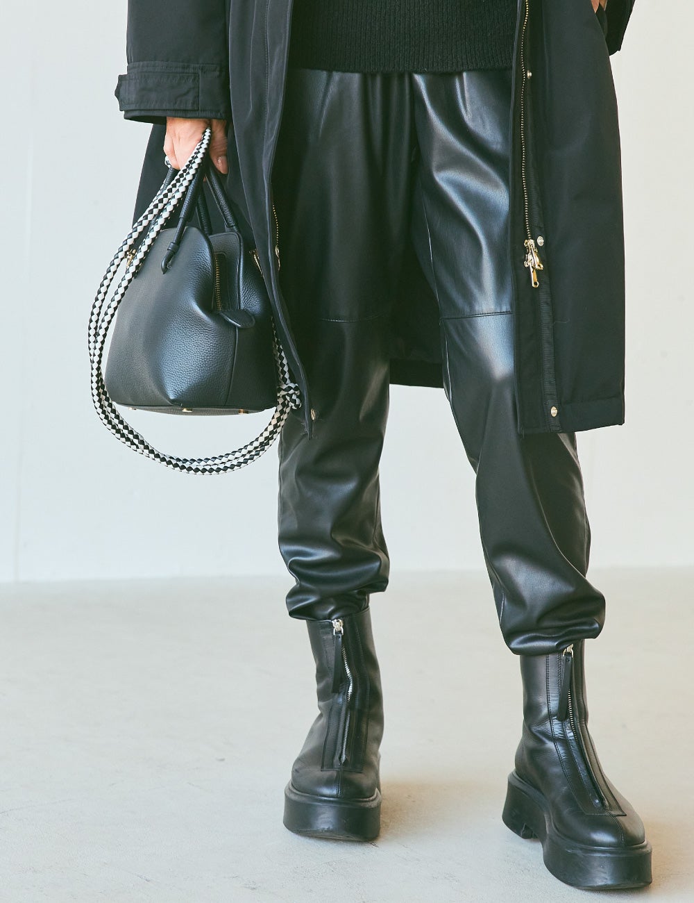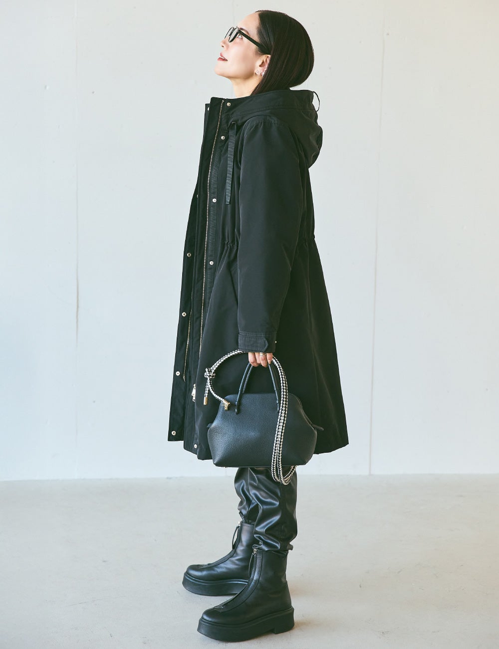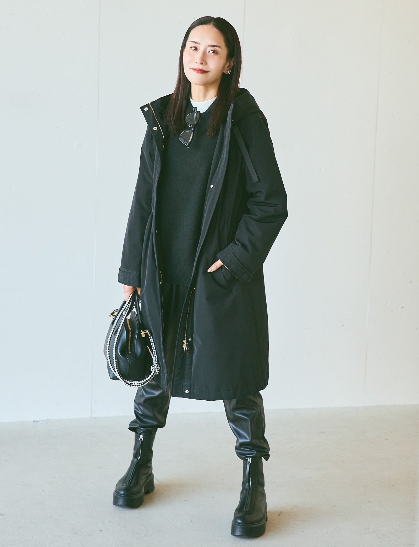 王道のオールブラックのスタイリングのアウトラインに選んだのは、モッズコートのようなデザインのコート。スポーティなスニーカーなどでカジュアルダウンさせず、レザー調のパンツや、バッグとブーツもレザーにして大人の着こなしに仕上げました。立体的なフードがポイントになって、サイドスタイルもとてもきれいですよね。すっきり着こなせて、この暖かさはとても優秀!