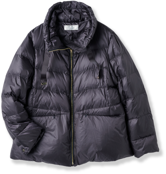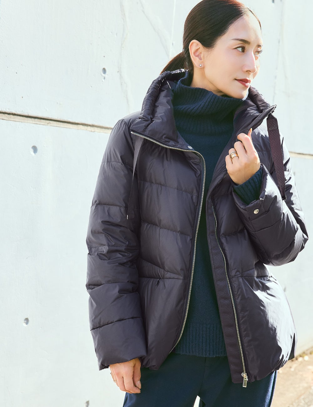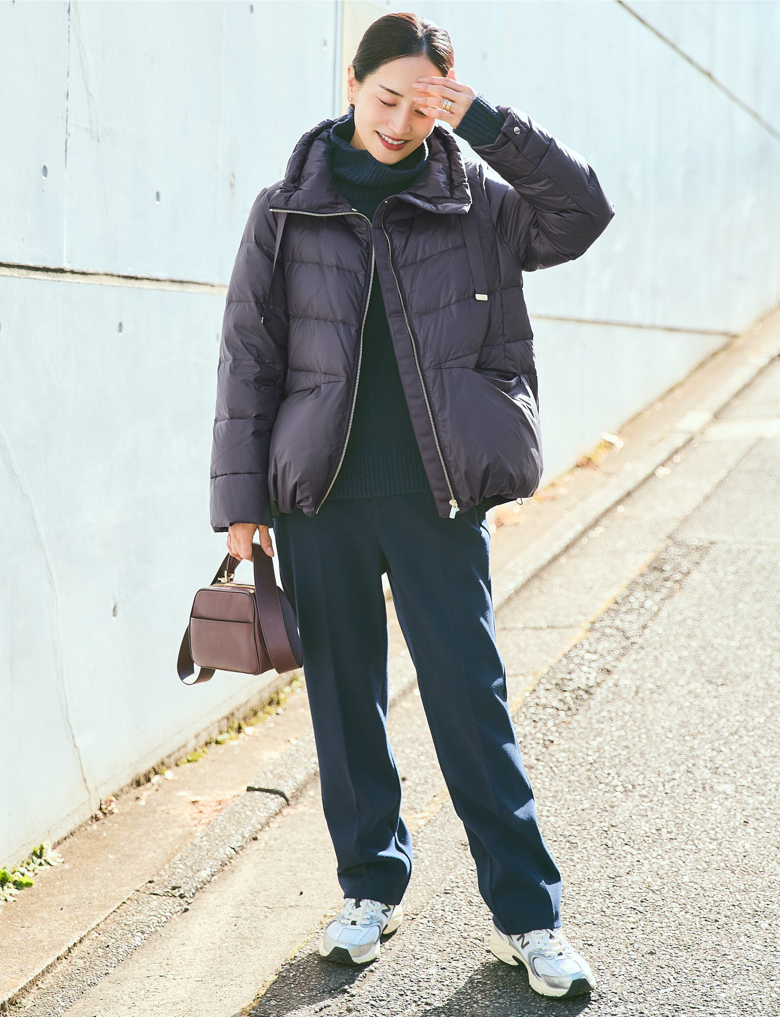 王道のオールブラックのスタイリングのアウトラインに選んだのは、モッズコートのようなデザインのコート。スポーティなスニーカーなどでカジュアルダウンさせず、レザー調のパンツや、バッグとブーツもレザーにして大人の着こなしに仕上げました。立体的なフードがポイントになって、サイドスタイルもとてもきれいですよね。すっきり着こなせて、この暖かさはとても優秀!