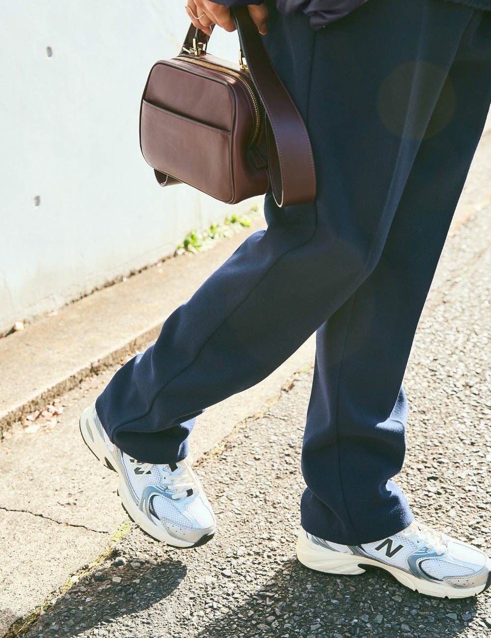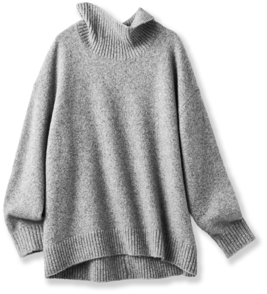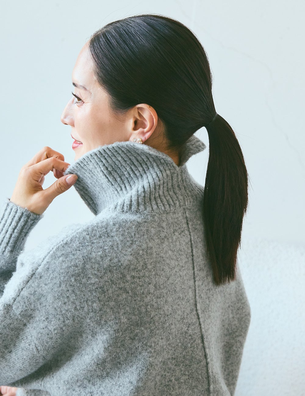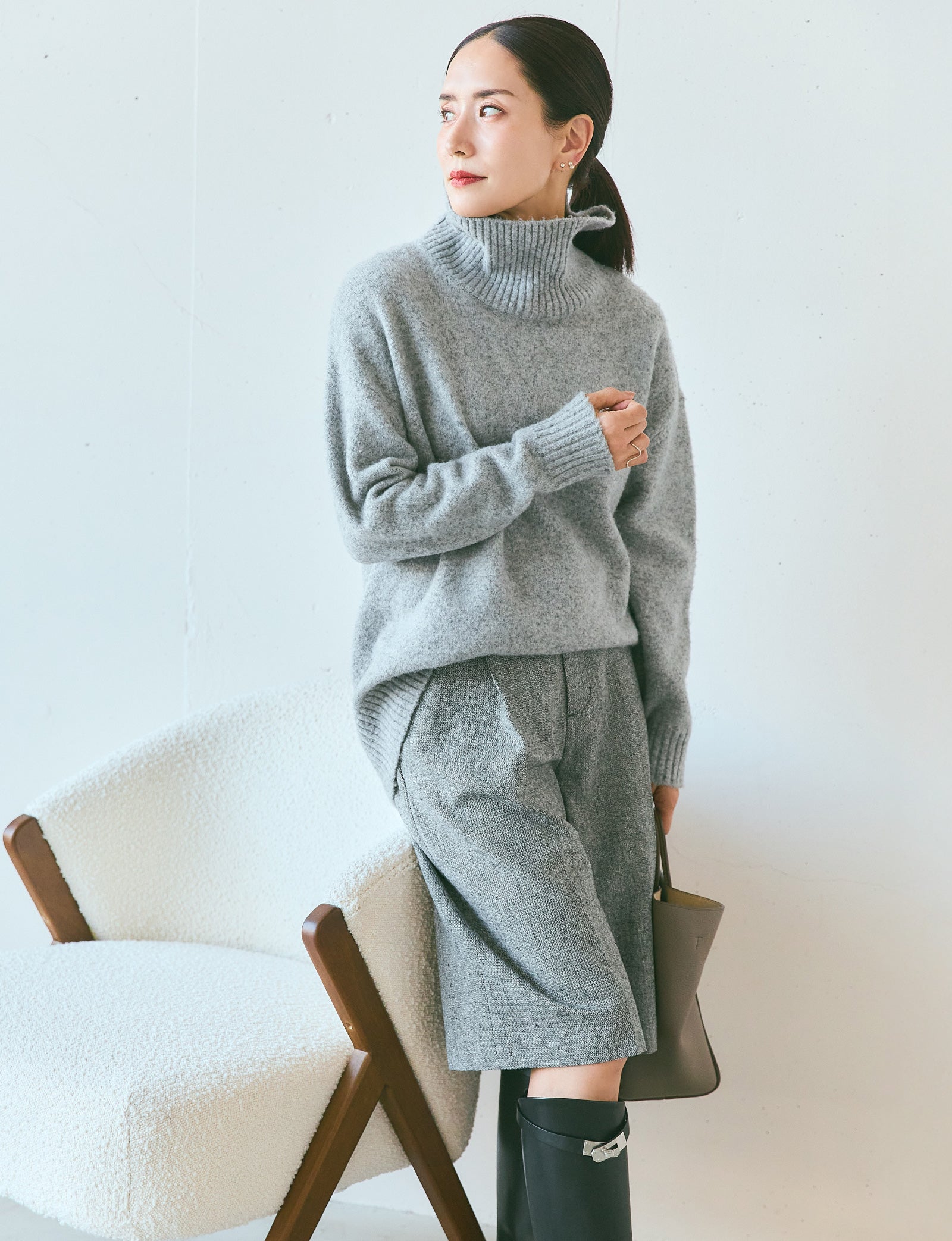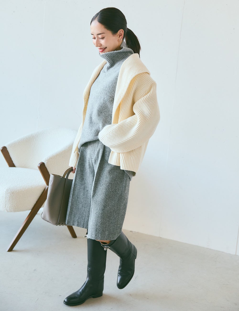 グレーが大好きなので、ワントーンスタイルは私の定番です。この冬はシルエットでアップデートしてみました。肌触りのいいニットは、首元にすっと寄り添う襟元も素敵で、シンプルに着ても絵になるパーフェクトなフォルム。ハーフパンツとロングブーツのコンビネーションも、今年らしさのポイントです。バッグもグレー、光を足す白のニットと、引き締め役の黒のブーツで、シンプルに。家族でドライブに行く日はこんなスタイリングのイメージで。