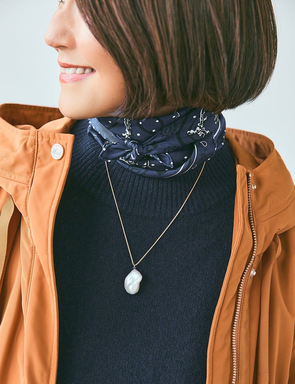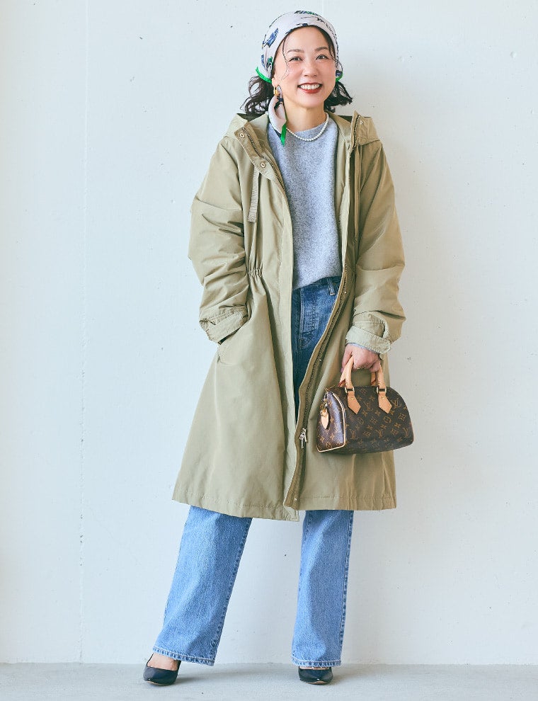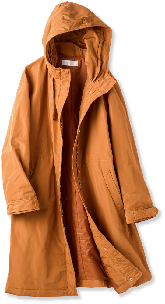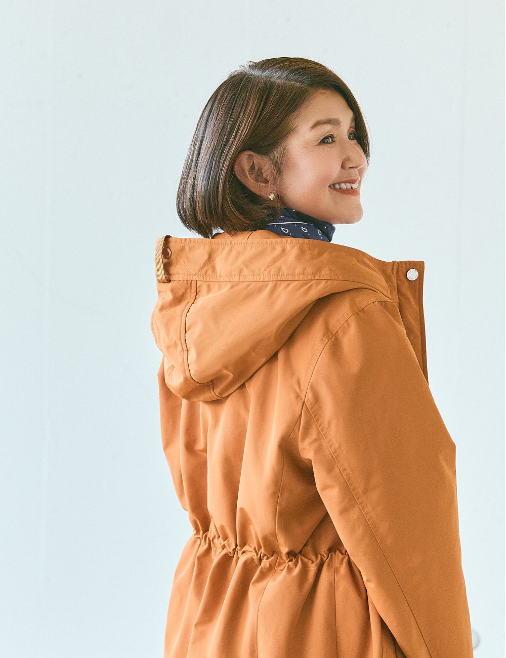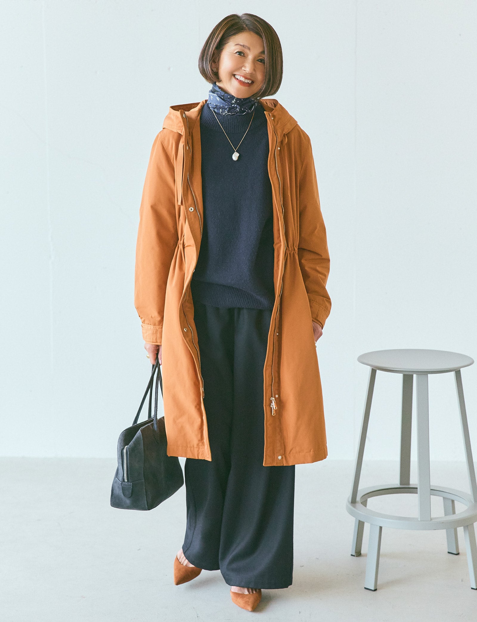 モッズコートのように薄手なのに、ダウン並みに暖かいと伺って気になっていました。ビターなオレンジというのか、目立ちすぎず、沈みすぎないこのカラーも、重たくなりがちな冬のおしゃれのアクセントになってくれます。定番カラーとはすんなり合うと思いますが、特にネイビーとのコンビネーションが好き。ニットとパンツ、バッグとスカーフもネイビーでまとめて上品に。