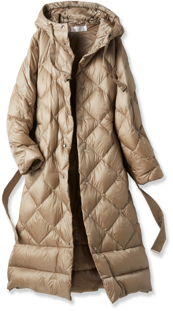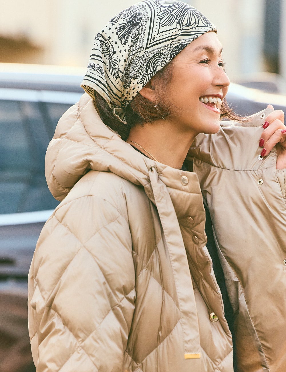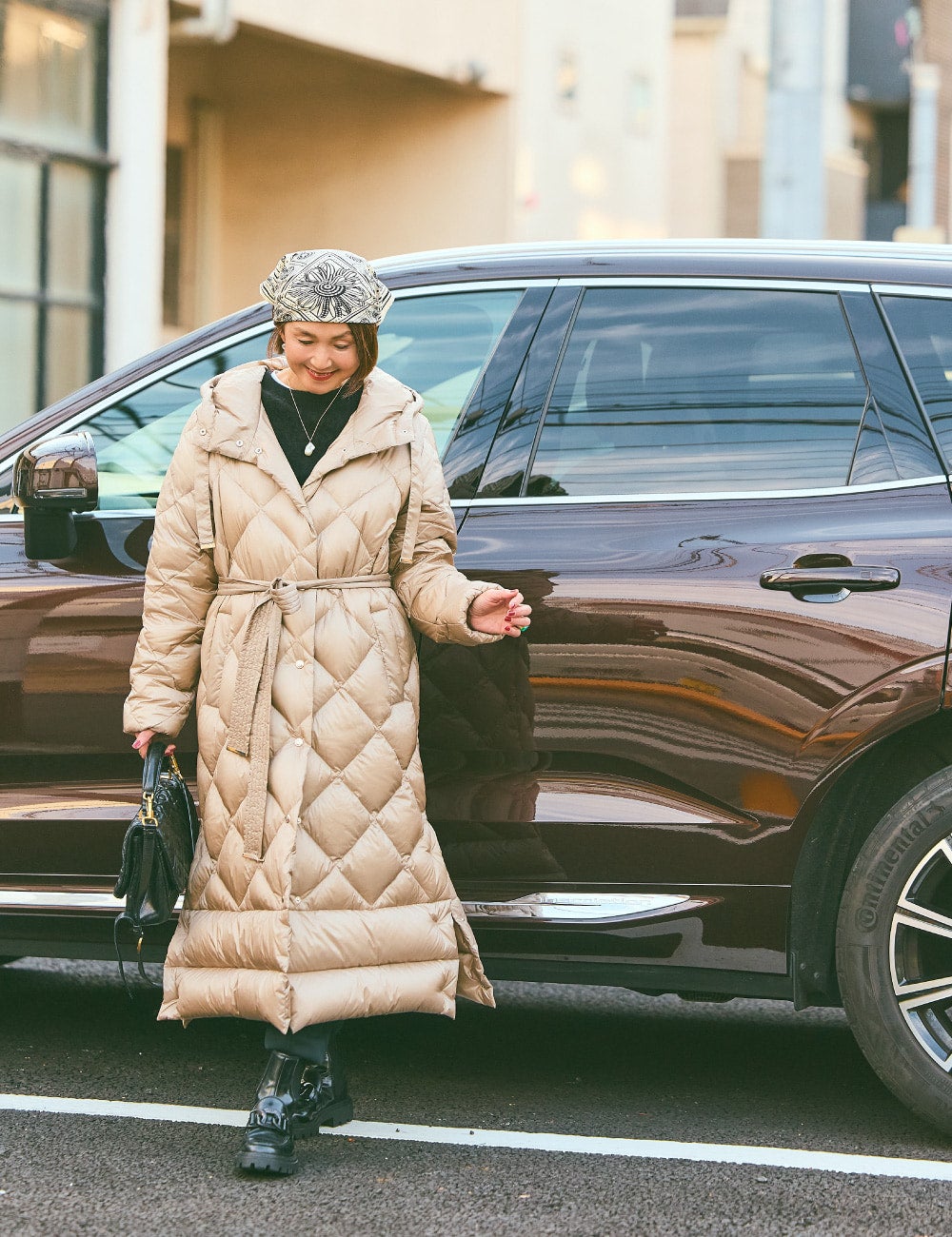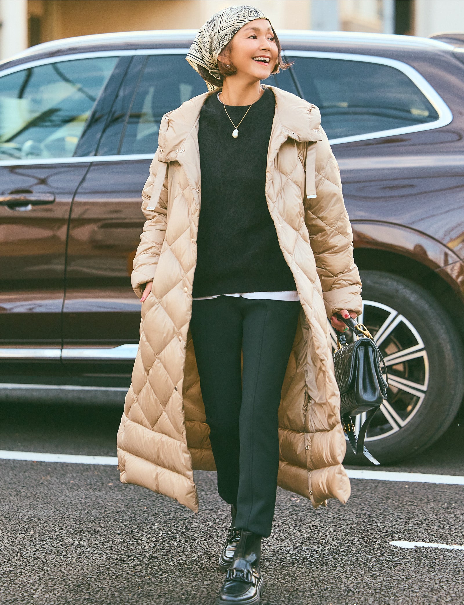 ダウンジャケットとは一線を画す、優雅なコートのようなデザインが気に入りました。寒がりで冬が苦手な私にとって何よりもうれしいのは、身軽なのにとても暖かいこと。真冬の外ロケや、雪山に遊びに行く時にも手放せなくなりそうです。つやをたたえた上品なベージュカラーは黒のワントーンスタイルで引き締めて。カジュアルスタイルから、ヒールの靴とも合わせられる振り幅の広さも、このコートの魅力だと思います。