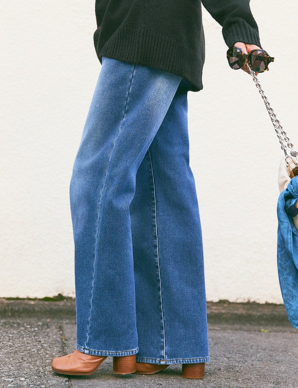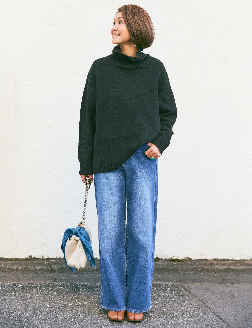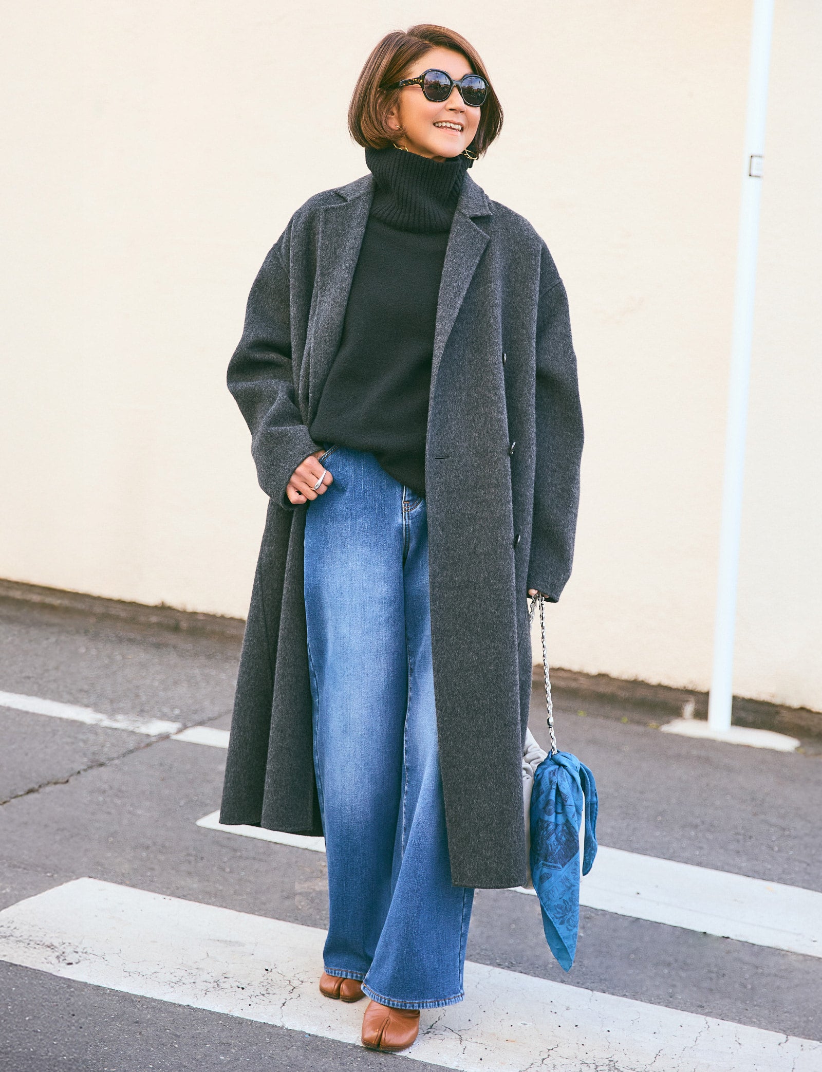 デニムだと思っていましたが、フェード感が再現された柔らかなストレッチ素材。しかも、内側にはなめらかなベロアが付いていて・・・ だまされちゃった感じです(笑)。 タイツやレギンスいらずで暖かく、裏起毛のスウェットパンツのように、とにかくらくちん。真っ直ぐに落ちるストレートシルエットもきれいです。ゆったりニットと合わせたシンプルスタイルですが、立体感があってサマになるのもいいですよね。とっても優秀!