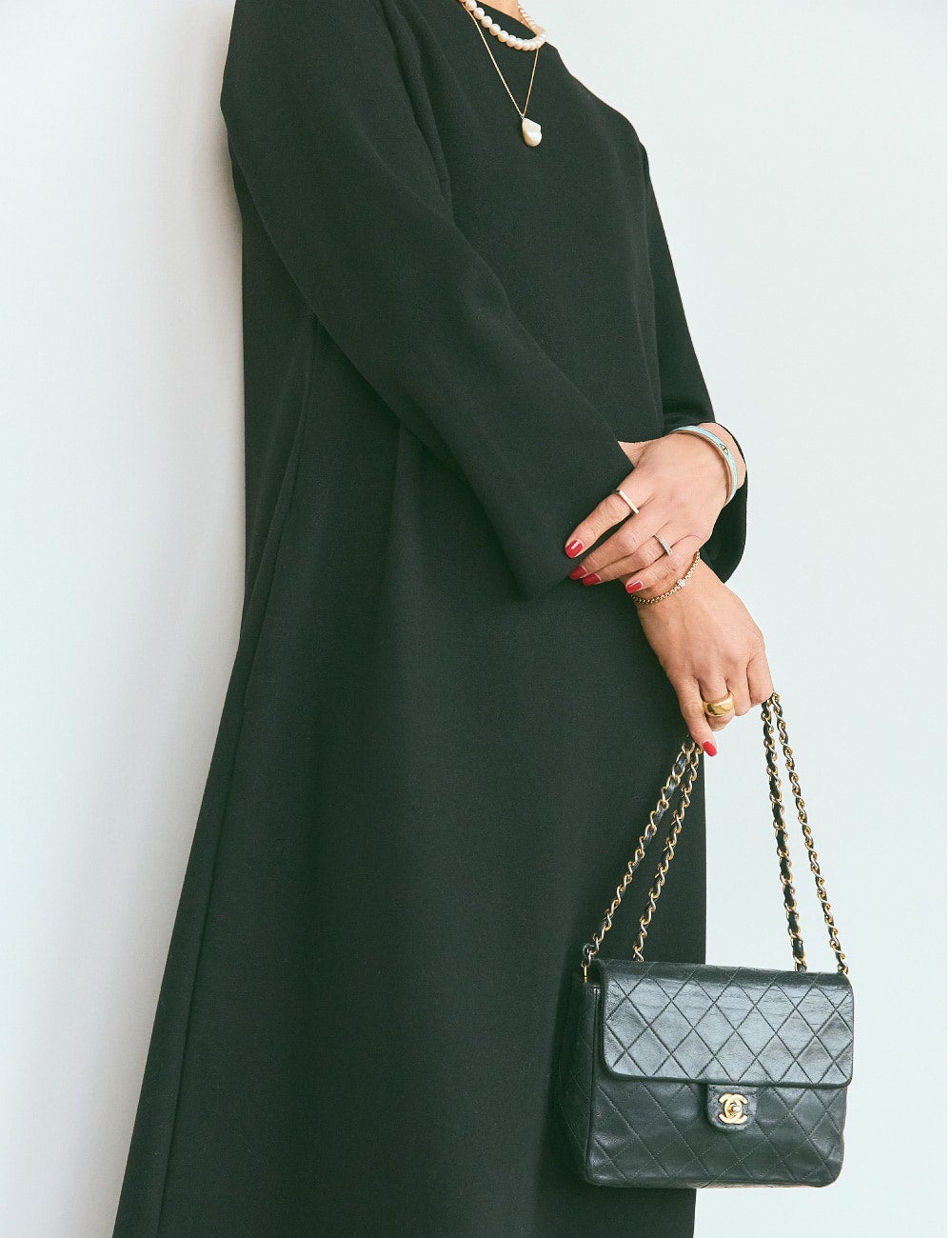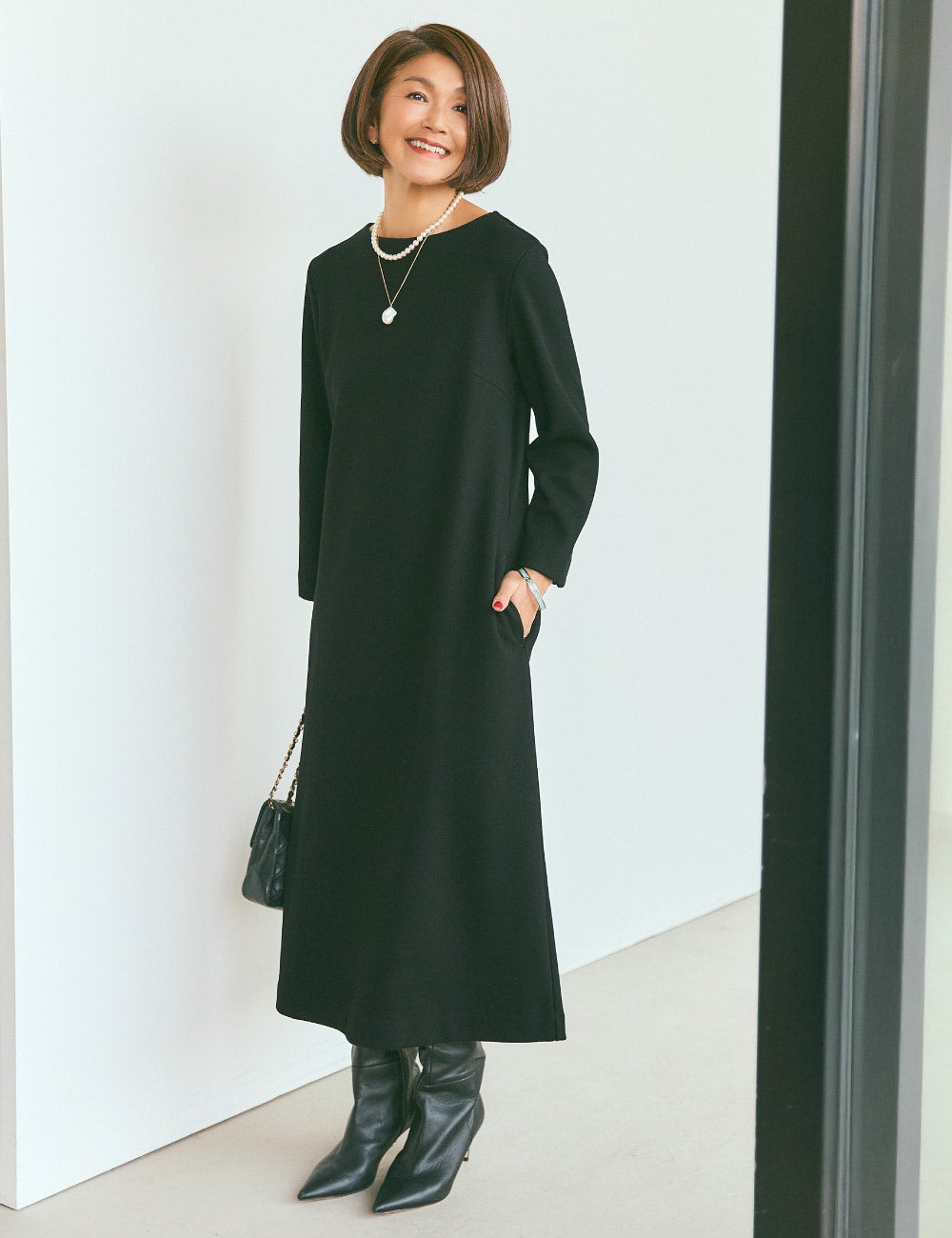 この季節の音楽会や観劇の日に選びたいと思ったのが、こちらのワンピース。上質なウールのような温かみのあるカットソー素材で、自宅で手洗いできるという才色兼備な一枚。ストレスフリーで、長時間座っていてもシワが気にならないのがいいですね。一見とてもシンプルですが、さりげないAラインで袖丈も少し短めでフェミニンな印象に。いつものジュエリーとボリュームのあるロングブーツを合わせて、改まりすぎず私らしく装います。
