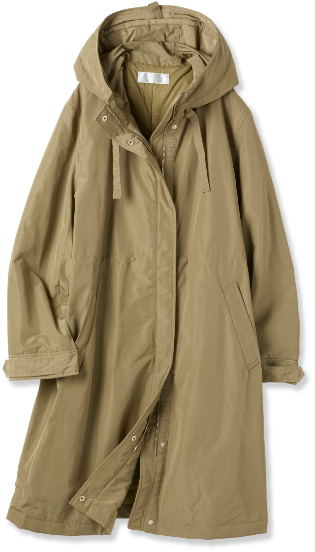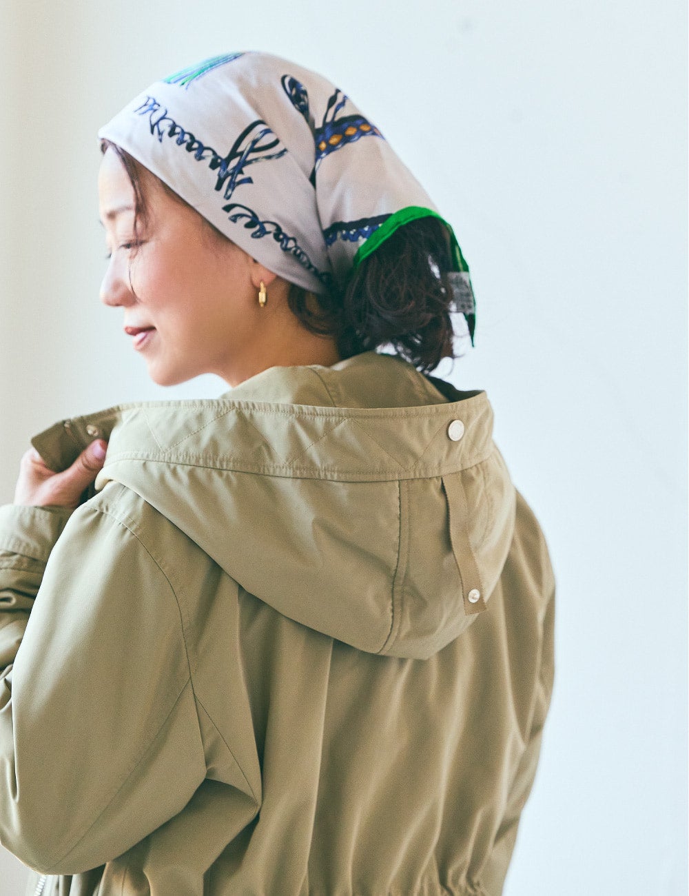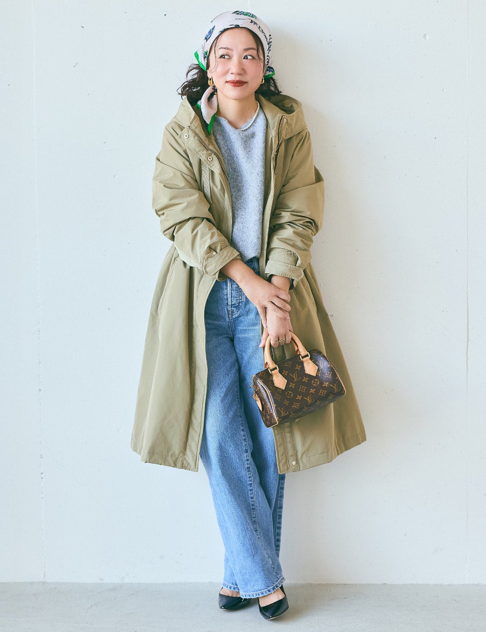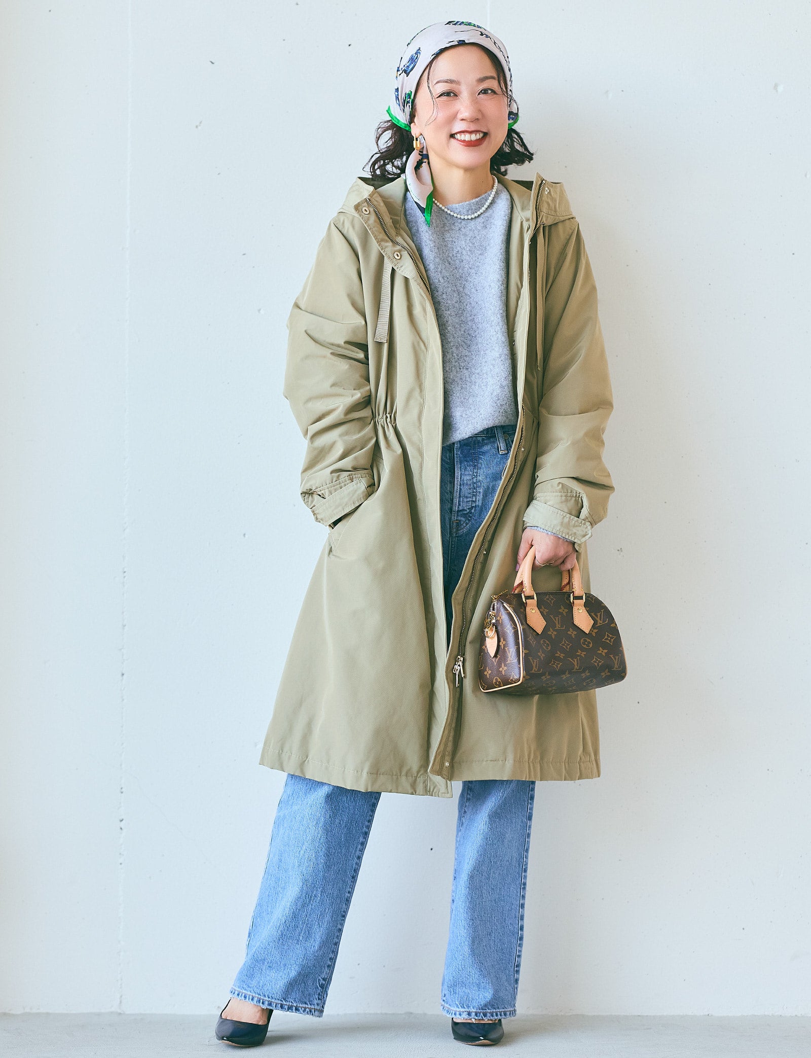 モッズコートの延長で着こなせるこちらのコートは、ミリタリーのものとは一線を画すおしゃれなカーキカラー。グレーのニットとデニムというシンプルなスタイリングに合わせました。うんとカジュアルな組み合わせなので、パールのネックレスや、スカーフのアレンジなど、少し大胆なくらい小物を重ねてもトゥマッチになりません。気の置けない女友達とランチに行く日は、こんなスタイリングで。
