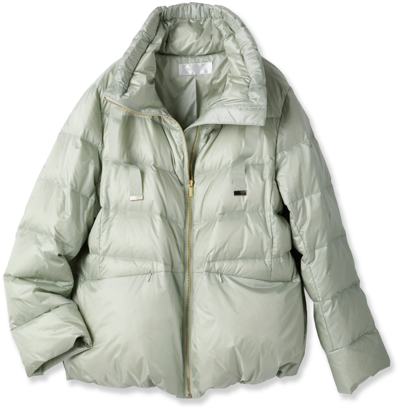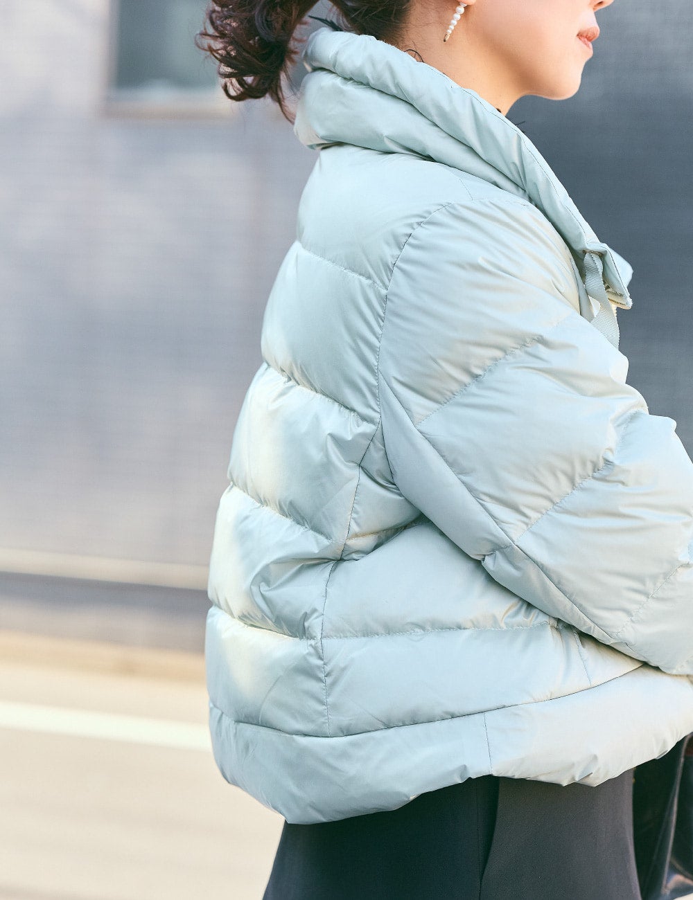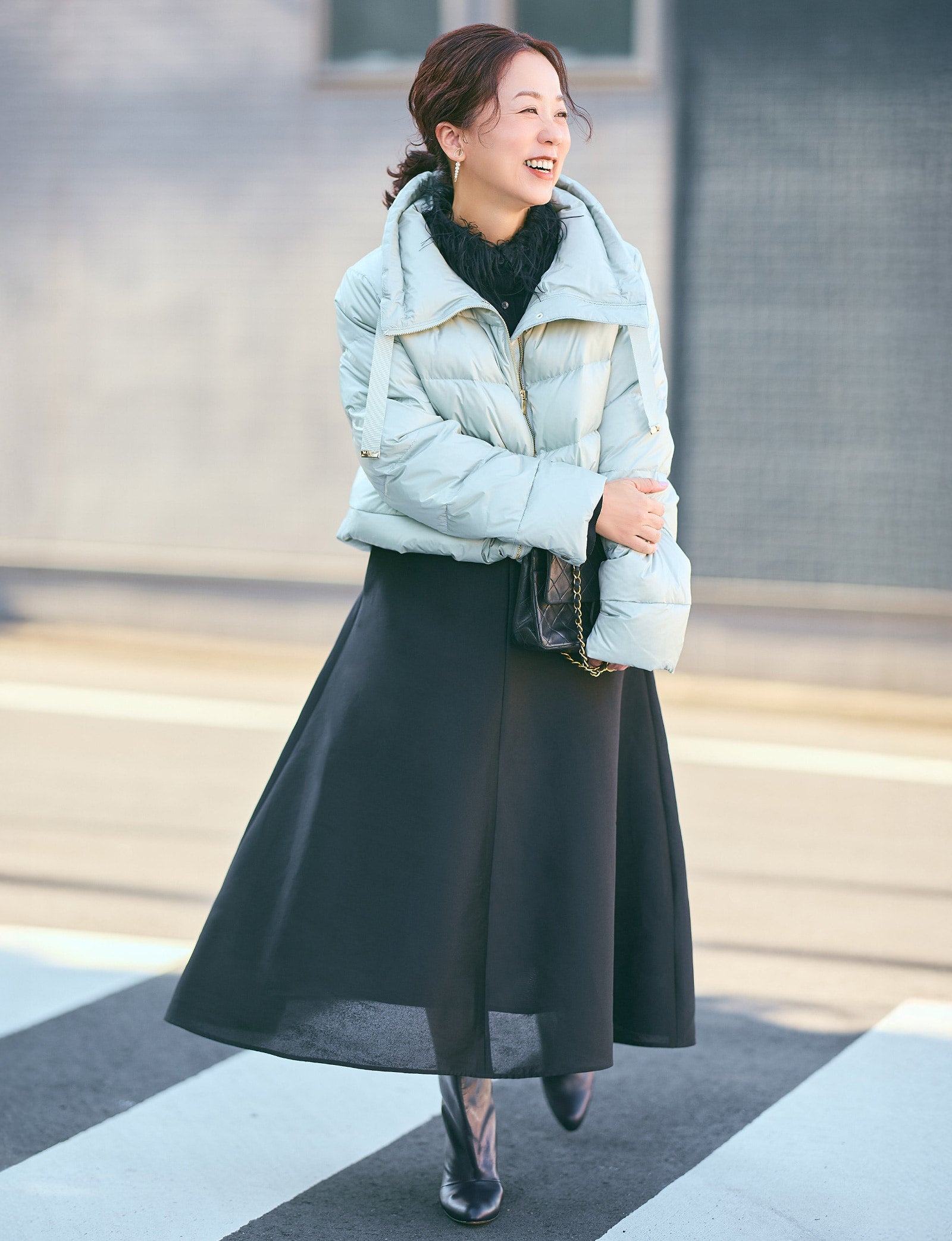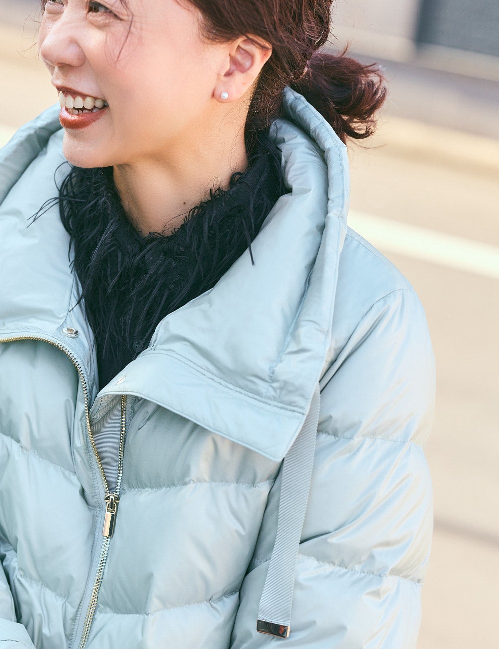 まず目に留まったのはこの珍しいミント系のカラー。ダウンジャケットというと冬のカジュアルアイテムの代表ですが、つややかな素材感や、ディテールも洗練されているこのジャケットだったらドレスアップシーンにもよさそうと、シックな黒の着こなしに合わせてみました。ドレスアップスタイルの時って、合わせるアウターに悩むという声も意外と多いのですが、寒さ対策も万全。華やかなパーティーシーンにもぴったりですね。