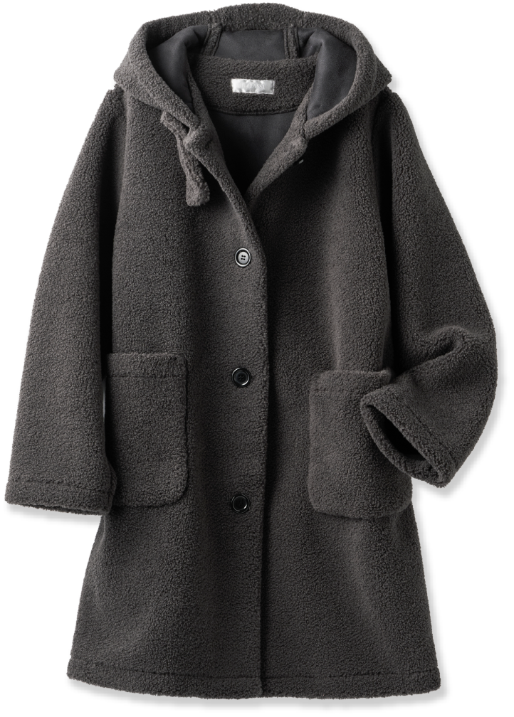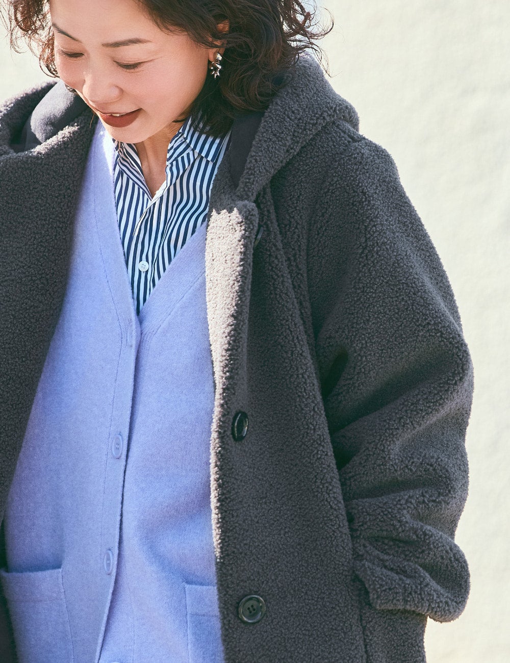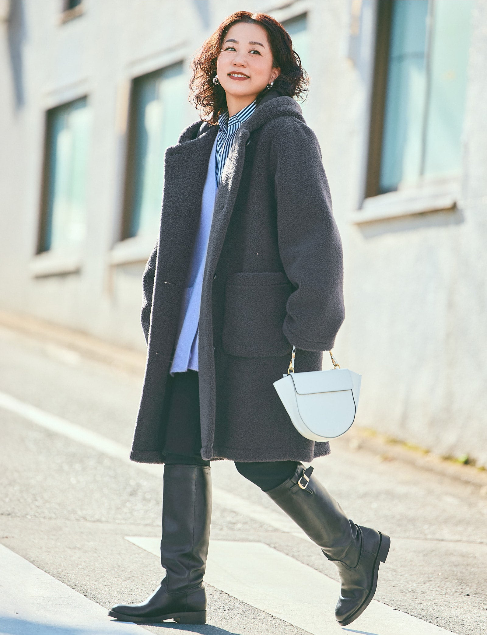 ボアの可愛らしい風合いが大好きです。フードもあってカジュアルなデザインなのですが、落ち着いたトーンのグレーも品がよくて、大人の着こなしにマッチします。インしたカーディガンは美しい発色のパープル、柔らかな風合いも気に入りました。ストライプのシャツをインすると、全身にメリハリをもたらしてくれます。ロングブーツで全身のバランスをスタイリッシュに整えて。