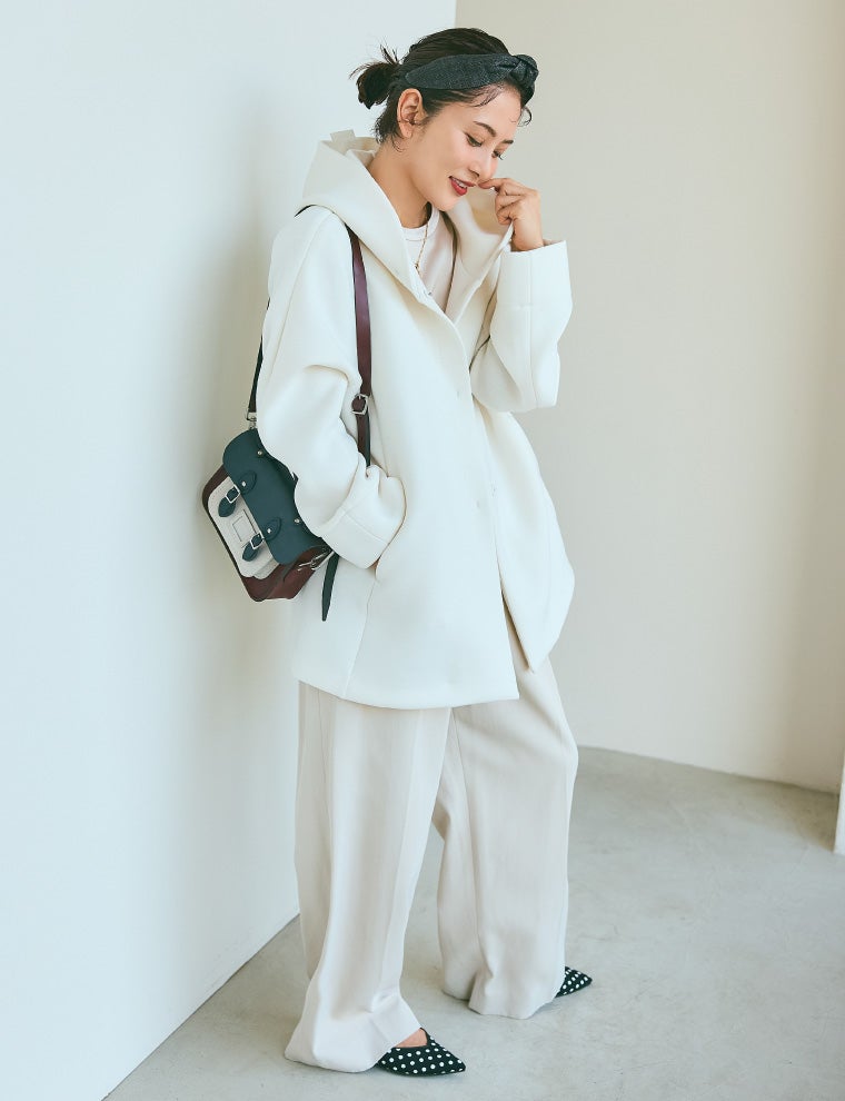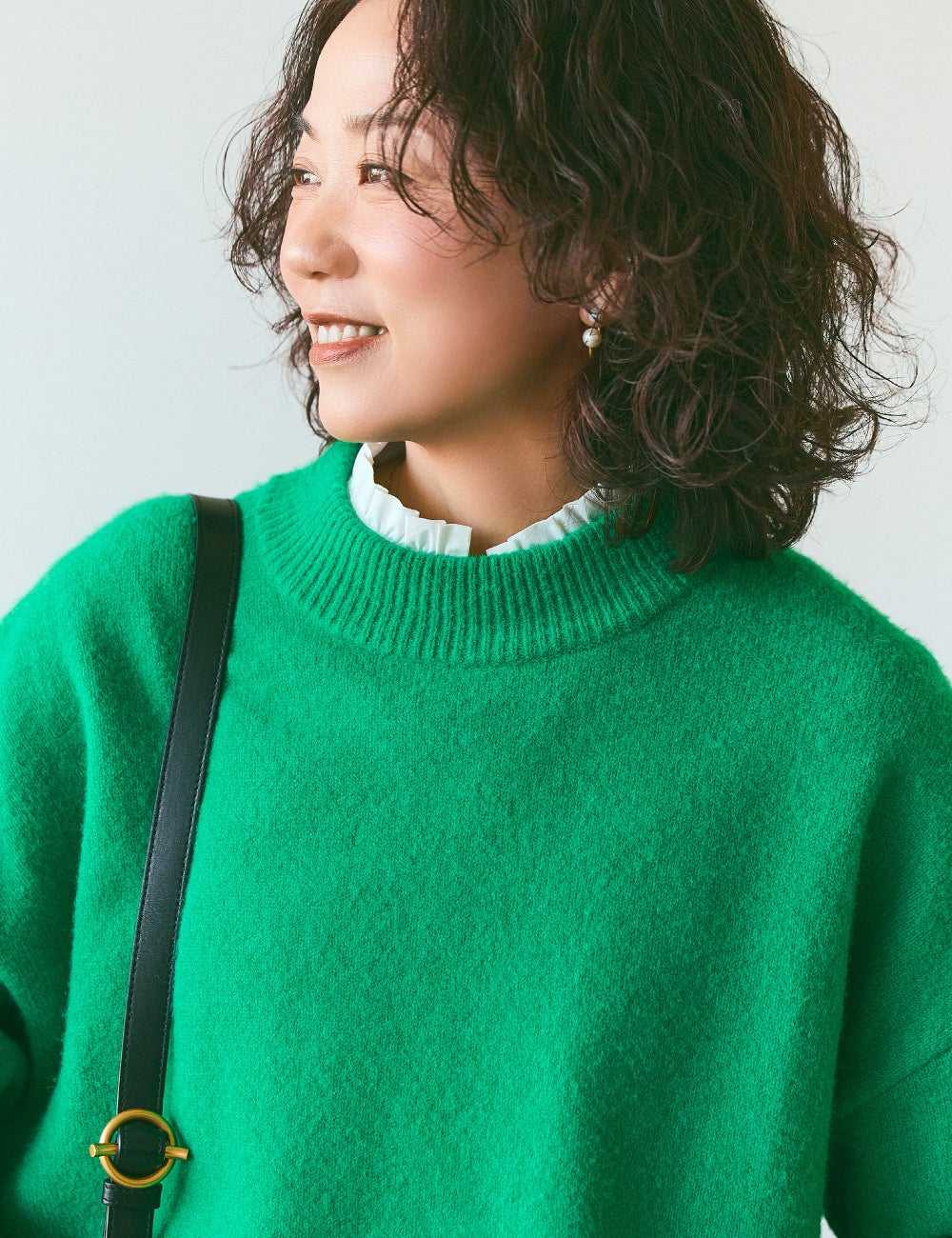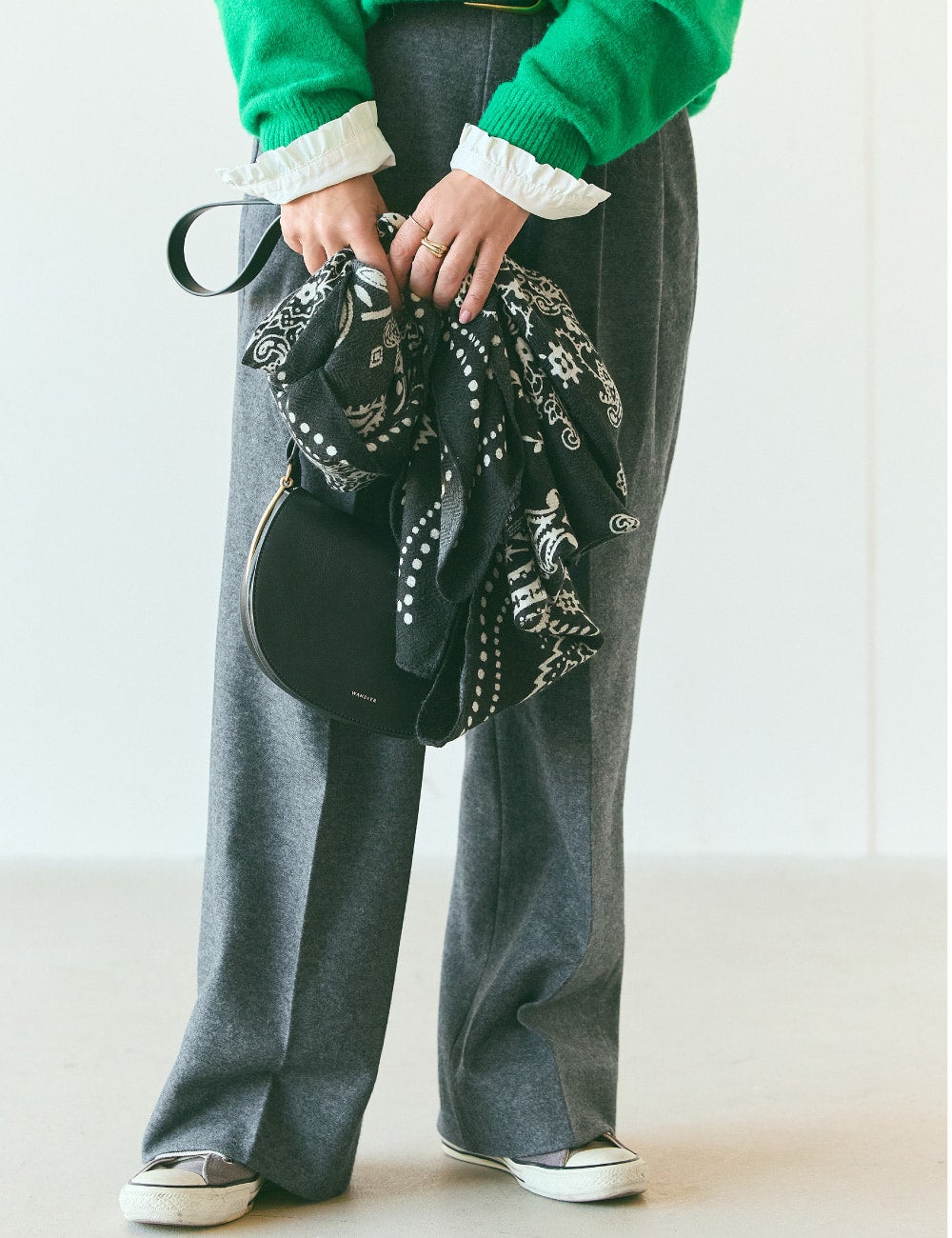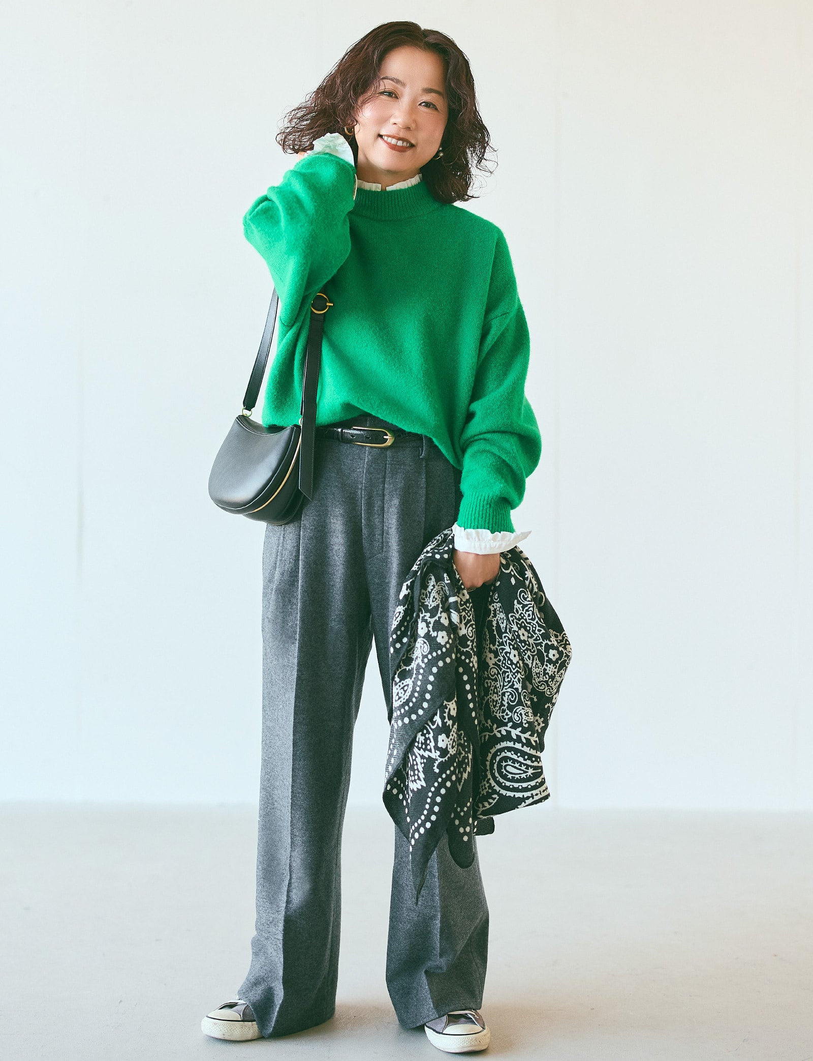 グリーンは大好きな色。明度の高いはっきりしたカラーが気に入りました。冬のおしゃれってつい重たくなりがちなので、こういう鮮やかな色に惹かれます。ふんわりとした風合いと、ゆったりとしたサイズ感もこなれた雰囲気で、今っぽく着こなせるのもいいですよね。甘めなフリルのブラウスを覗かせて、パンツはマニッシュなグレーできれいめに。黒いレザーのバッグとベルトできちんと感を加えます。