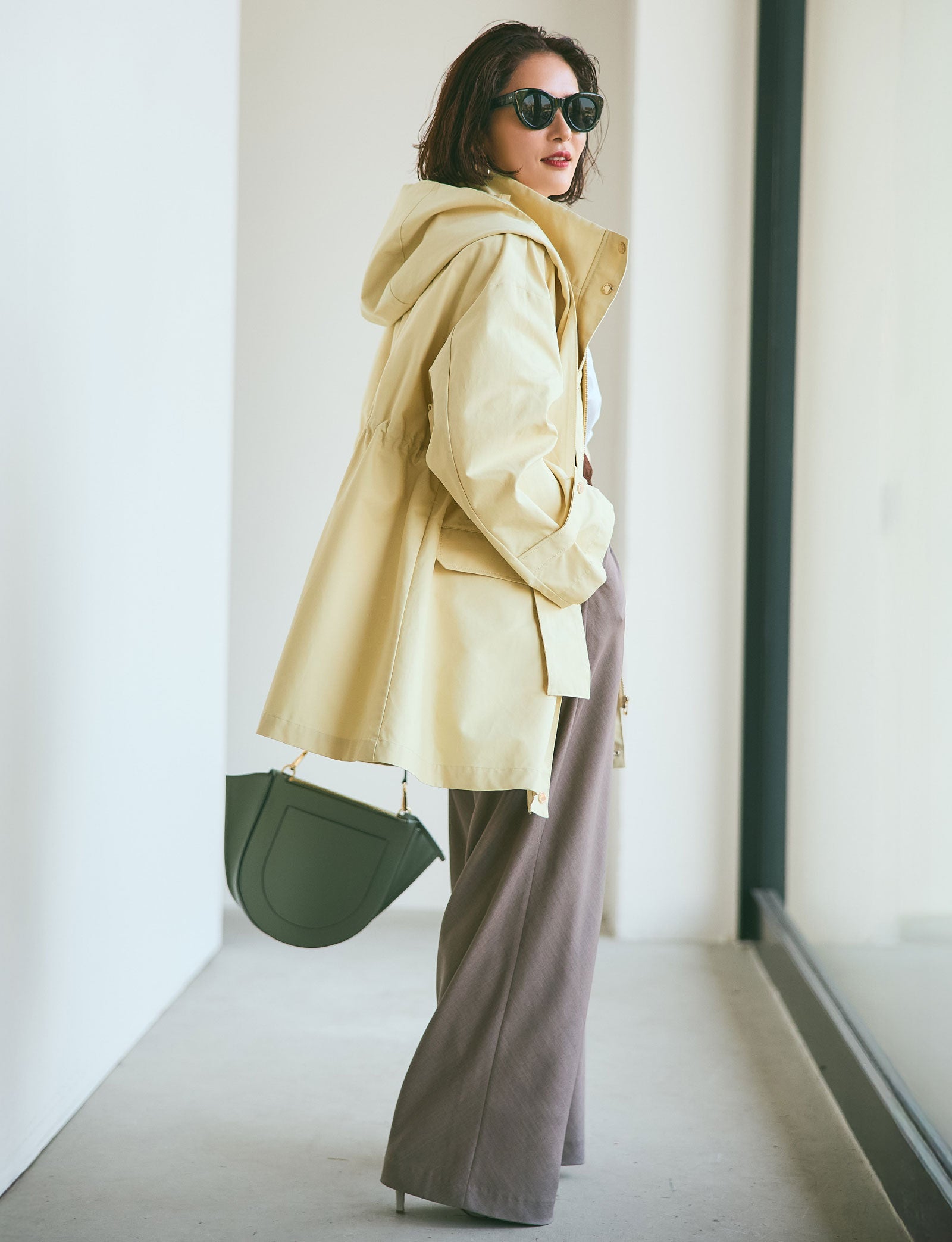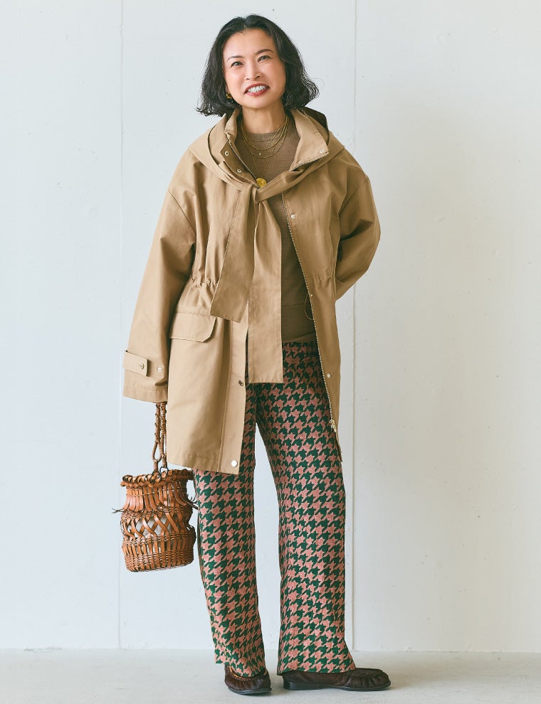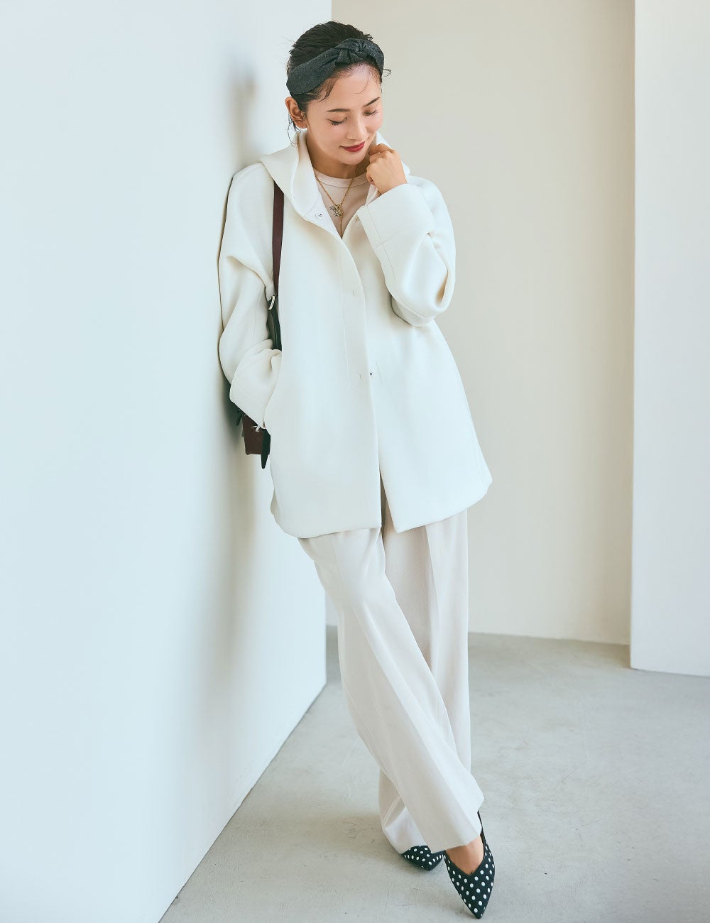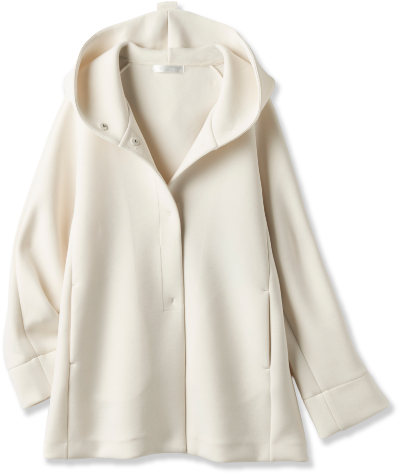 素敵だなと思う女性は、後ろ姿もサマになって、遠くにいても存在美を放つ人。まろやかな白のこのアウターは、フードまで立体的で全方位絵になるシルエット。シンプルですが、佇まいがドラマティックになるようで気に入りました。着心地も軽くてノンストレスなのに、カジュアルに傾きすぎないのも私にはちょうどよくて。光沢素材のトップスとパンツは、ホワイトに近い明度の高いベージュを。インパクトのある小物をあしらって、柔らかい配色をピリッと引き締めます。