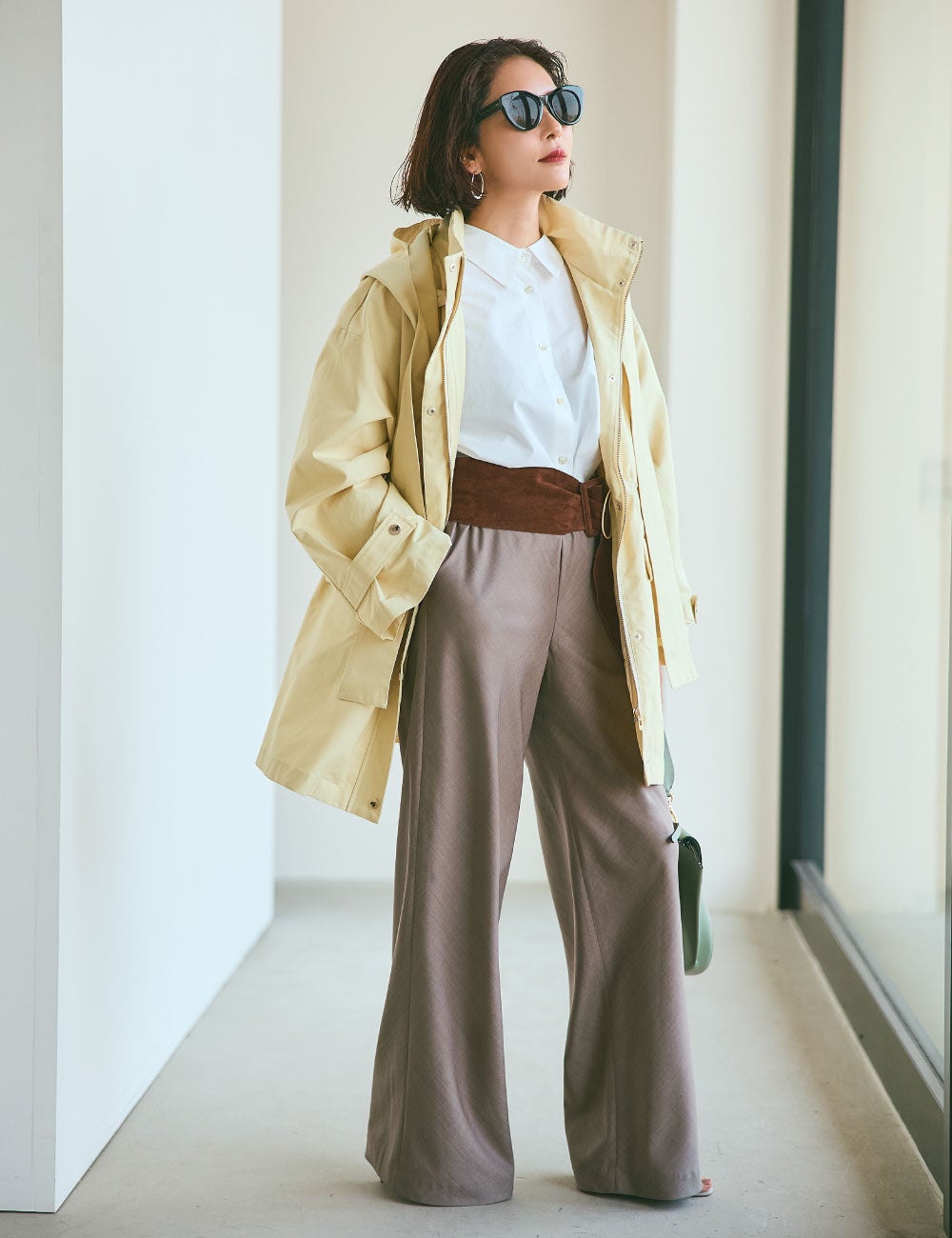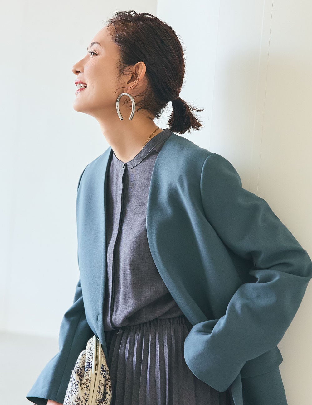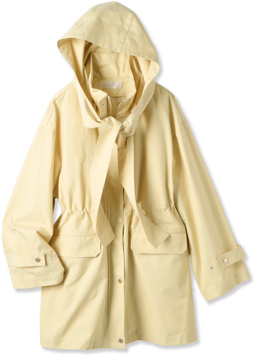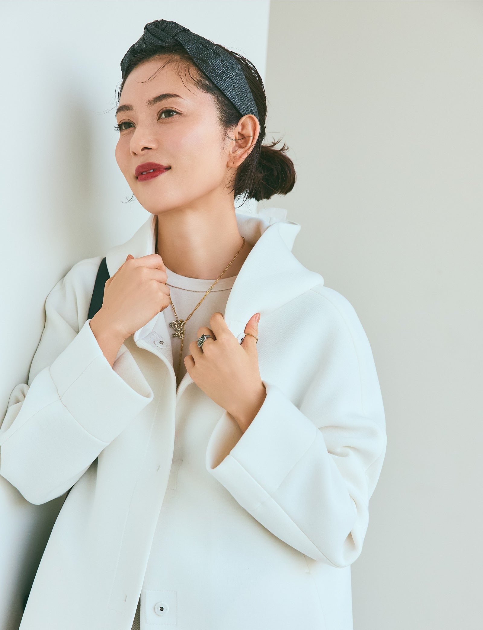 素敵だなと思う女性は、後ろ姿もサマになって、遠くにいても存在美を放つ人。まろやかな白のこのアウターは、フードまで立体的で全方位絵になるシルエット。シンプルですが、佇まいがドラマティックになるようで気に入りました。着心地も軽くてノンストレスなのに、カジュアルに傾きすぎないのも私にはちょうどよくて。光沢素材のトップスとパンツは、ホワイトに近い明度の高いベージュを。インパクトのある小物をあしらって、柔らかい配色をピリッと引き締めます。