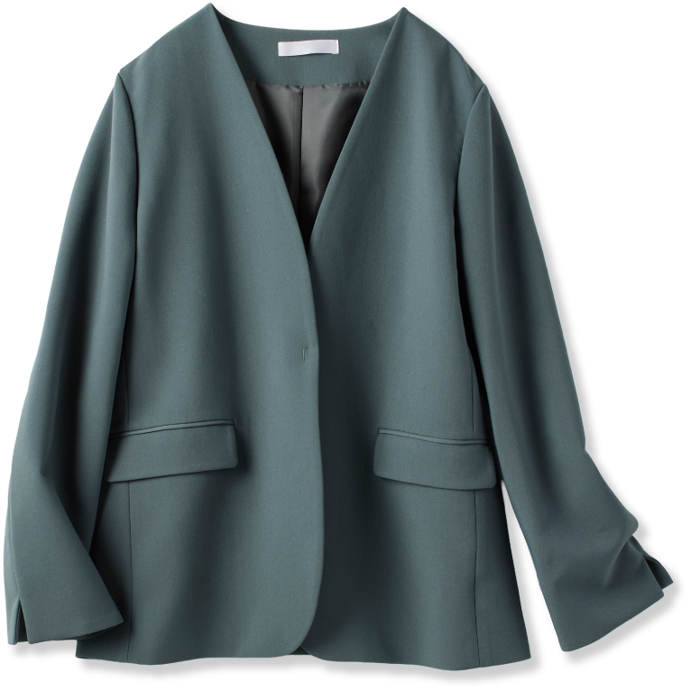 くすんだ印象のブルーは、どこかにグリーンも感じさせる洗練されたあいまいカラー。パステルカラーとはひと味異なりますが、私にとってはこちらも春を感じる色。グレーのワンピースとは、色も、ノーカラーのすっきりとしたデザインも、ぴったり。すんなりと手を繋いでくれます。袖を通してみると、さらりとした着心地でとっても軽やか。カーディガン感覚で取り入れられるのも魅力ですね。