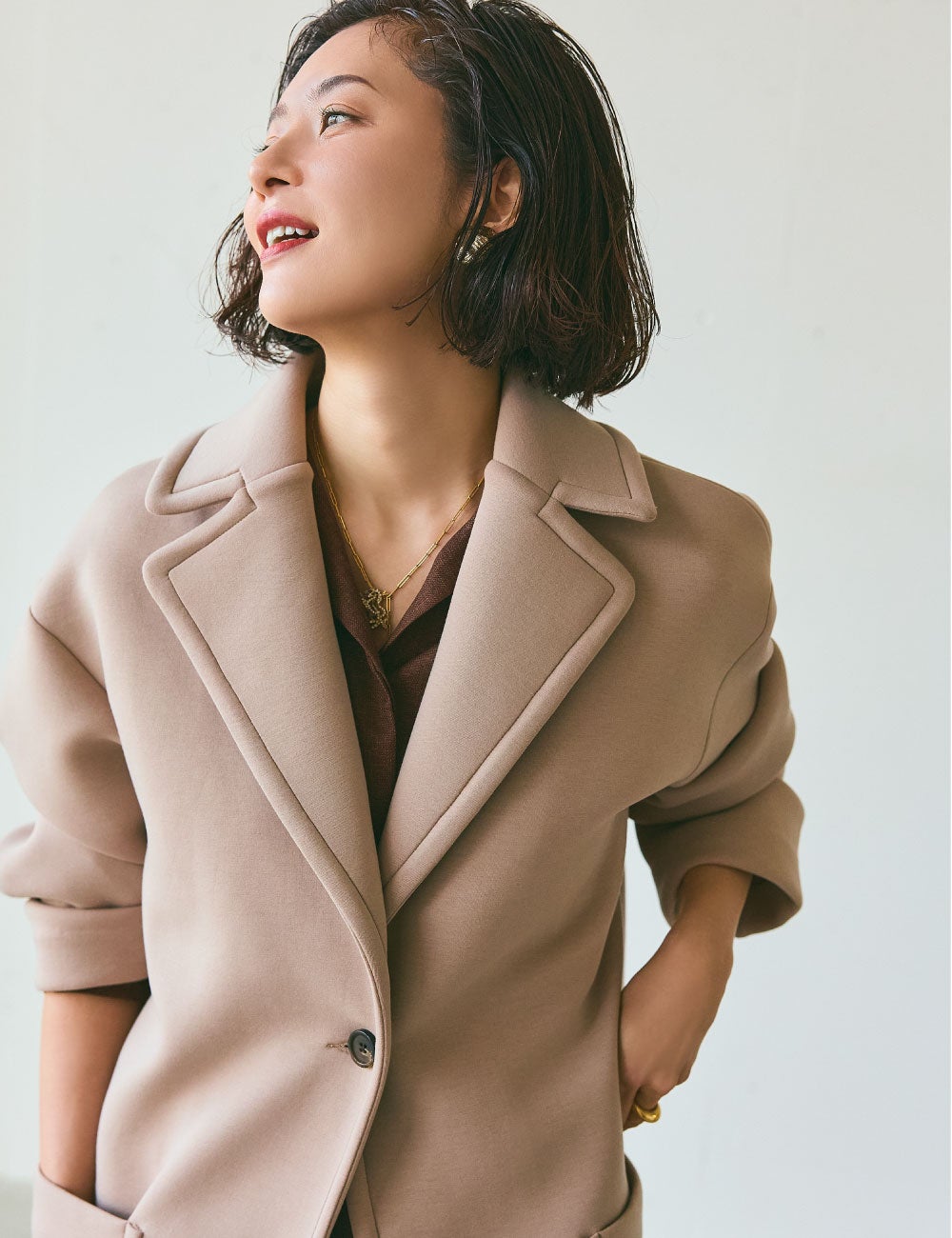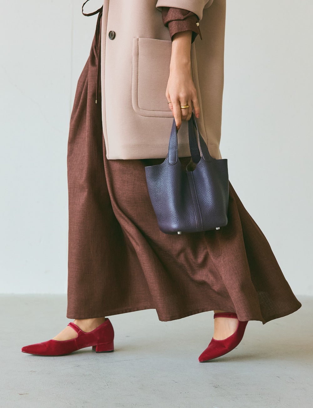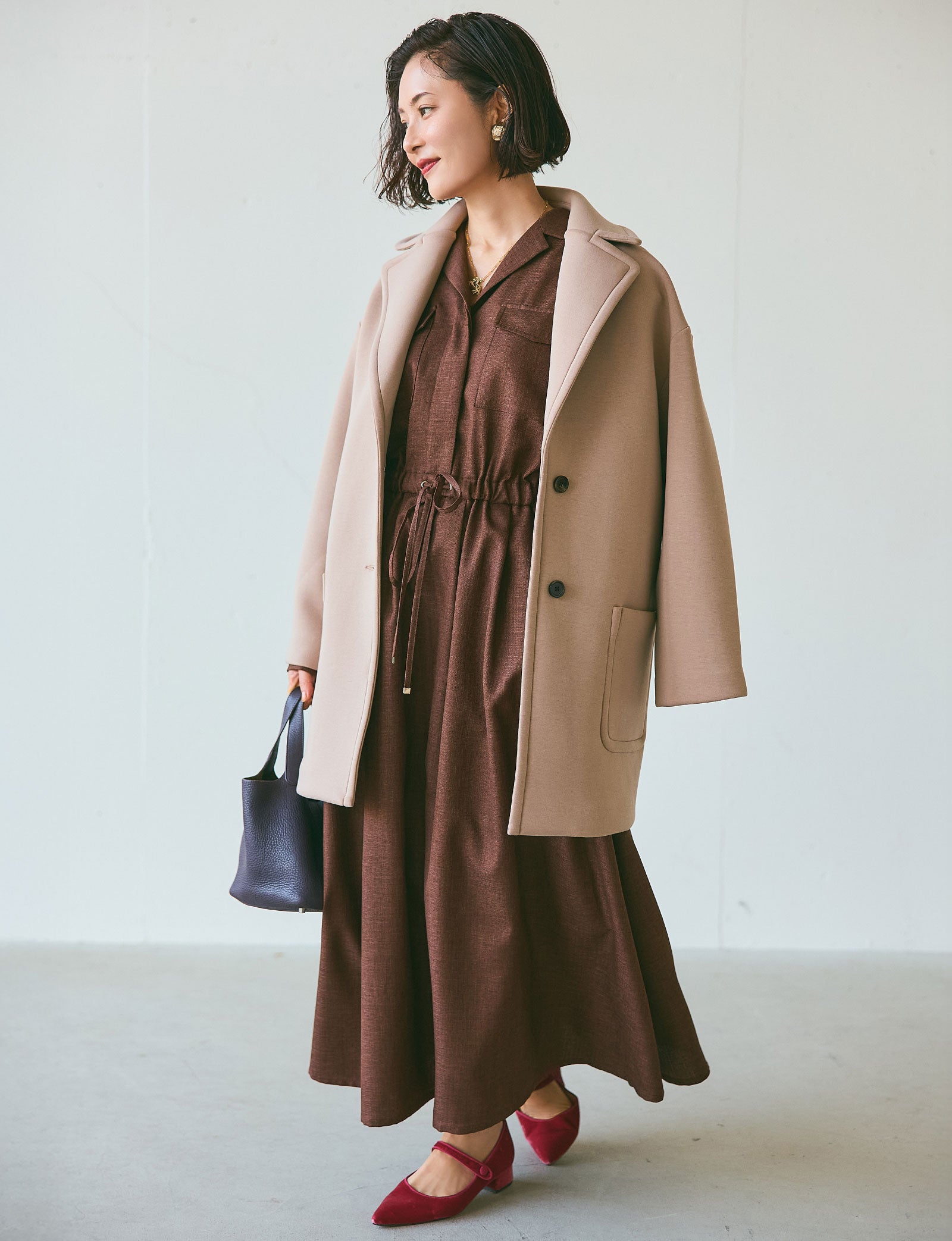 軽くてハリのあるポンチ素材のジャケット風のアウターも、ほんのりと甘やかなベージュに惹かれました。ビターなブラウンの優雅なワンピースのアウトラインにしたら、ほどよく今のムードと上品なメリハリが。この配色だったらと、深いパープルのバッグとベルベットのピンクのメリージェーンで、シックなカラーパレットを楽しんでみました。ボタンを止めたり、外したり。合わせるスタイリングによっては、ベルトをあしらってシルエットをアレンジしたり、幅広い着こなしに対応してくれそうです。