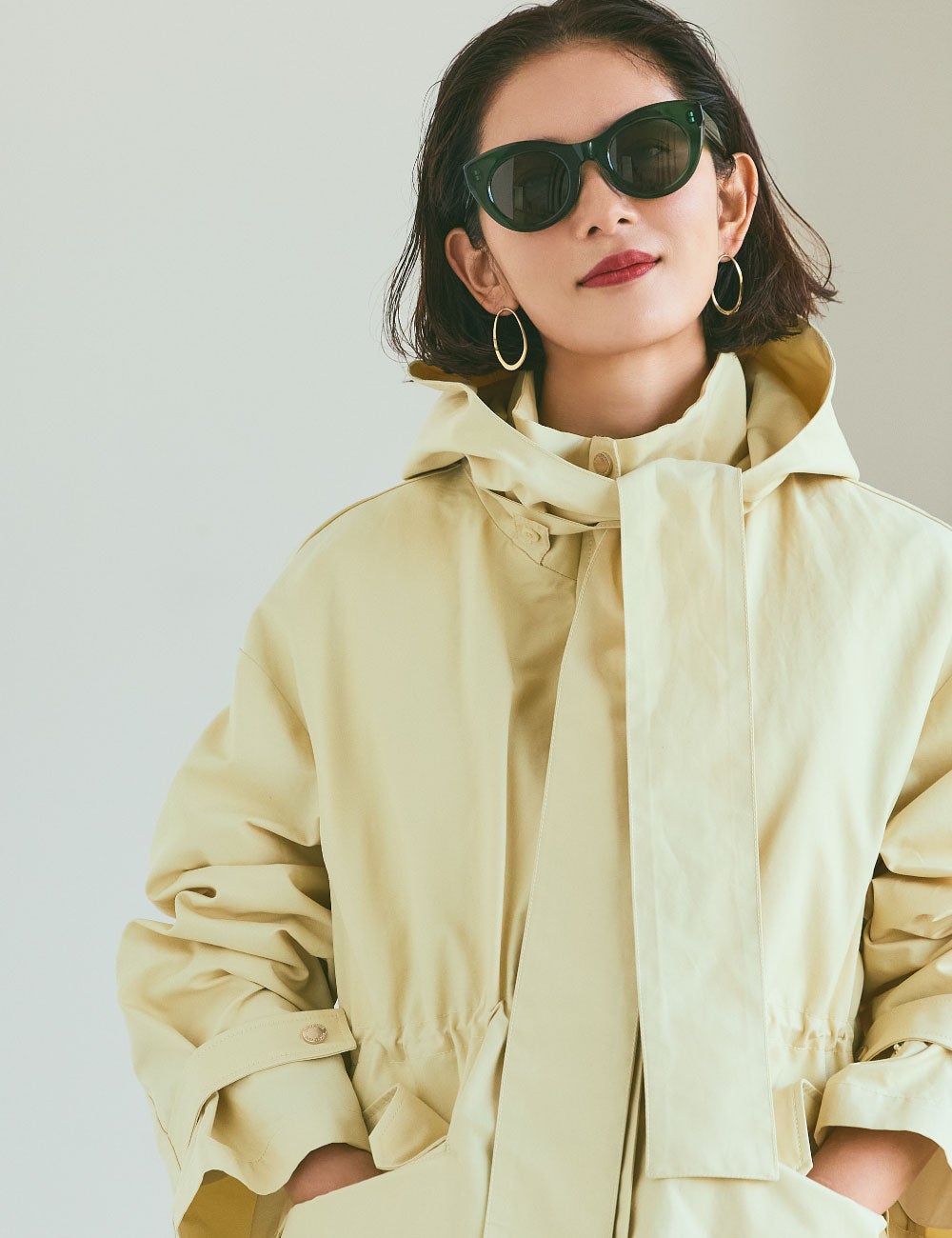 ぱっと視線に飛び込んできたのが、こちらのブルゾン。春一番に選びたいカジュアルなアウターこそ、ベーシックカラーではなく、華のあるきれい色一択です。真っ白なブラウスも、襟元のデザインがどこかクラシック。ニュアンスベージュのパンツにはスエードのベルトを。サングラスもエッジの効いたデザインで・・・、とそこかしこにエレガントなムードを加えて、私らしくカジュアルスタイルをクラスアップさせます。
