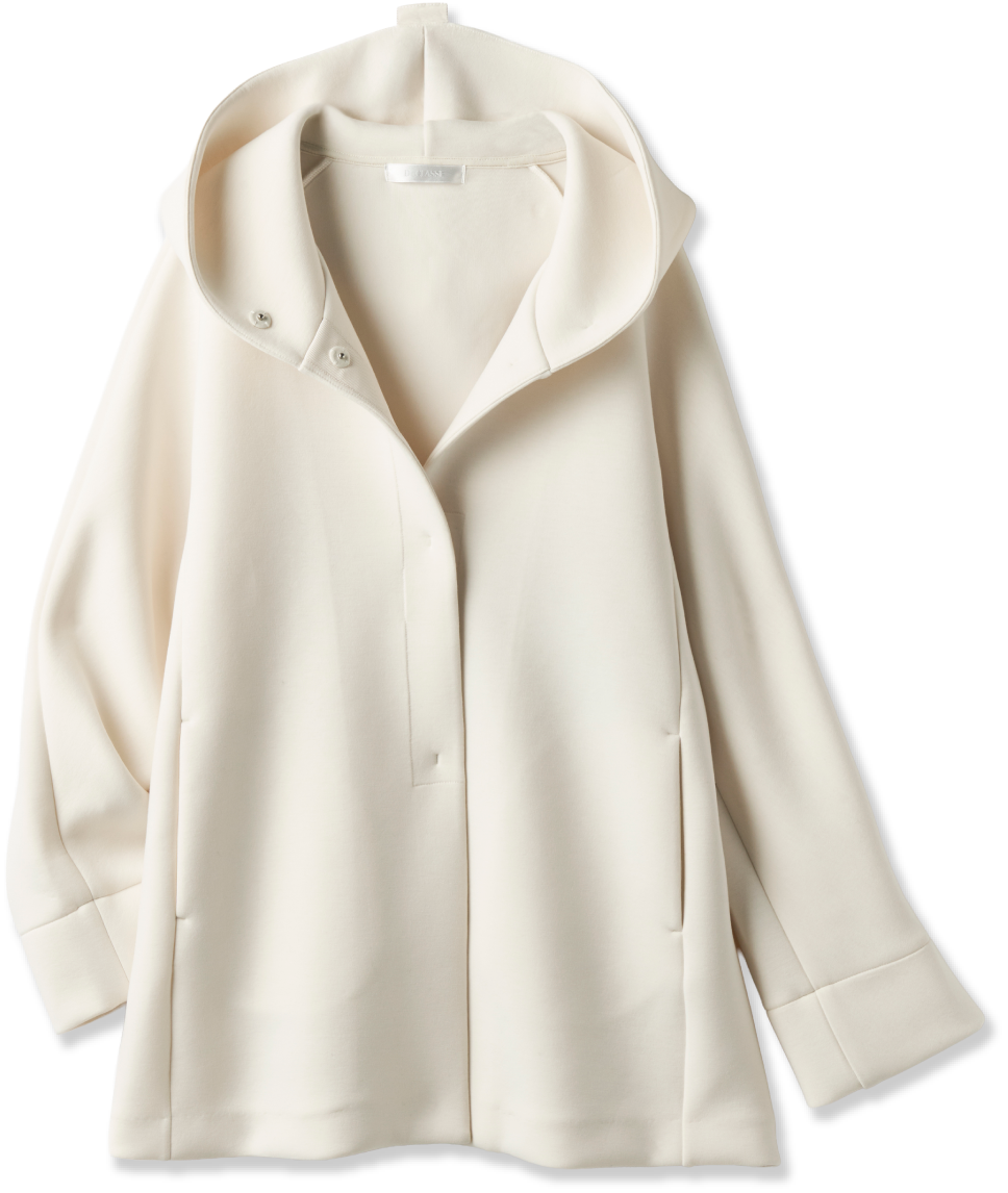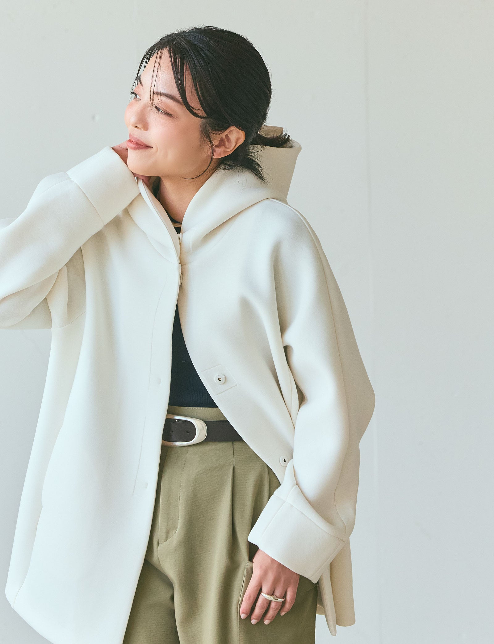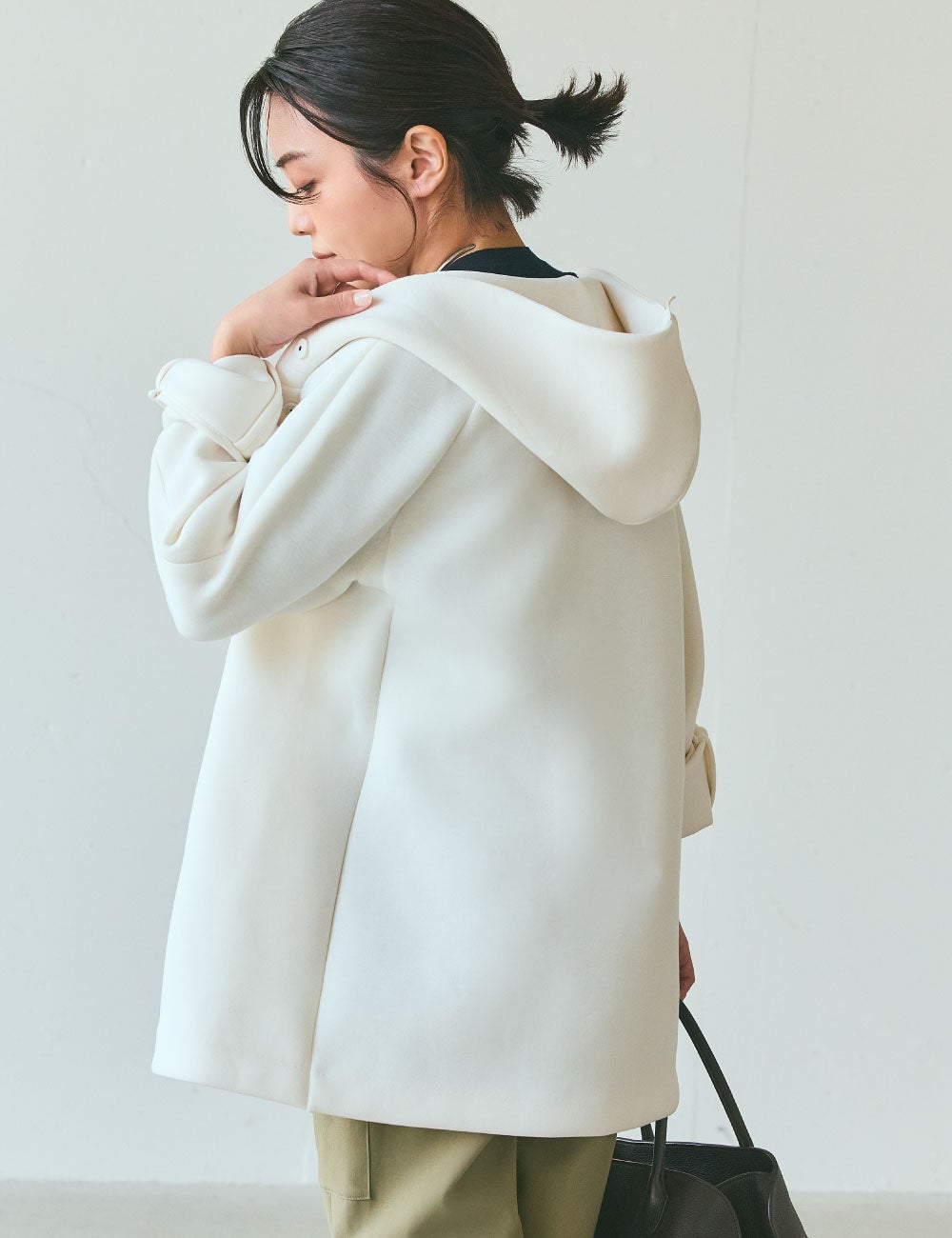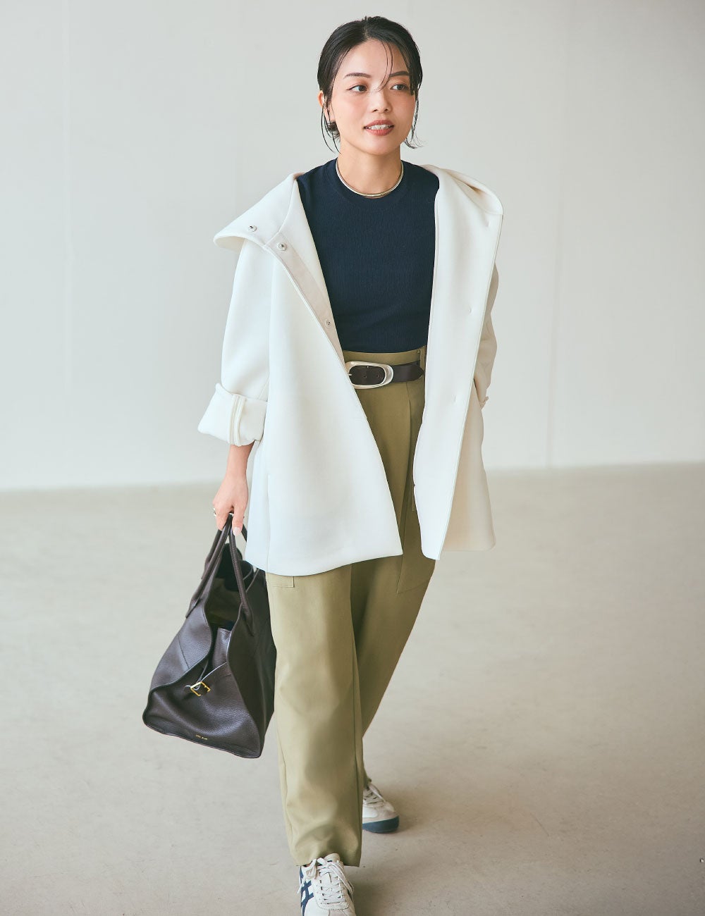 春先のカジュアルスタイルって、ついシンプルになりがち。こちらのアウターは、ハリとボリュームがあって、このほどよい主役感が気に入りました。何よりもいいのは、このホワイト。エレガントになりすぎず、装いを明るく引き立たせてくれます。全身は少しタイトめのスタイリングで。ネイビーのニットとカーキのパンツ、そして焦茶色のバッグ。あえて黒を使わないコーディネートで上品にまとめてみました。