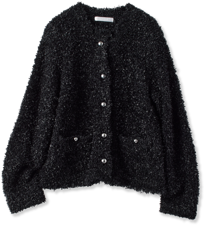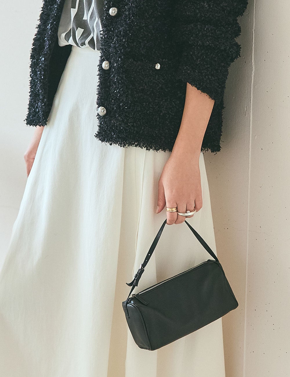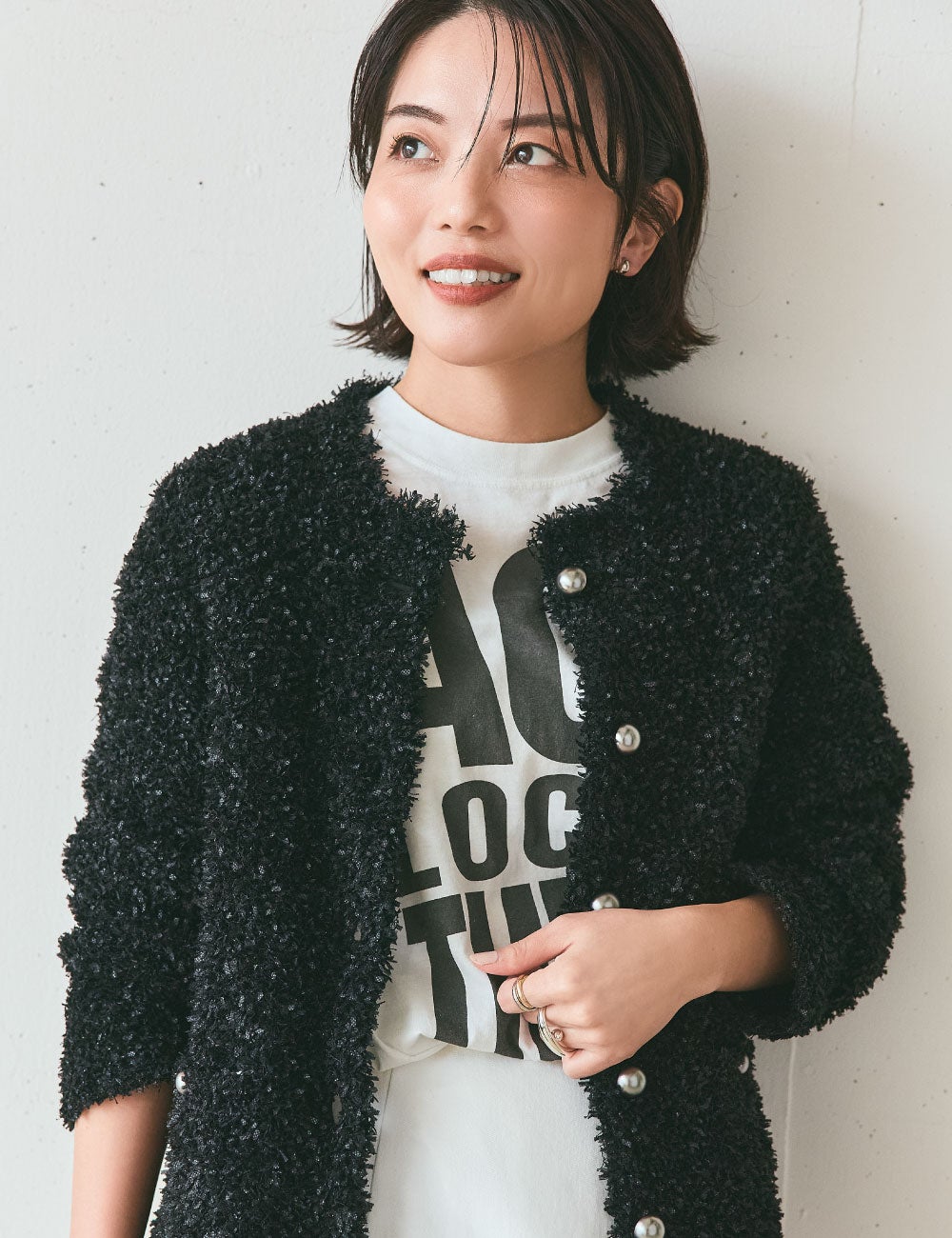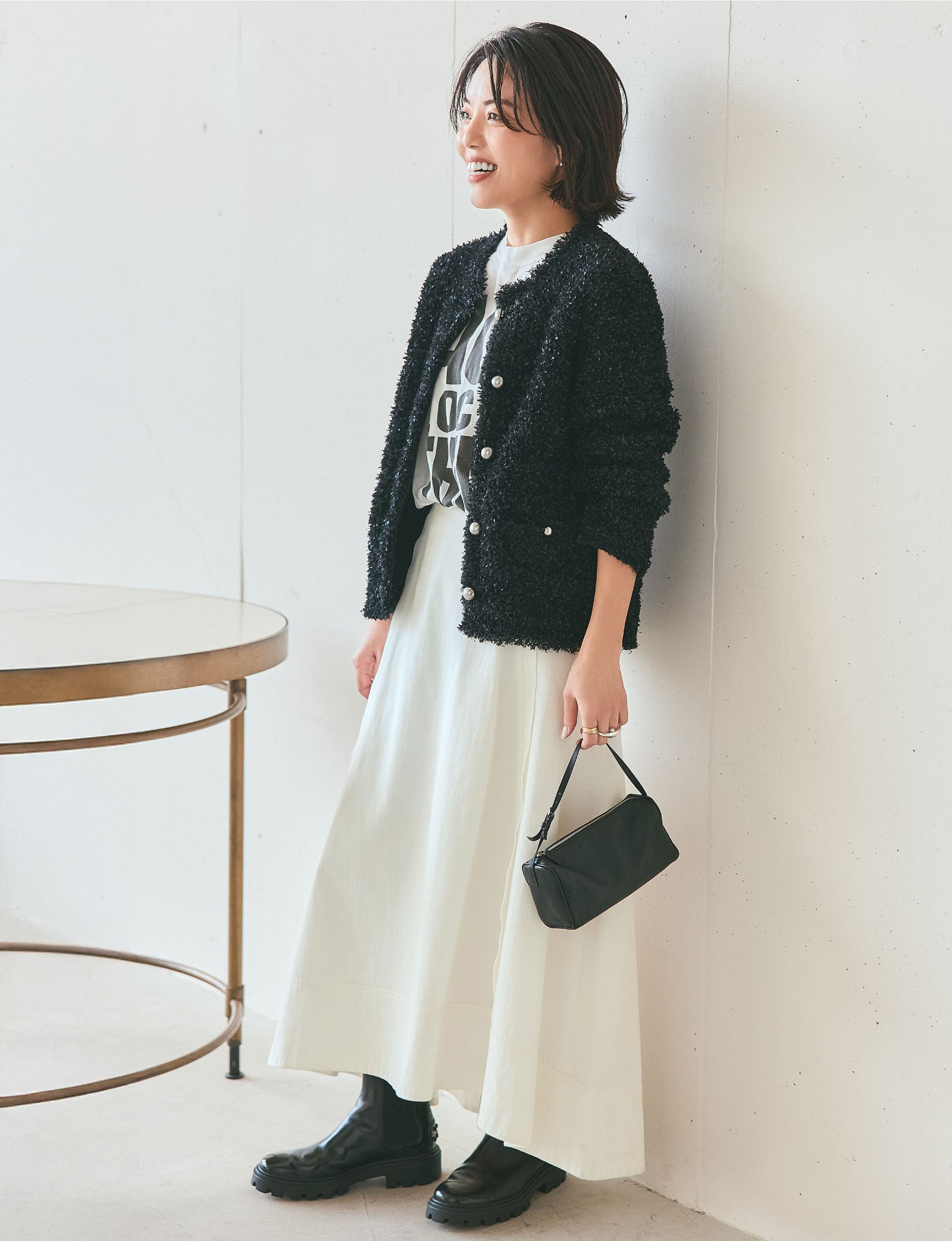 ツイードジャケットのようにも見えるシャギーニットのカーディガンは、マットなシルバーボタンもアクセントになって、華やかだけれどモードっぽくも着こなせる一着。甘くなりすぎず、ジャケットよりも取り入れやすいのもポイントです。全身は白と黒ですっきりと。柔らかなニットを引き立てるように、スカートはハリ感のあるものを。モノトーンのロゴTは、ほどよくインパクトがあって着こなしにメリハリを加えてくれるのでおすすめです。