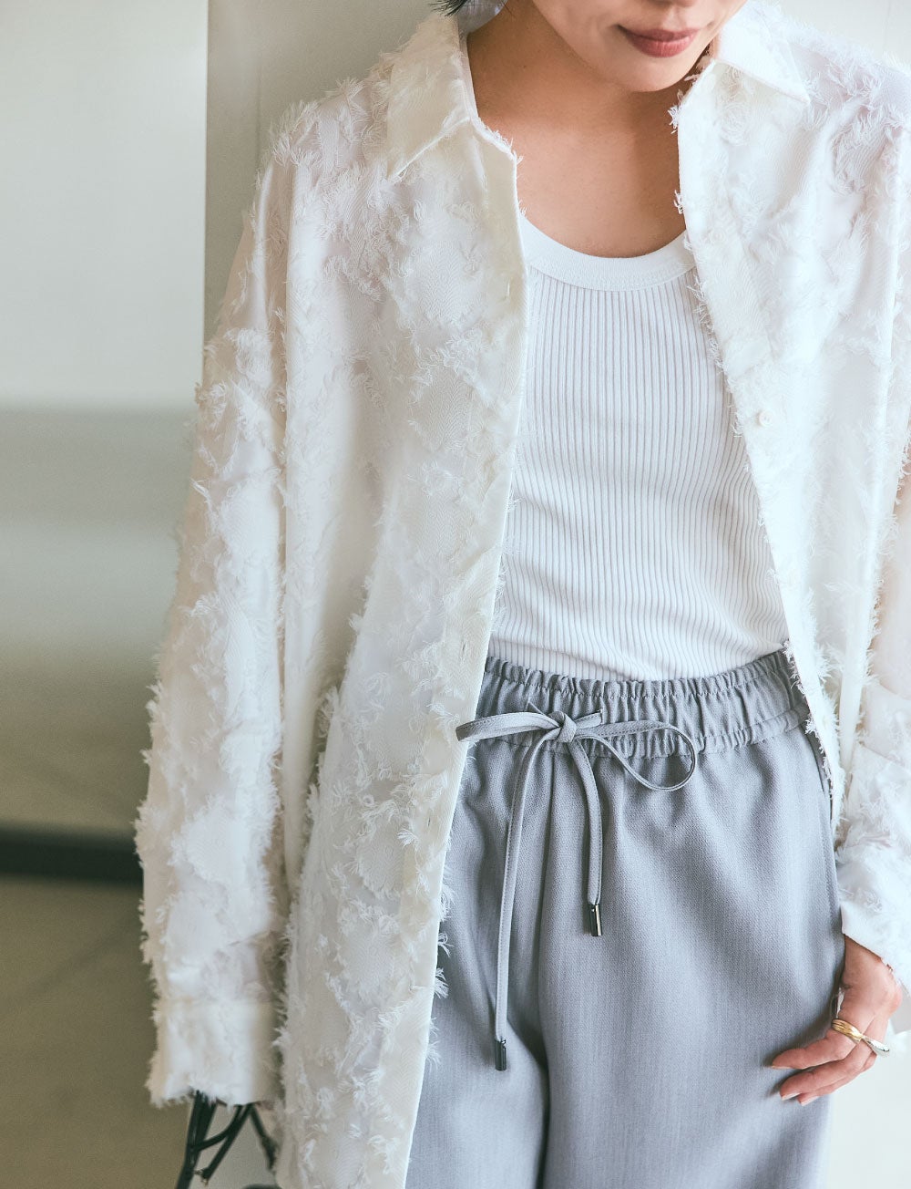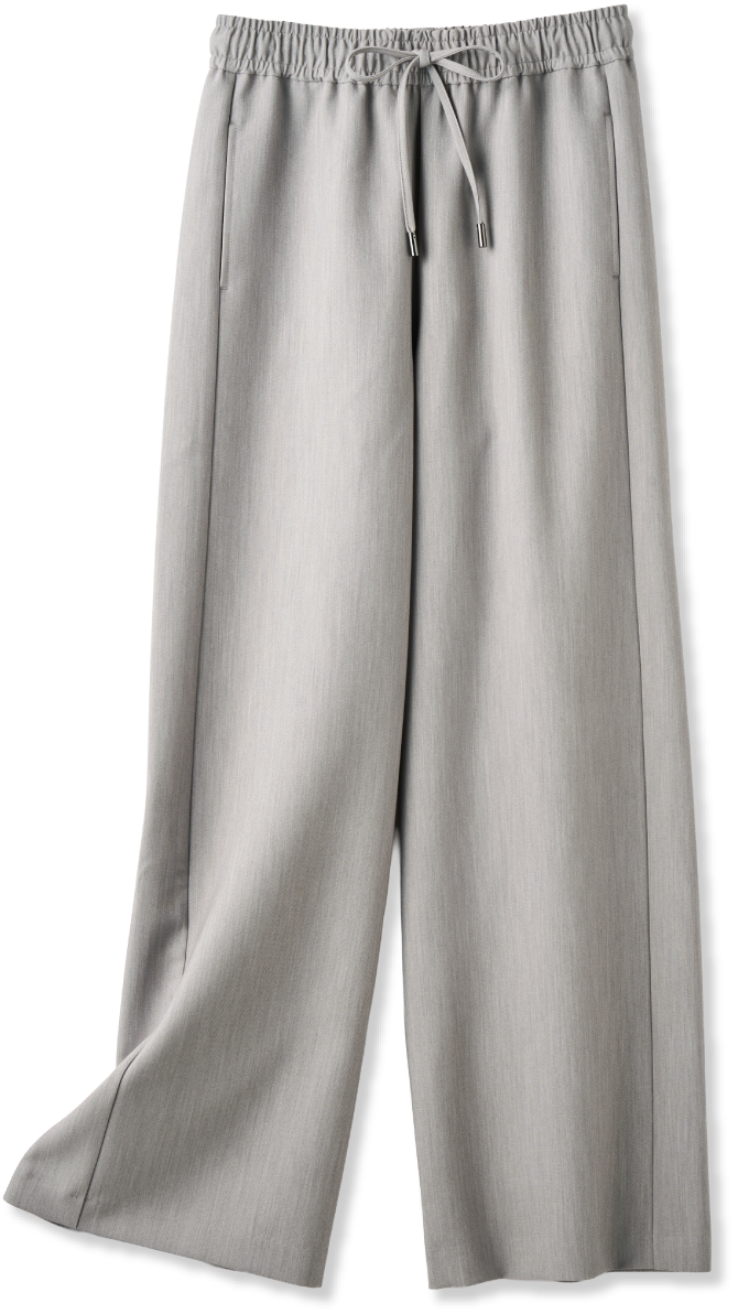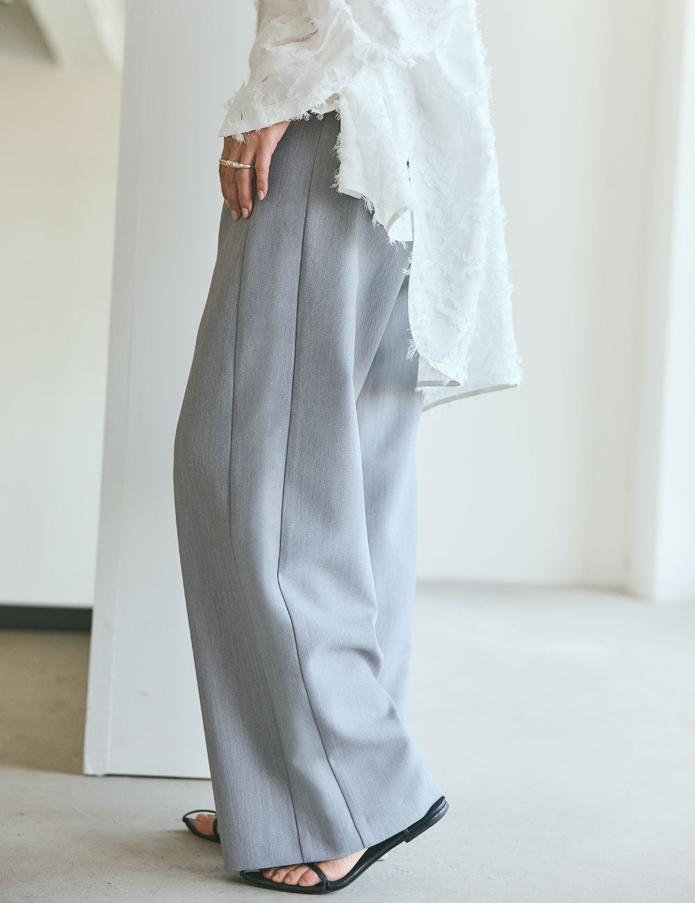 休日の着こなしをイメージして選んだのは、明度の高いグレーのパンツ。リラックス感があるのに砕けすぎず、大人っぽく仕上げてくれるので、私には欠かせない存在です。こちらのパンツは、ゆるっとしたシルエットで、ほどよくハリのある素材感が気に入りました。側章のような切り替えのアクセントがあって、サイドスタイルも絵になるのもいいですよね。デザインのある白シャツをアウターのようにサラッと合わせて、さらに少し都会的な小物で辛口に。