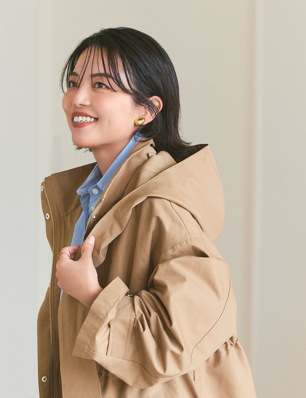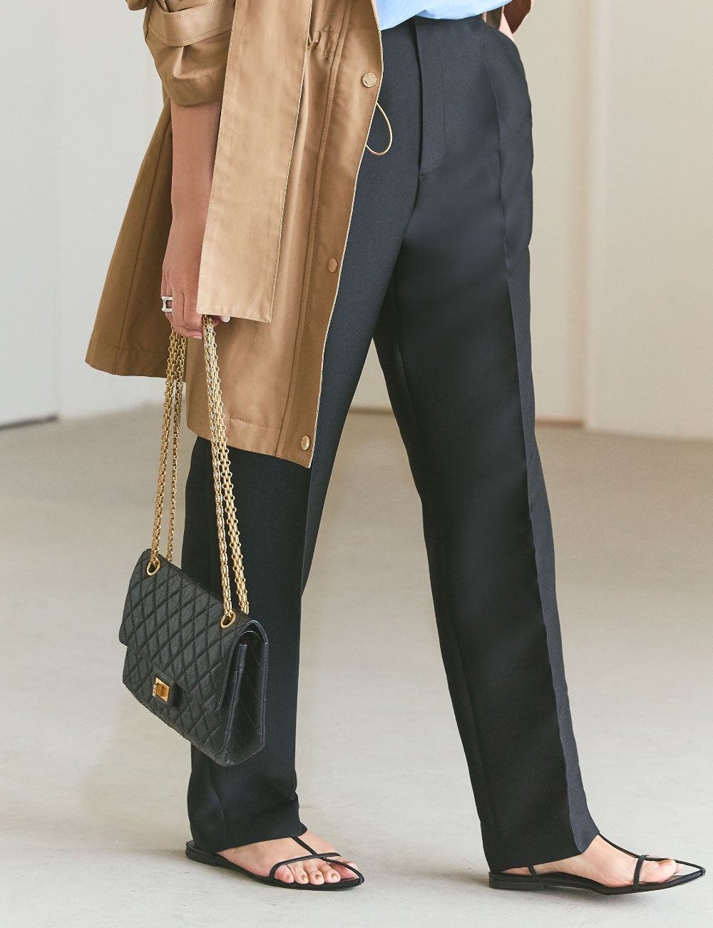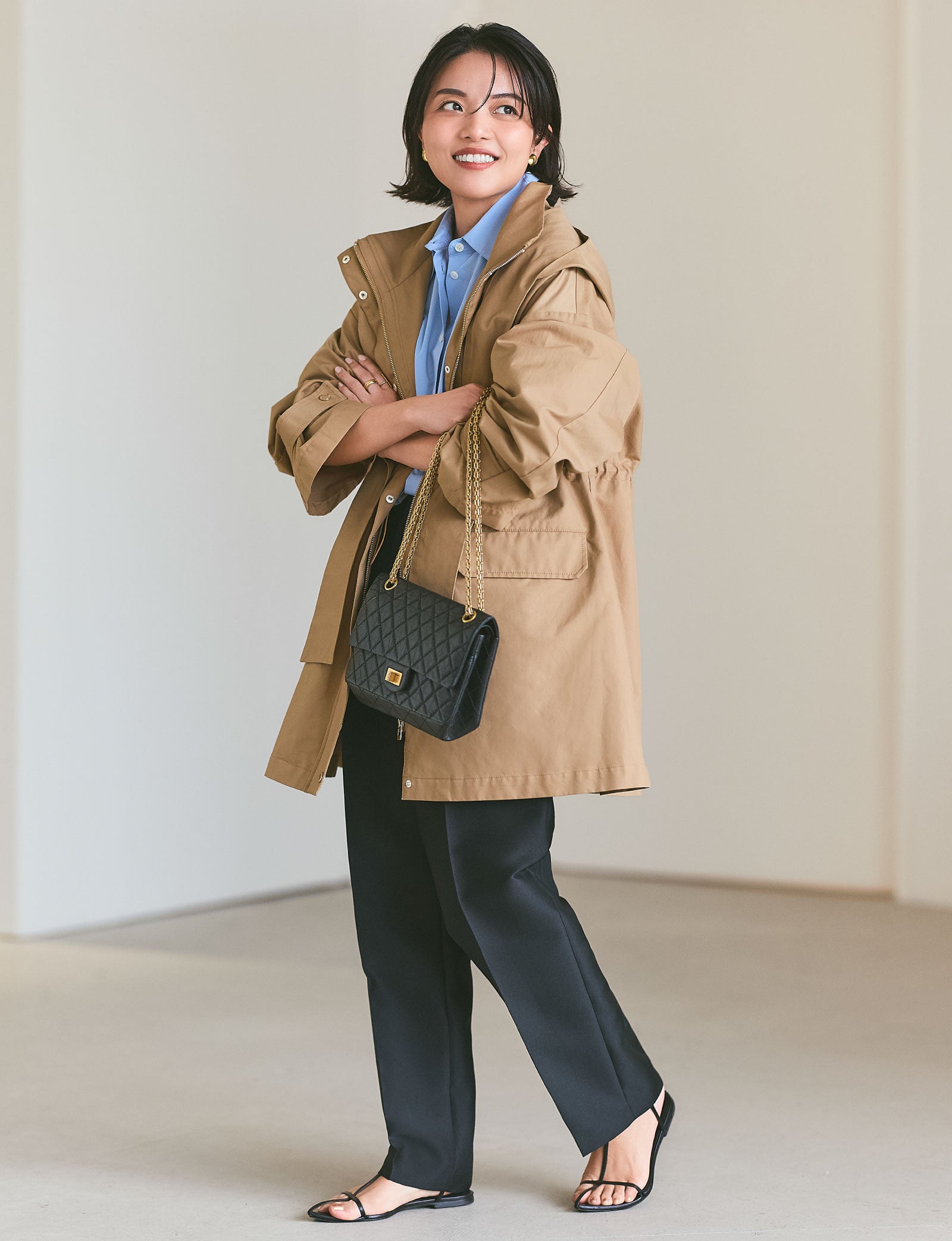 ミドル丈のベージュのアウターは、トレンチコートとスポーティなブルゾンの中間のような存在。きれいめにもカジュアルにも合わせやすいと思います。合わせたのは、きれいなブルーのパリッとしたシャツ。そしてフォルムの美しい黒のパンツ。シンプルですが、色とフォルムがとても美しくて、キレのいい着こなしに。ローファーで正統派にするのもいいのですが、あえて足元はヌーディなサンダルで。春らしさと女っぽさで、より印象的に。