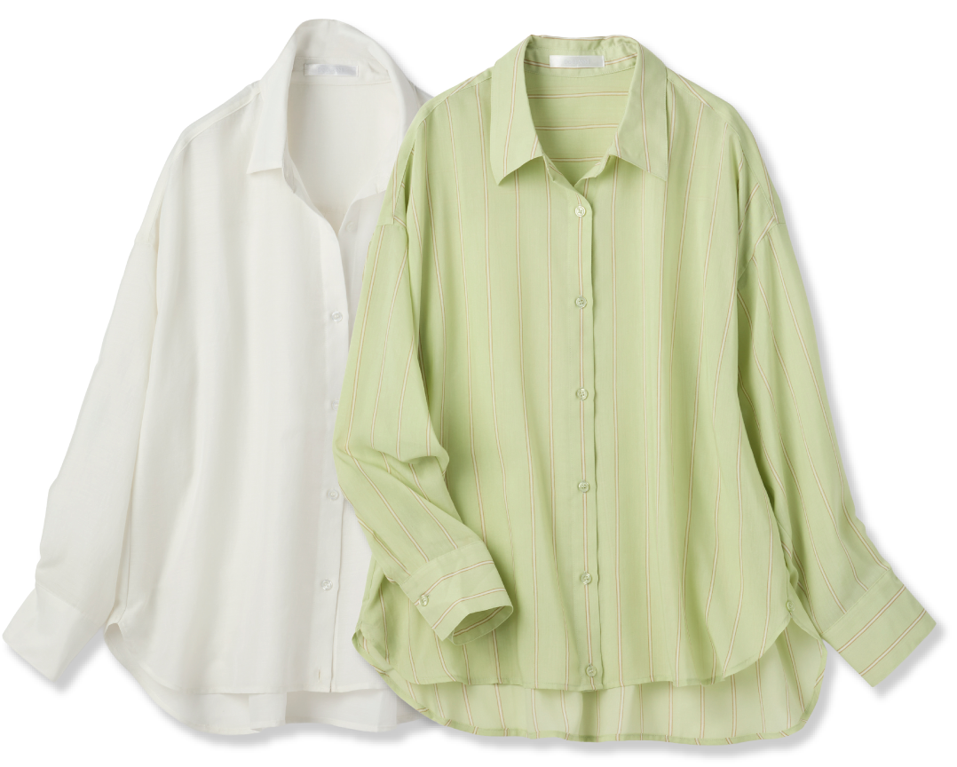 柔らかくて、シアーな風合い。「このシャツならば」とシャツを2枚重ねる旬のレイヤードスタイルに挑戦してみました。体に自然に馴染むから、ごわつかずトライしやすいんです。難しそうに聞こえるかもしれませんが、とっても簡単で、今どきの着こなしになるのも変化がついていいですよね。春らしいグリーンと柔らかいホワイトを重ねて、全身もトーンを揃えて。寒色の水色のバッグをポイントにすると、ぼんやりせずキリッとした印象に。