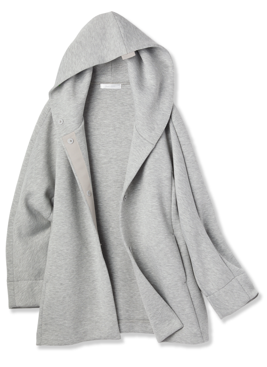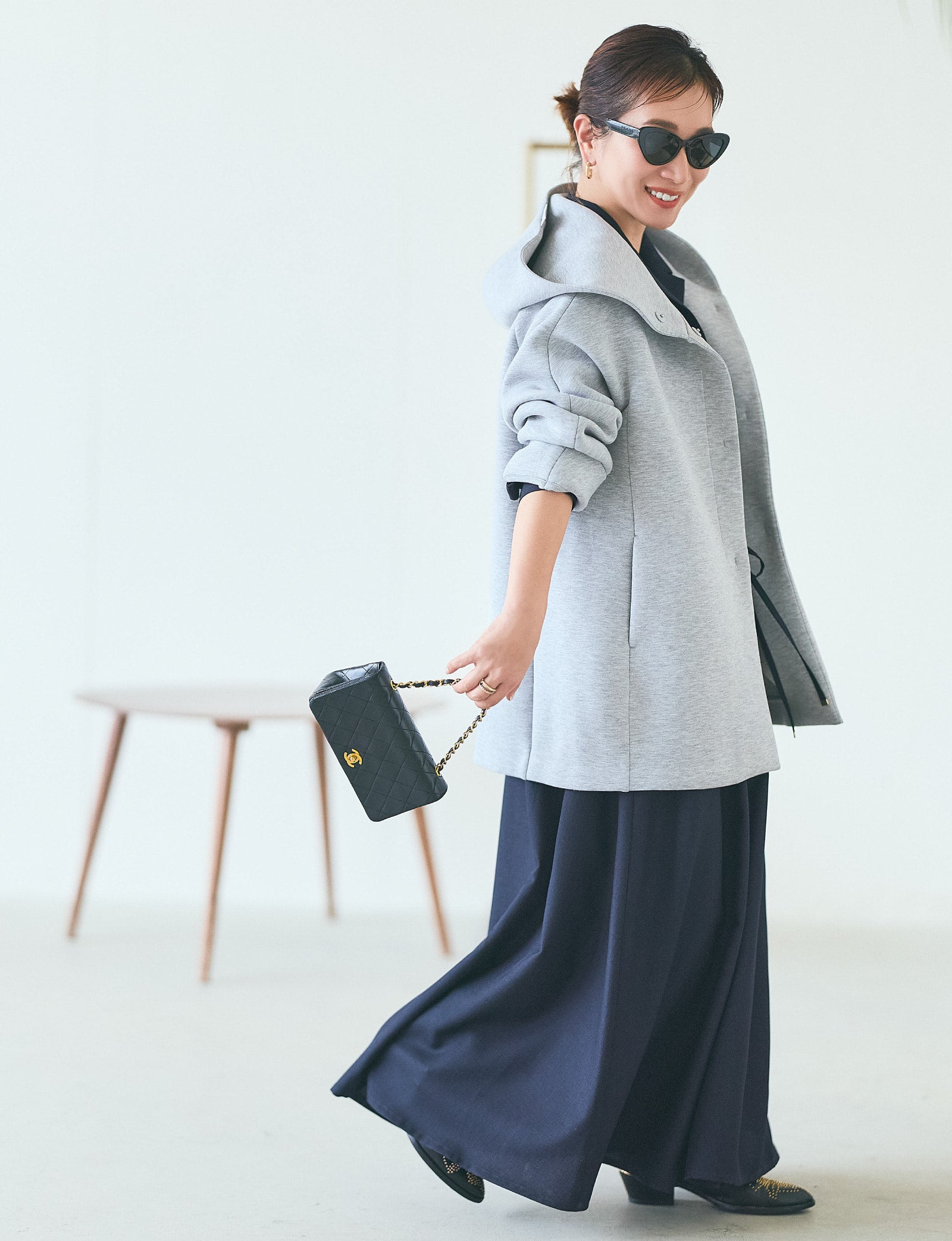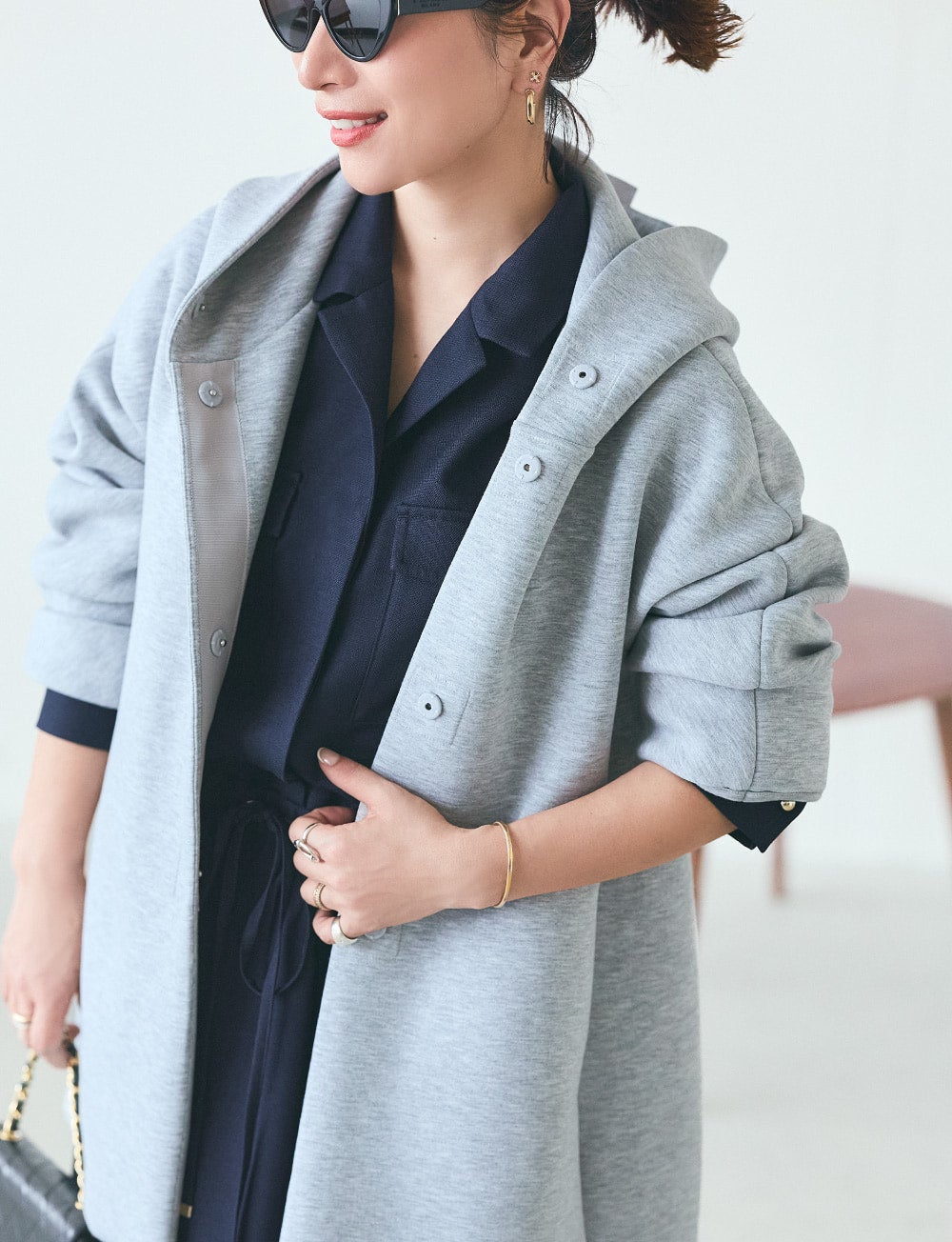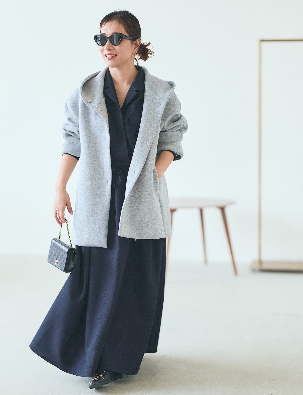パーカーのよう?・・・と、袖を通してみたら、思っている以上にきれいな佇まい。ふっくらと、しっかりとハリがあって、すっとフォルムが決まります。カジュアルになりすぎない、ジャケット感覚で羽織れる春アウターって意外とないので、これはとっても重宝しそう。フルレングスのエレガントなワンピースと合わせてみたら、いいバランスに落ち着きました。一枚でおしゃれ上手に見せてくれる、まさに秀逸ジャケットですね。