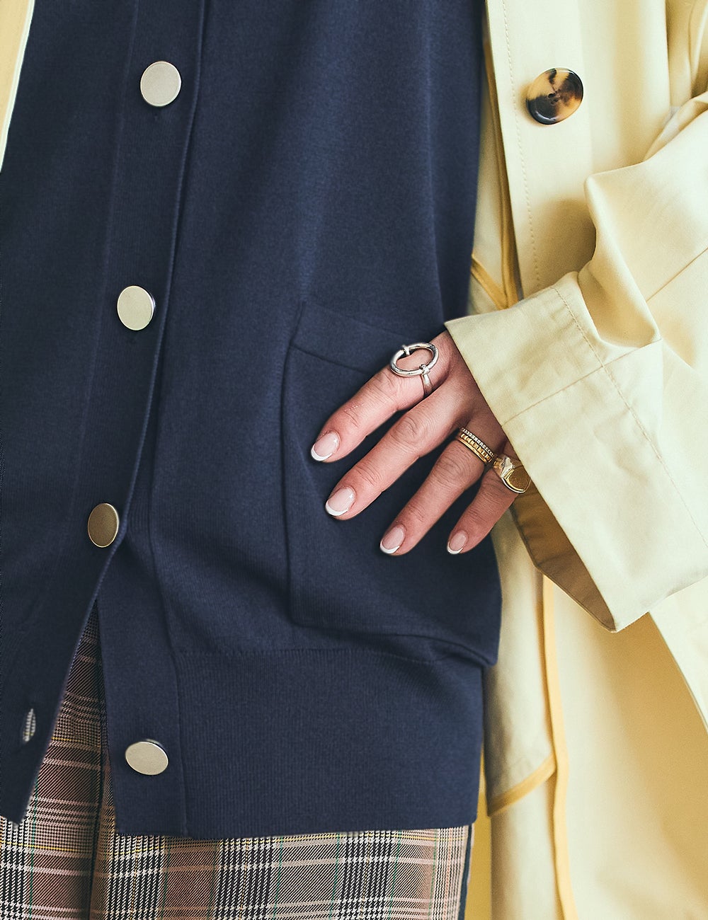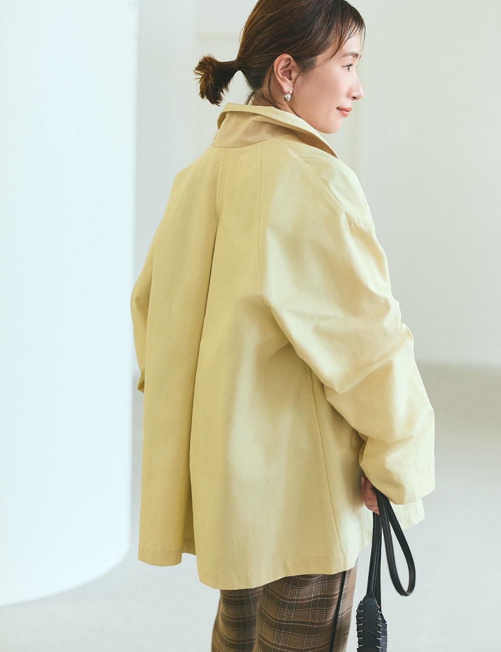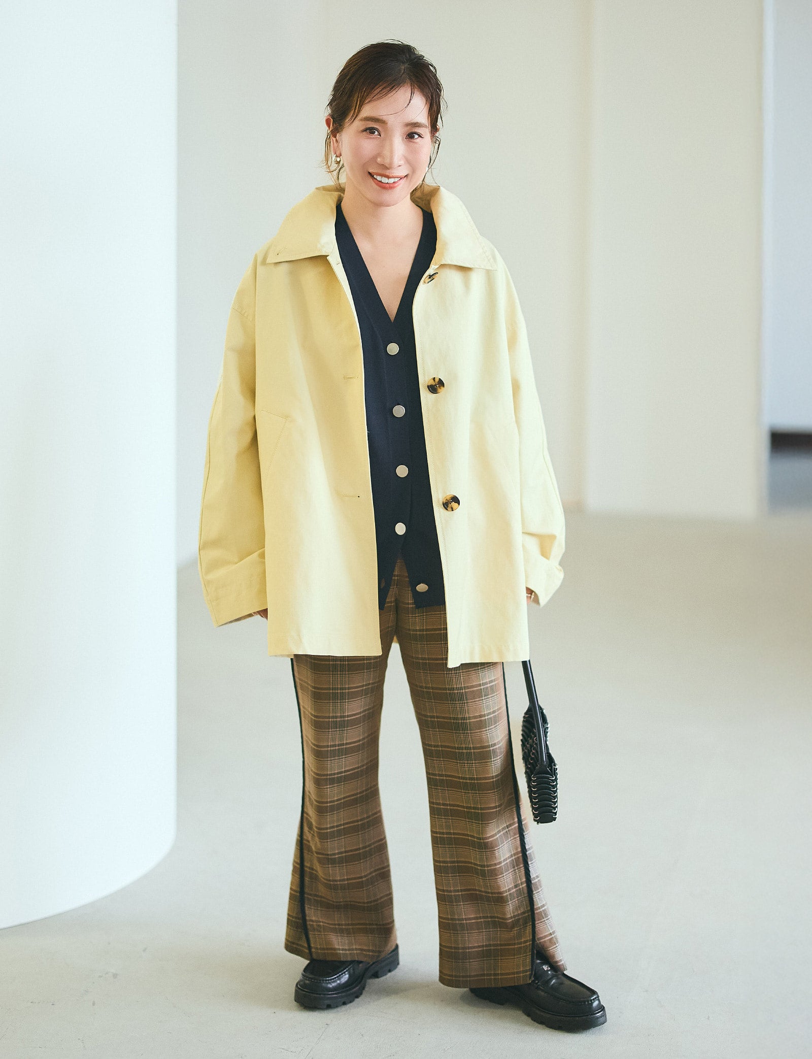 ほどよくハリのあるコートは、小粋な短め丈のビッグシルエット。150センチ台の私には大きいのですが、あえてこのサイズ感が気に入りました。マイルドなイエローも、春らしくてとってもきれいな色。アウターってつい定番カラーを選びがちですが、気持ちも上向く季節は、明るい色味を輪郭にする方がおしゃれ心も上がります。ポイントは、中をネイビーとブラウン系で”締め色”にすること。シルエットも縦ラインを意識して、すっきりと。胸もとは少し大胆に開いて、重ための色に対して、抜け感を持たせるように。