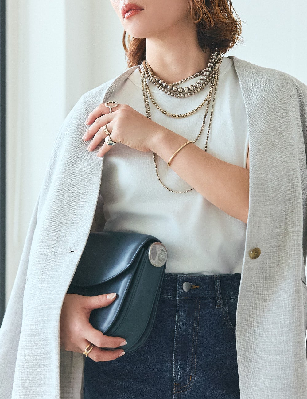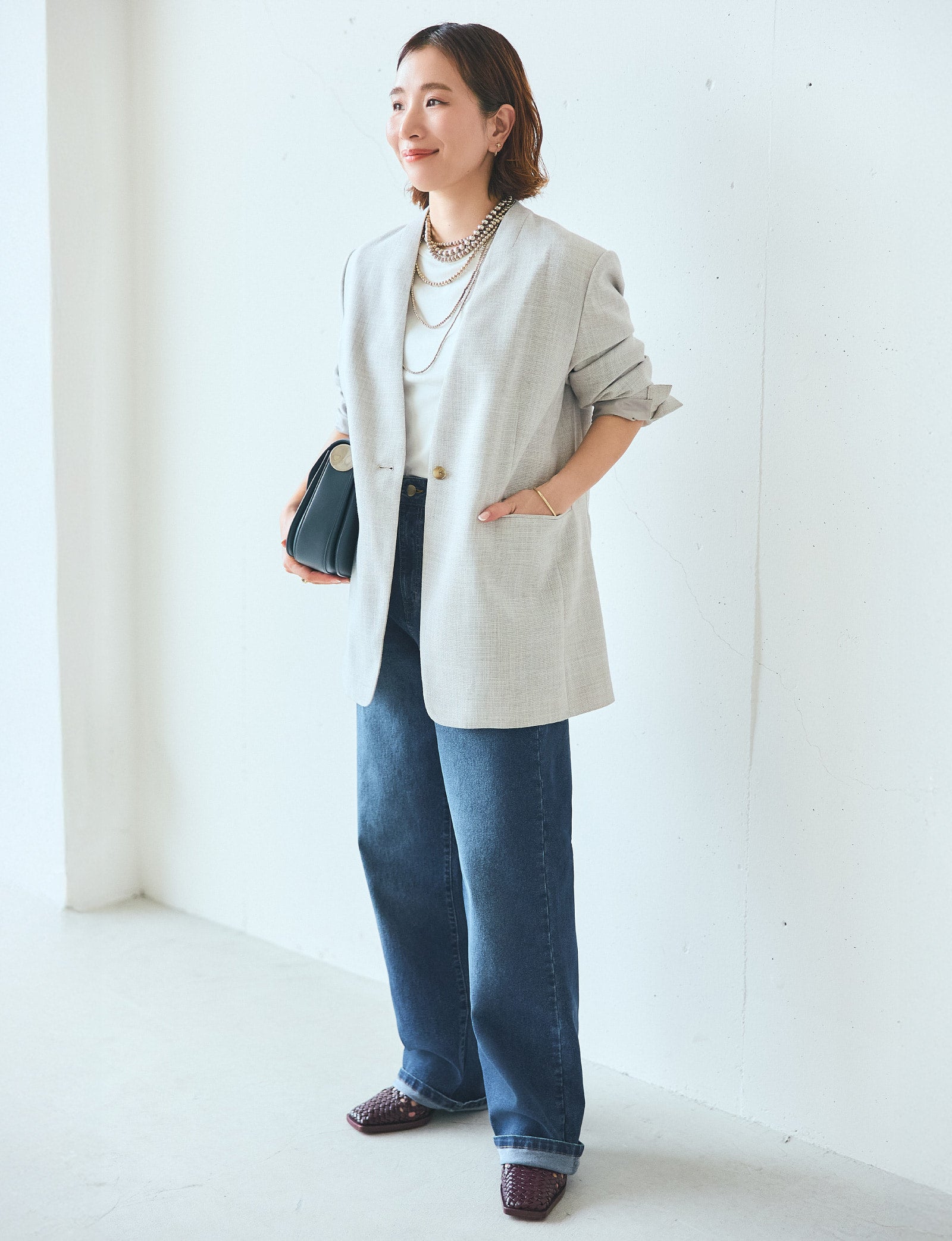 ストレッチが効いていて心地よくて、きれいなストレートシルエットで包み込んでくれて、穿くだけで垢抜けられて・・・。このデニム、非の打ちどころがないくらい! ご自身の丈に切ってもいいのですが、折り返しても、逆にあえてもたつかせても新鮮だと思います。ジャケットとTシャツは仕事のマイスタイル。ノーカラーはジュエリーが映えるので好きなんです。涼やかで、さらっと着られて、このジャケットはデニムとセットで欲しいくらい!