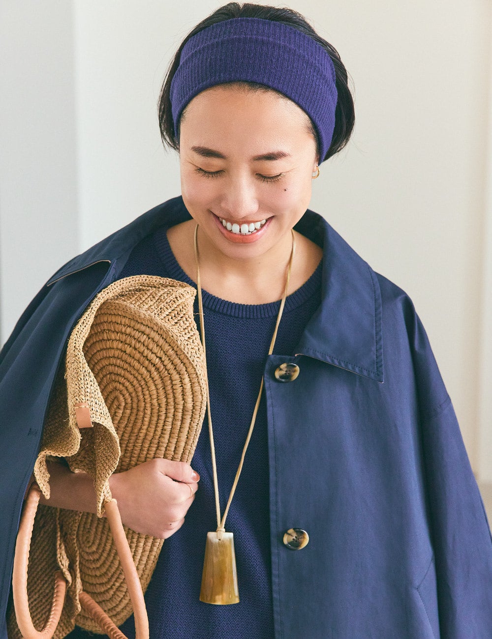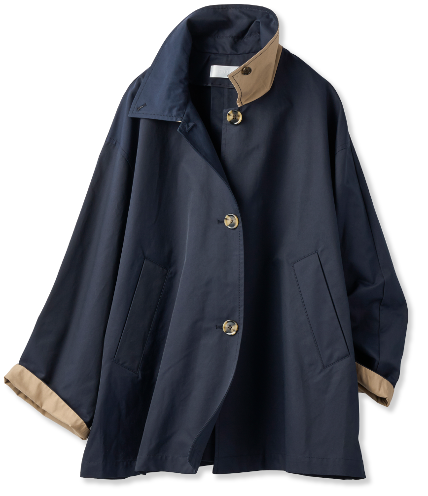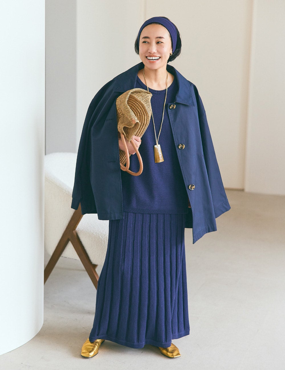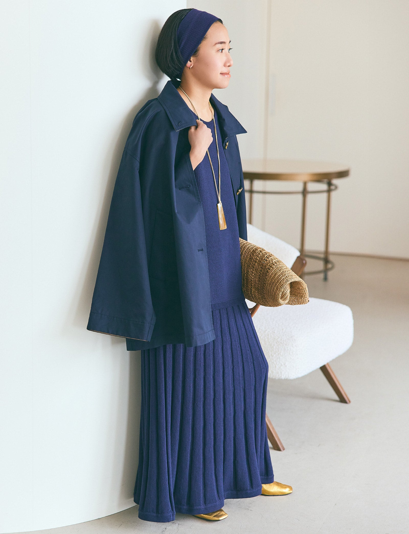 ネイビーが大好き。ステンカラーコートも好き。大きめの襟、袖もワイドでボリューム感のあるシルエットもいいですね。思い切ってロングスカートのセットアップと合わせて、オールネイビースタイルに。ヘアバンドもお馴染みのアイテムなのですが、ヘアをよりコンパクトにすることで目線が自然に上がり、全身のバランスが整うんです。ネイビーの明度を上げるように、ゴールドのフラットシューズを。ラフィアのバッグも軽さアップにひと役。