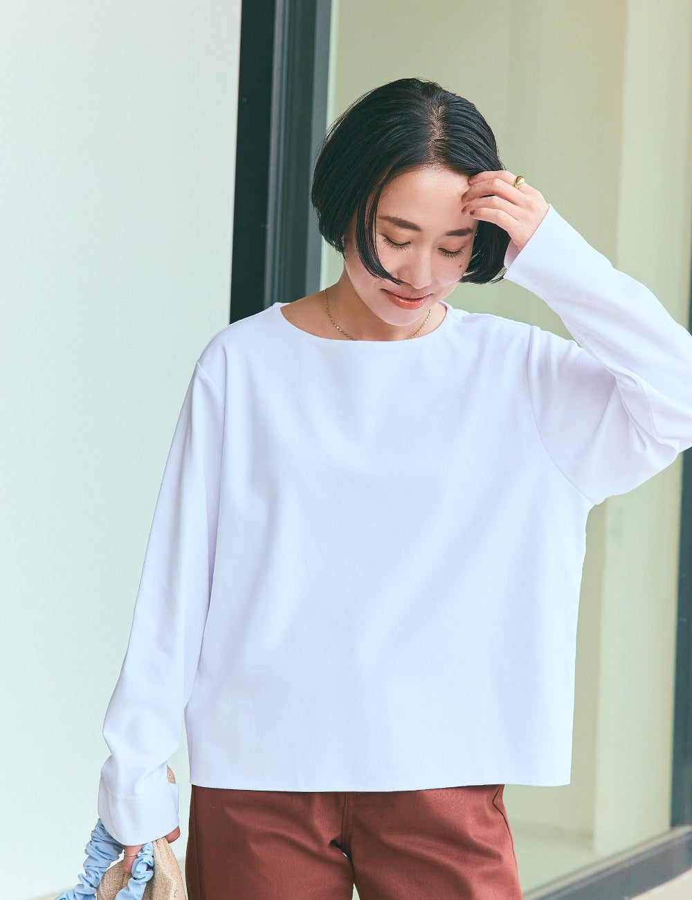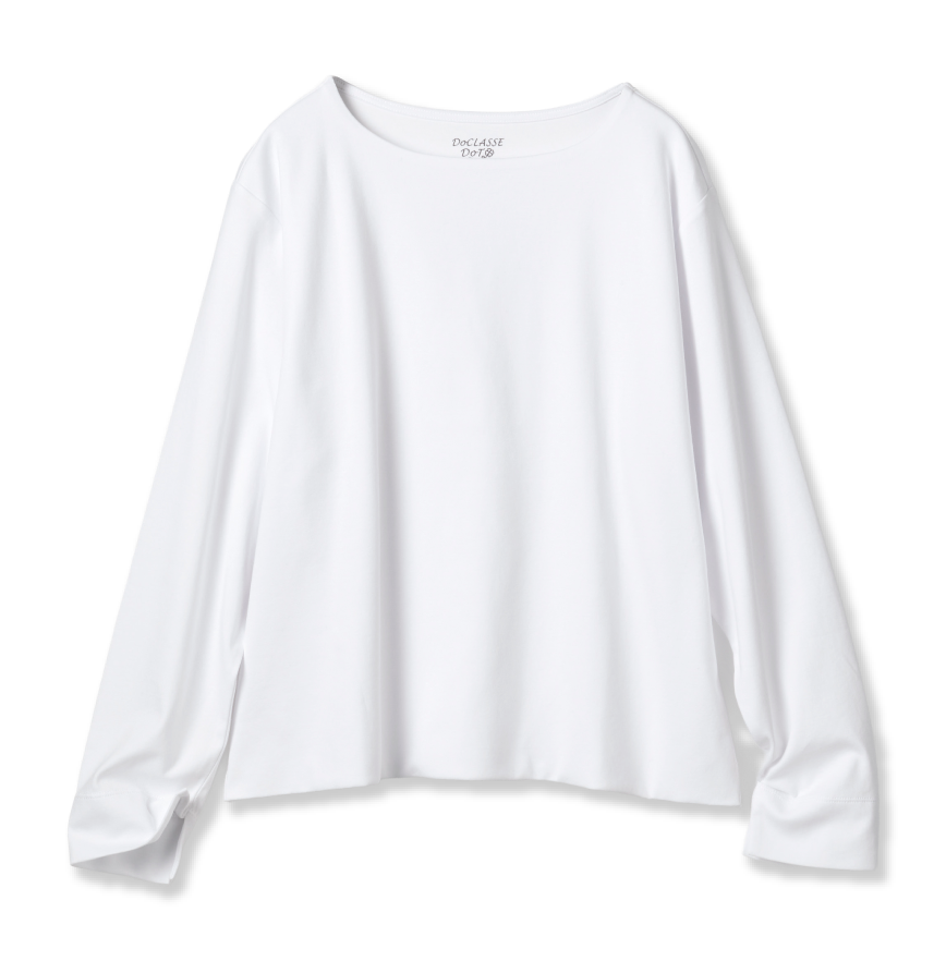 これは名品!デコルテのカッティングも絶妙で、生地も厚すぎず、カットソーの軽やかさがあるのに、心許なさがなく、しっかりしていてブラウス感覚で着こなせます。少しボクシーなシルエットで、一枚でも、きれいなジャケットにインしてもサマになります。スラックス感覚のブラウンデニムとなら、少しだけきちんとした印象に。
