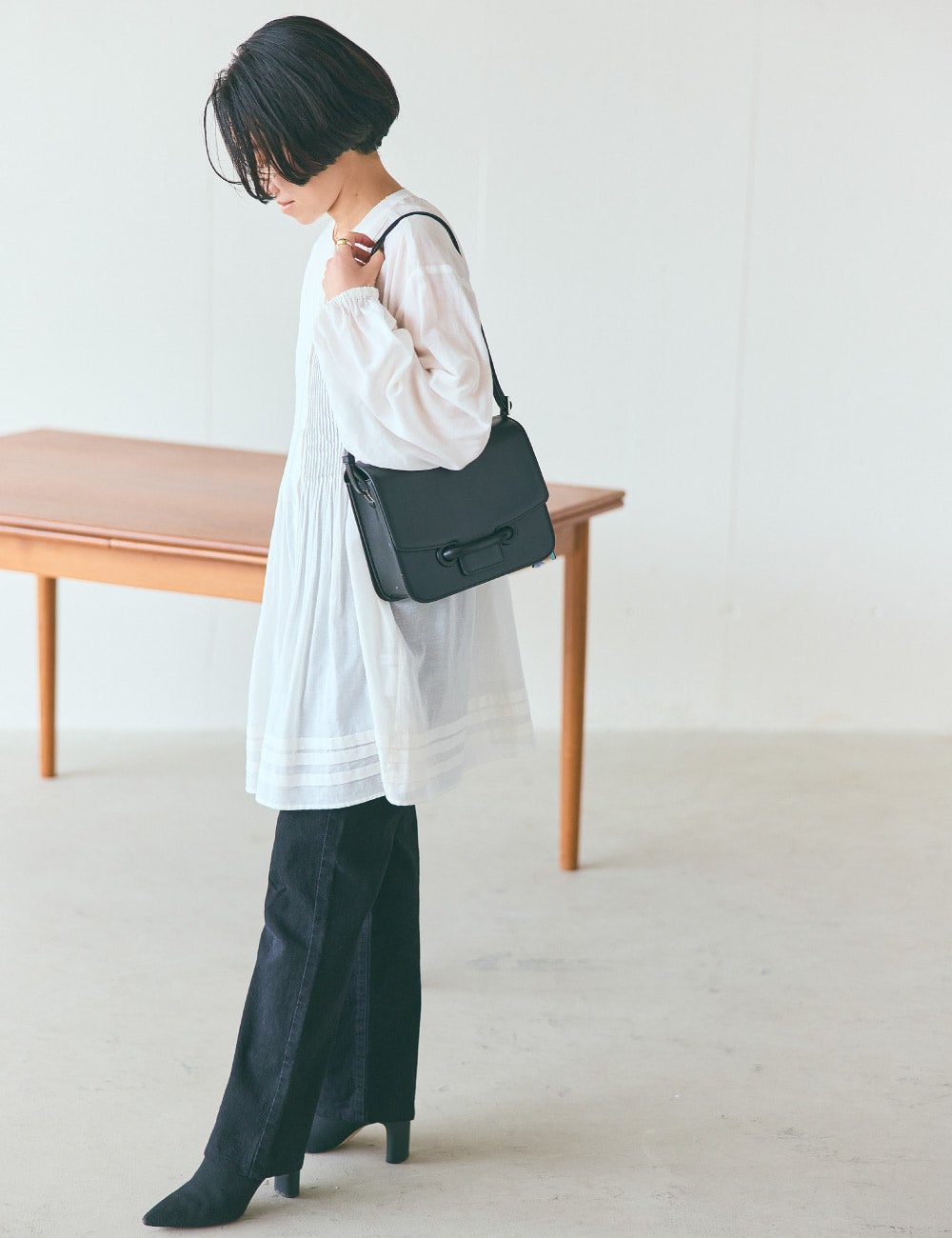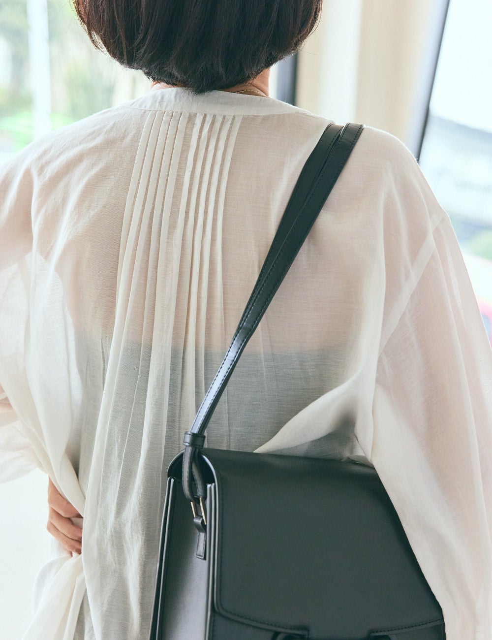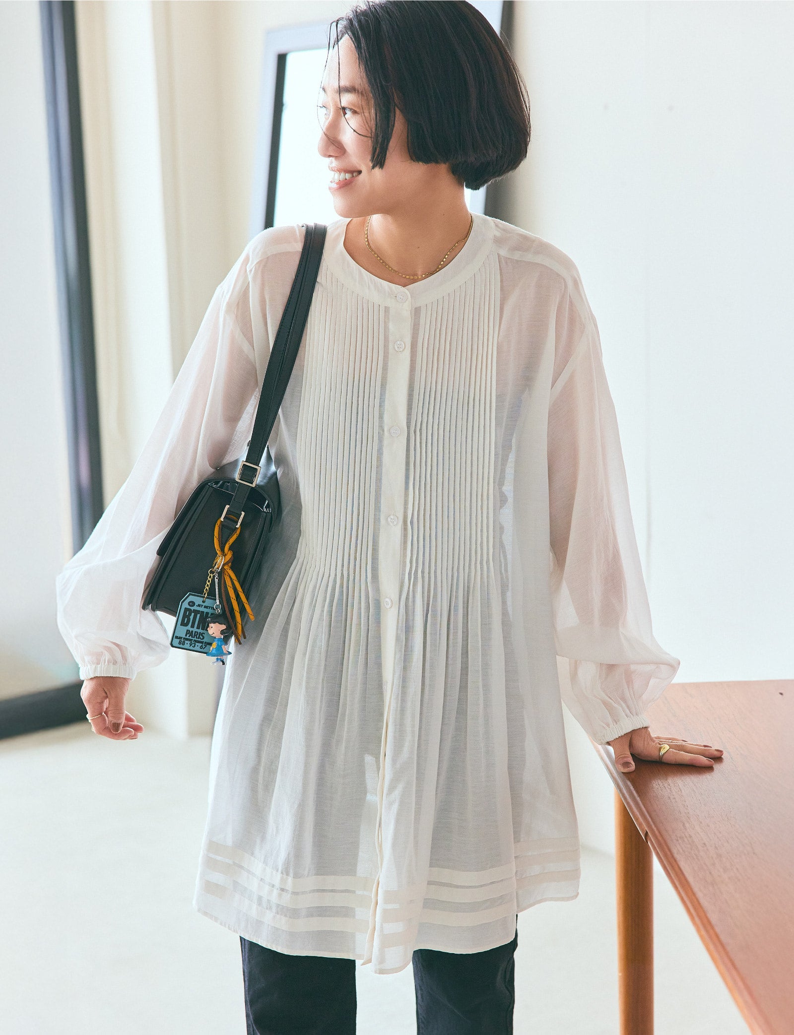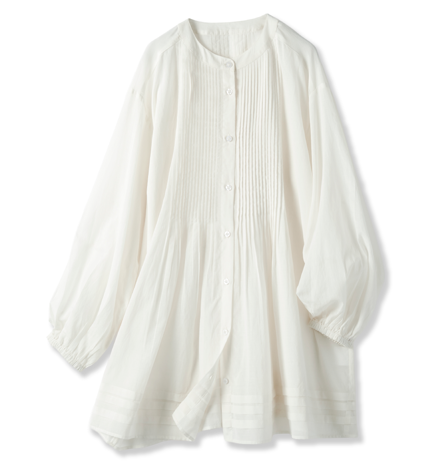 春も、真夏も、長く大活躍してくれそうな軽やかな透け感のブラウスは、主役にしたい一枚。一見甘めなアイテムですが、繊細なピンタックのおかげで、印象はしゃっきり。真っ白ではなく少し温度感のある柔らかな色味も気に入りました。細身ストレートのブラックデニムですっきりと合わせましたが、レギンスとか、夏場はハーフパンツと合わせるのも良さそうですね。