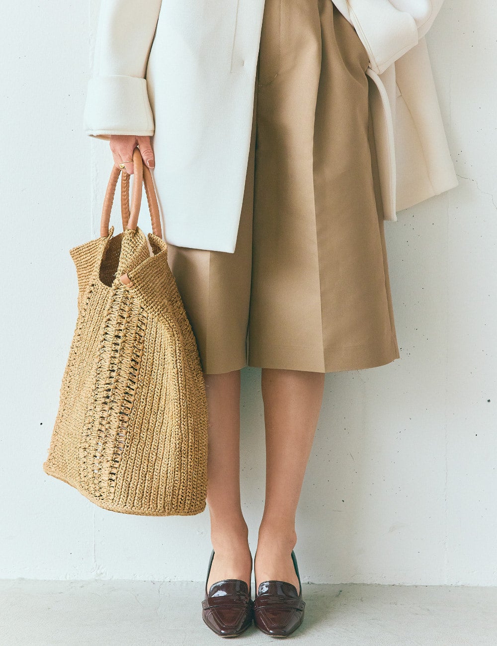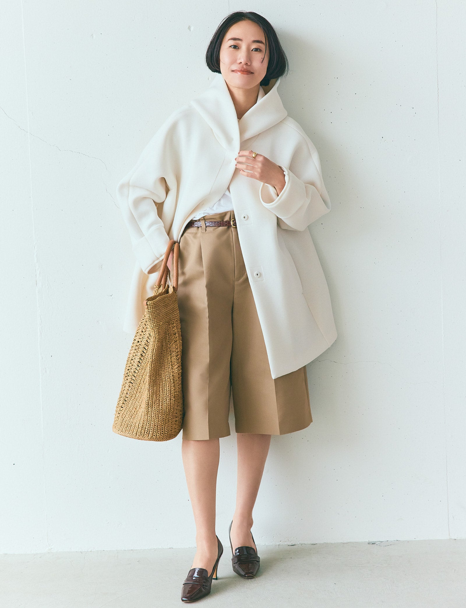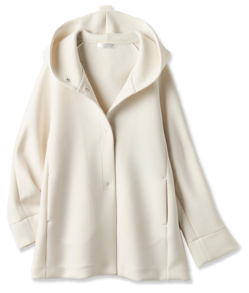 スウェットとハーフパンツだったら少年っぽくなってしまいそうですが、こちらのアウターとなら、こんなふうにしゃれた大人の着こなしに。独特のハリのある素材で、驚くほど軽くて・・・!ボタンを留めると、首元がキュッと立ち上がってスタイリッシュに着こなせます。ハーフパンツはヒールの靴でバランスよく、都会的に。ライトトーンのラフィアバッグで全身のトーンを整えます。