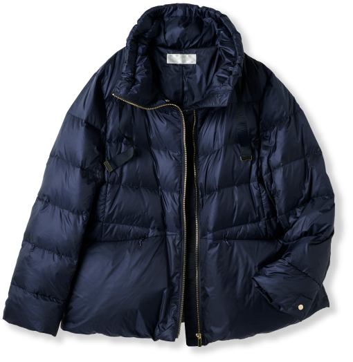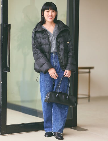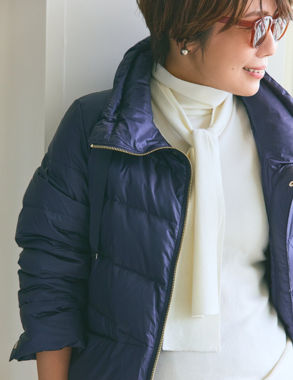 「パッと見て、このダウンジャケットなら女っぷりよく着たいな、というイメージがまず浮かびました。ブラウス感覚のボウタイニットと発色の美しいバイアスパンツで、”脱いだらエレガント”なスタイリングと合わせました。このダウンジャケットは、シルエットは女っぽくて、素材も柔らか。袖口にリブがないのもしゃれています。メタルのボタンやグランテープのあしらいも上品さのポイントに。ダウンジャケットはスポーティになりがちですが、これはまるでジャケットのよう。ほんのりとオレンジ味を帯びたブラウン系のカラーは、この秋の注目色。ネイビーと合わせると、華やぎもどこか知的で上品に。」
