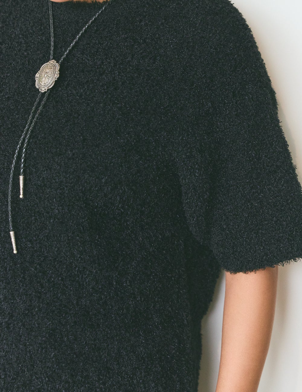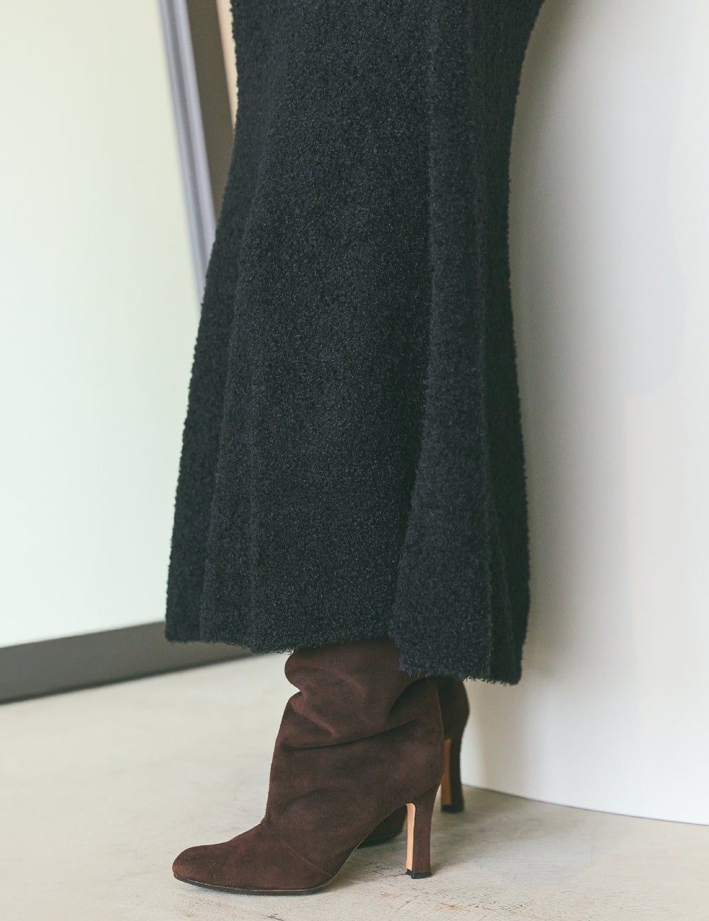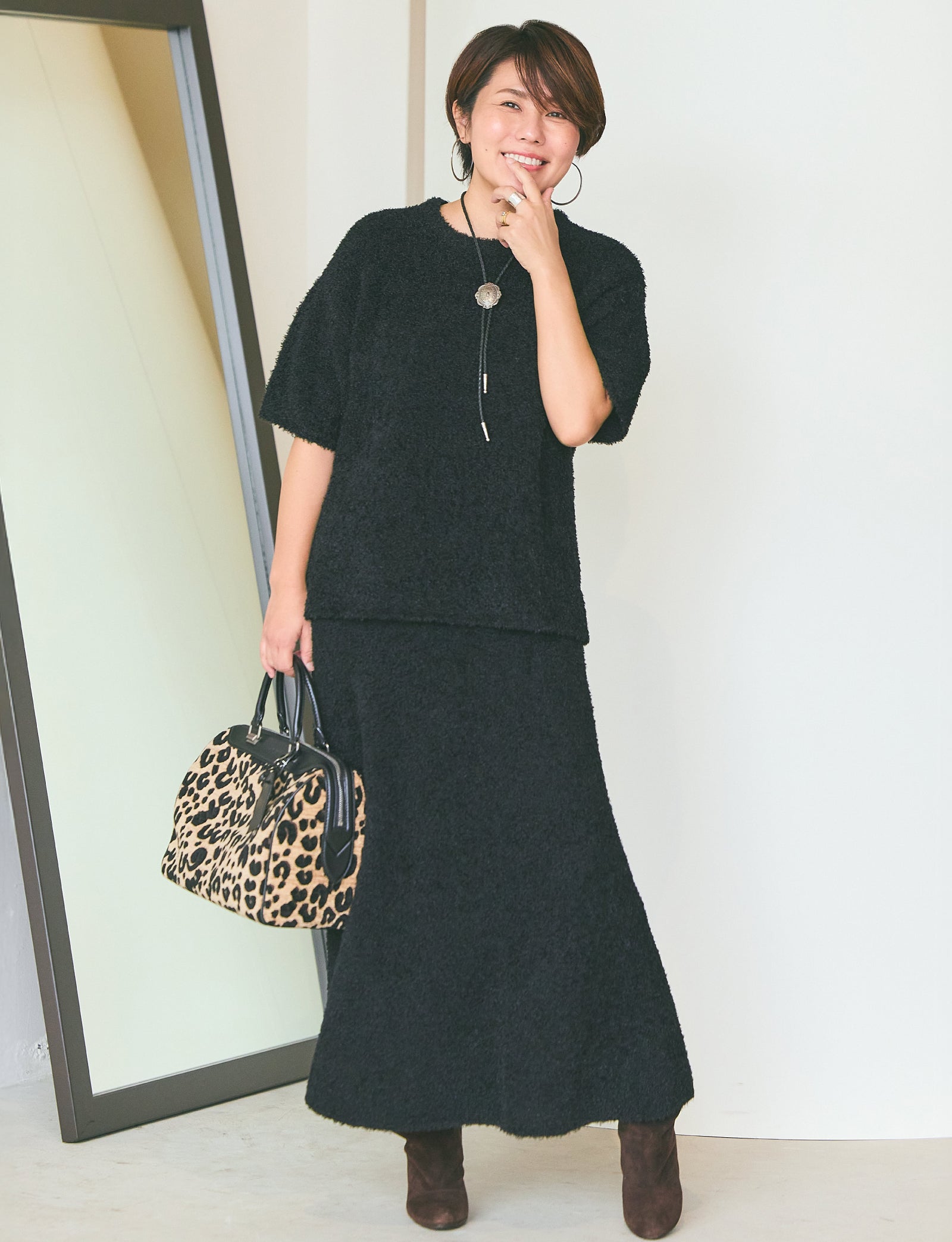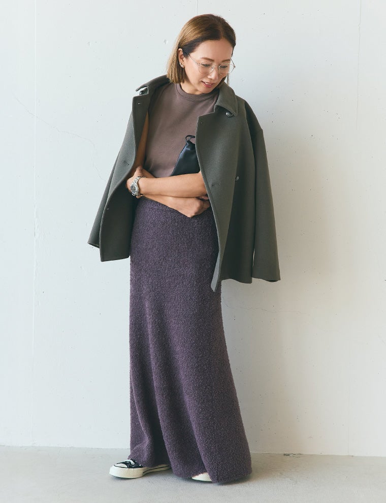 「思わず抱きしめたくなるような、愛嬌のあるもこもこの風合い、みんな大好きですよね。着膨れしそう?と思いましたが、まったく。 腰回りはすっきり、裾にかけて広がるフレアシルエットがとても美しくて、ドラマティック。見た目よりもうんと軽くて、スカートもさらりと揺れていい感じです。どこかレディライクに落ち着くので、ジュエリーはあえて大ぶりなものや、インディアンジュエリーでパンチを効かせて。足元はブラウンのスエードブーツ、バッグはアニマル柄を。異なるテイストを自由にミックスさせて、予定調和に終わらない着こなしに。」