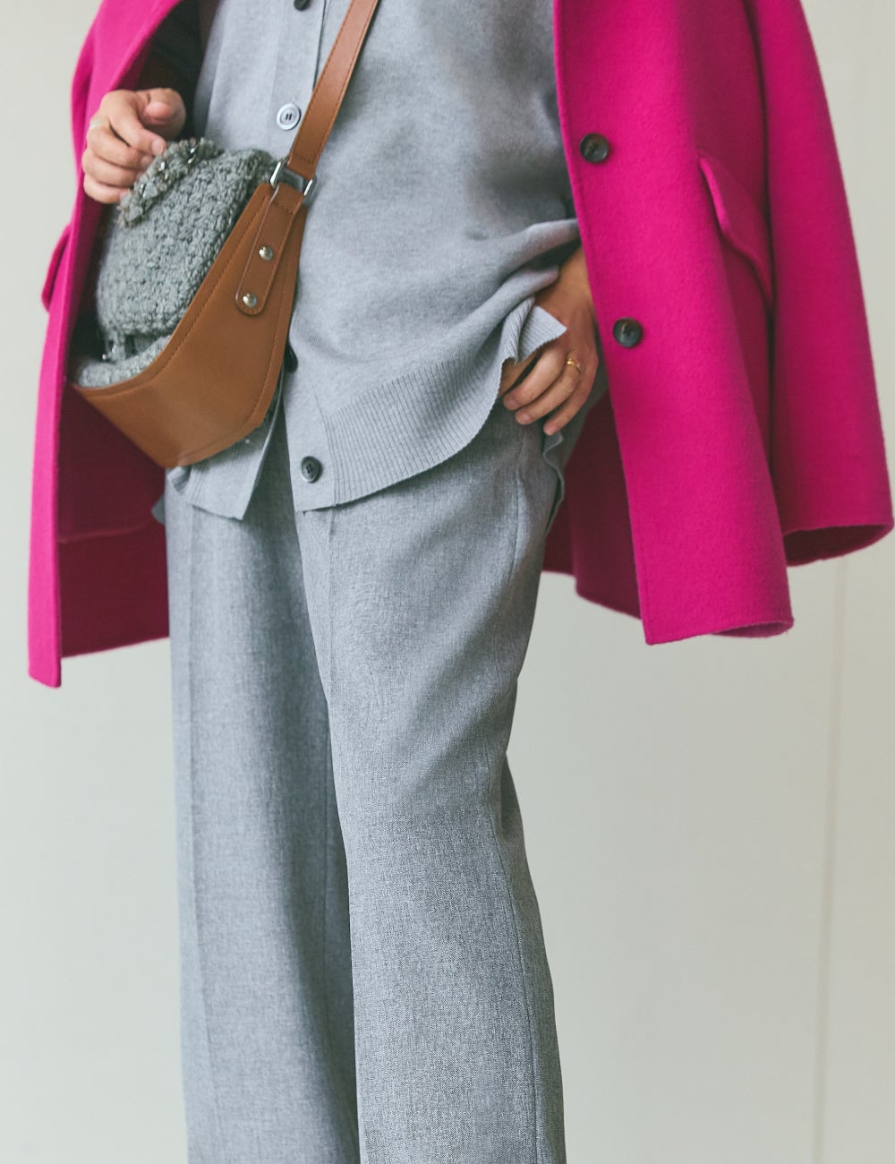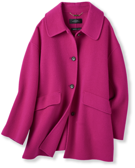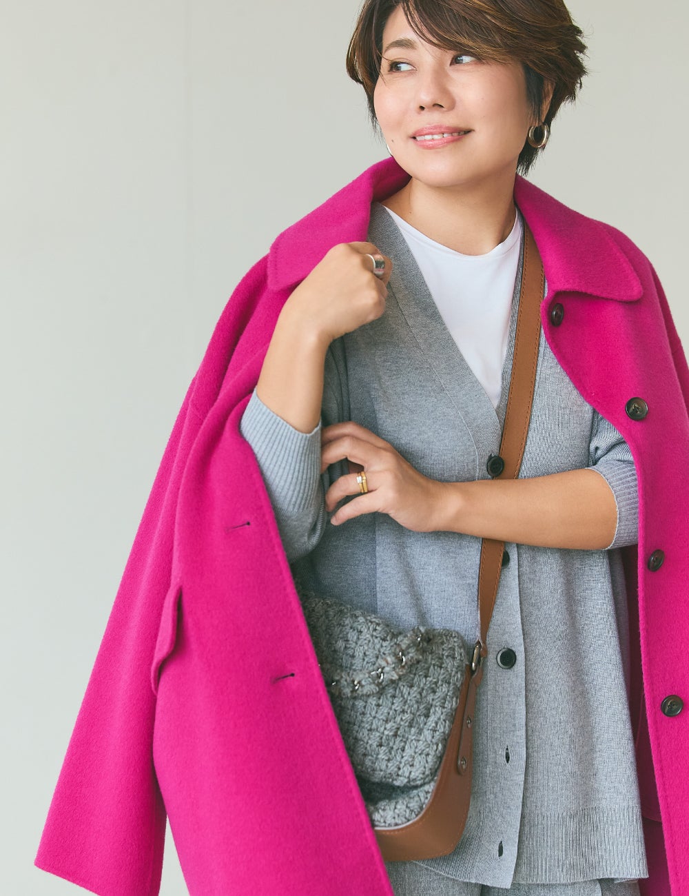 「この鮮やかで華やかなピンクに惹かれて……! カラーコートは上級者のものと思われがちですが、一般の方へのコーディネートアドバイスの時にも、私はよくお勧めしているんです。普段、装いの軸になっているのは、きっとほぼベーシックカラーですよね。その上に合わせるなら、定番色のコートより、カラーを取り入れる方が見違えるほど印象がフレッシュになるので。色こそインパクトがありますが、シンプルなデザインで取り入れやすさも抜群です。しかも軽くて、ダブルフェイスなのでしっかりと暖か。ピンクと相性のいい明度の高いグレーのワントーンスタイルに、白いTシャツとスニーカーを加えてキレよく。」