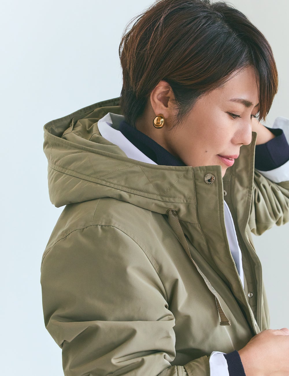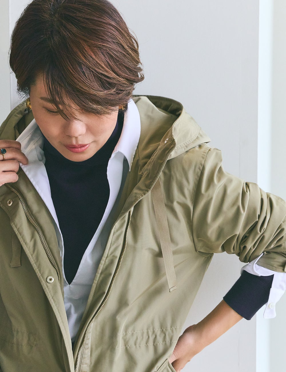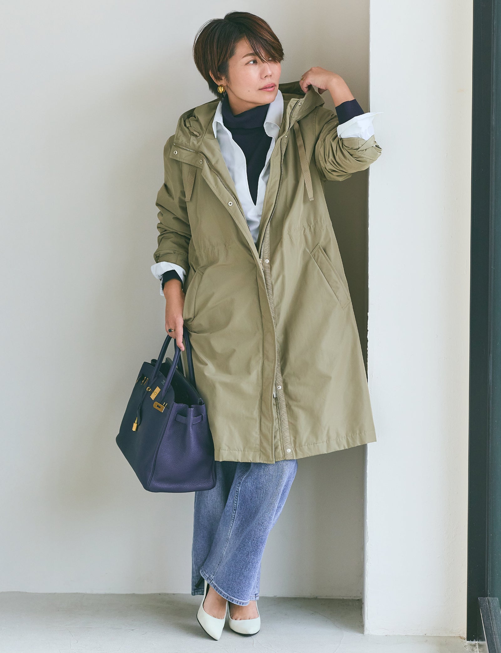 「ベーシックカラーのコーディネートにメンズっぽいアイテムを合わせて、エッジを効かせた着こなしに仕上げるのが大好きです。このコートは、ミリタリーのモッズコートのようでこなれた感じ。でも、色味は白をたっぷりと含んだカーキなので柔らかい印象に。暖かいのもいいですよね。白、ネイビーと合わせて、全身で大人のトリコロールカラーに仕上げました。こなれ見えしますが、どれもベーシックカラーなので、実はとても簡単。シャツとニットのレイヤードは、着こなしに奥行きをもたらし、コートを脱いでもサマになるのもポイント。白いパンプスは軽やかさと抜け感を足してくれるから、深まる季節に欠かせません。」