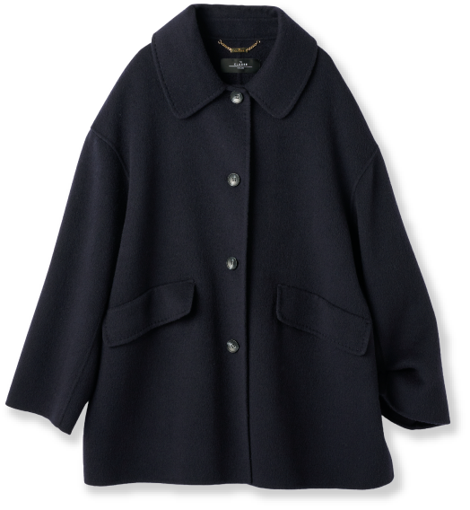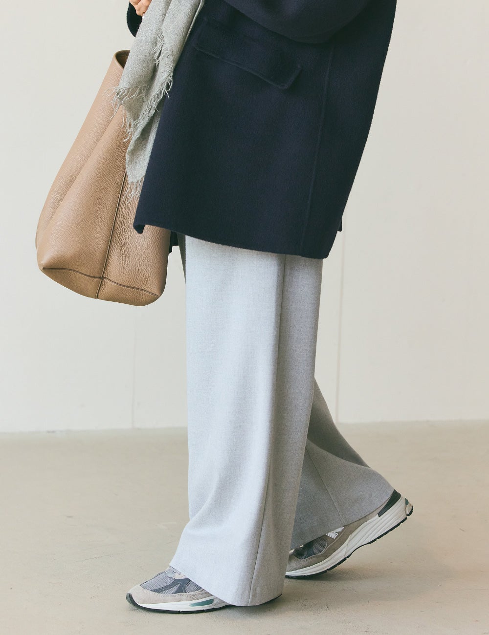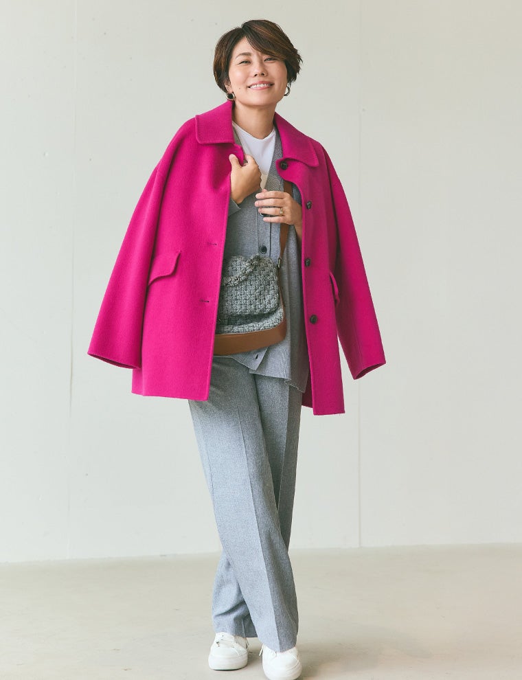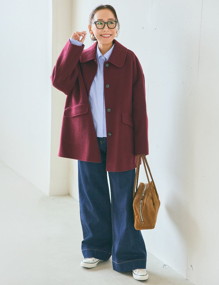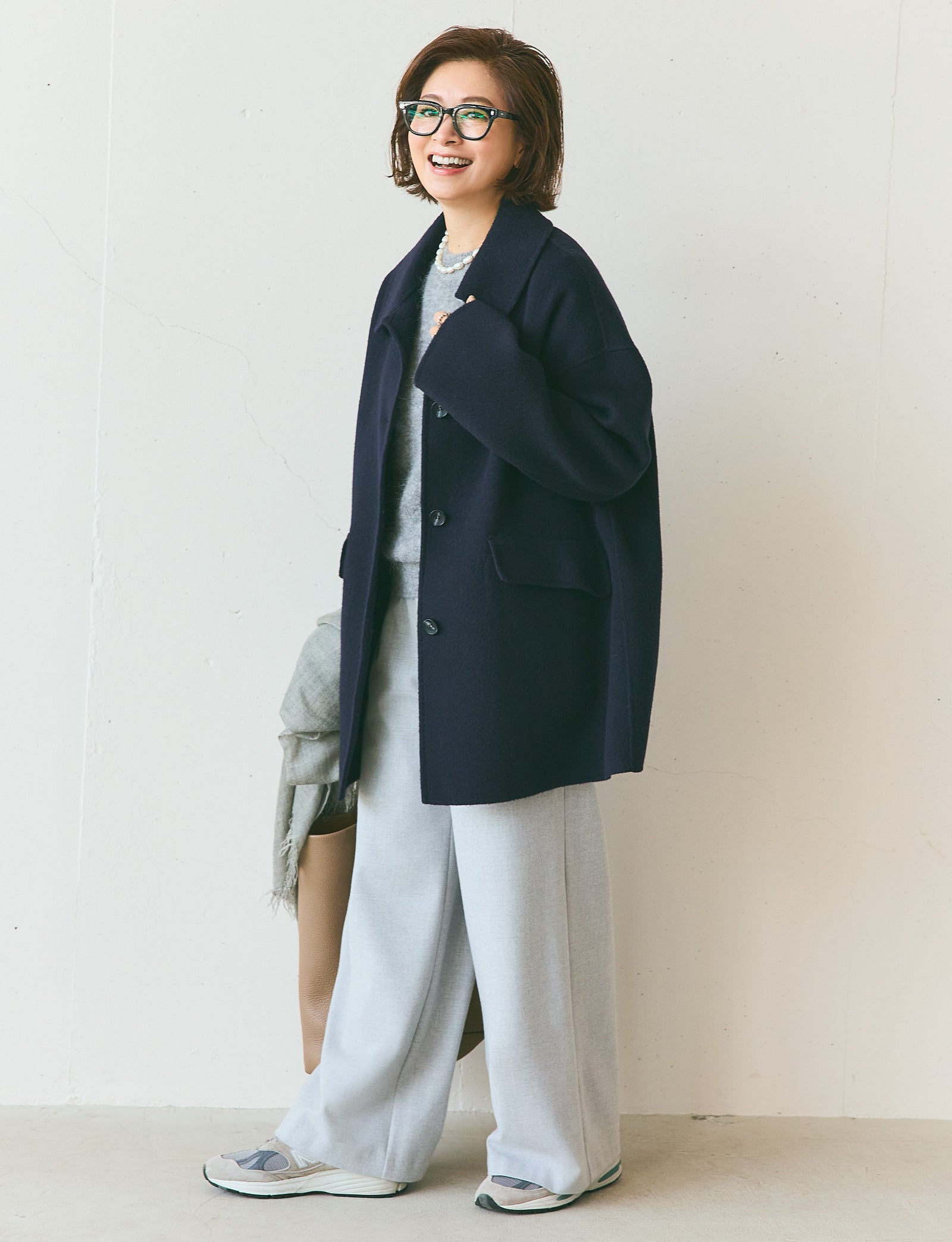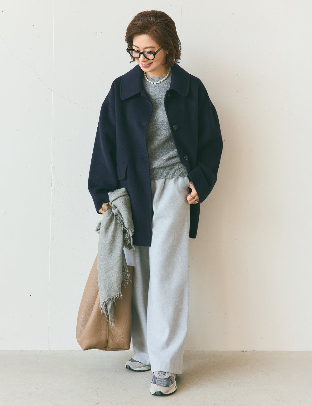 「ダブルフェイスのリバーコートというと、きちんとエレガントな印象が高いけれど、こちらはコクーン風に見えるフォルムに今どきの抜け感があって、とても着こなしやすいという印象。ミドル丈なのもバランスがとりやすくて、いいですね。ネイビーコートのインは、ライトグレーでつなげると、カジュアルになり過ぎず、品よくまとまる気がして好きです。ベーシックなスタイリングなので、メガネとスニーカーで、ちょっとメンズっぽい味つけにしてみました。」