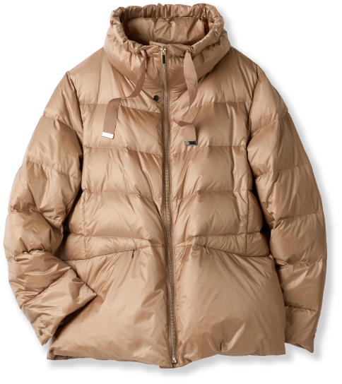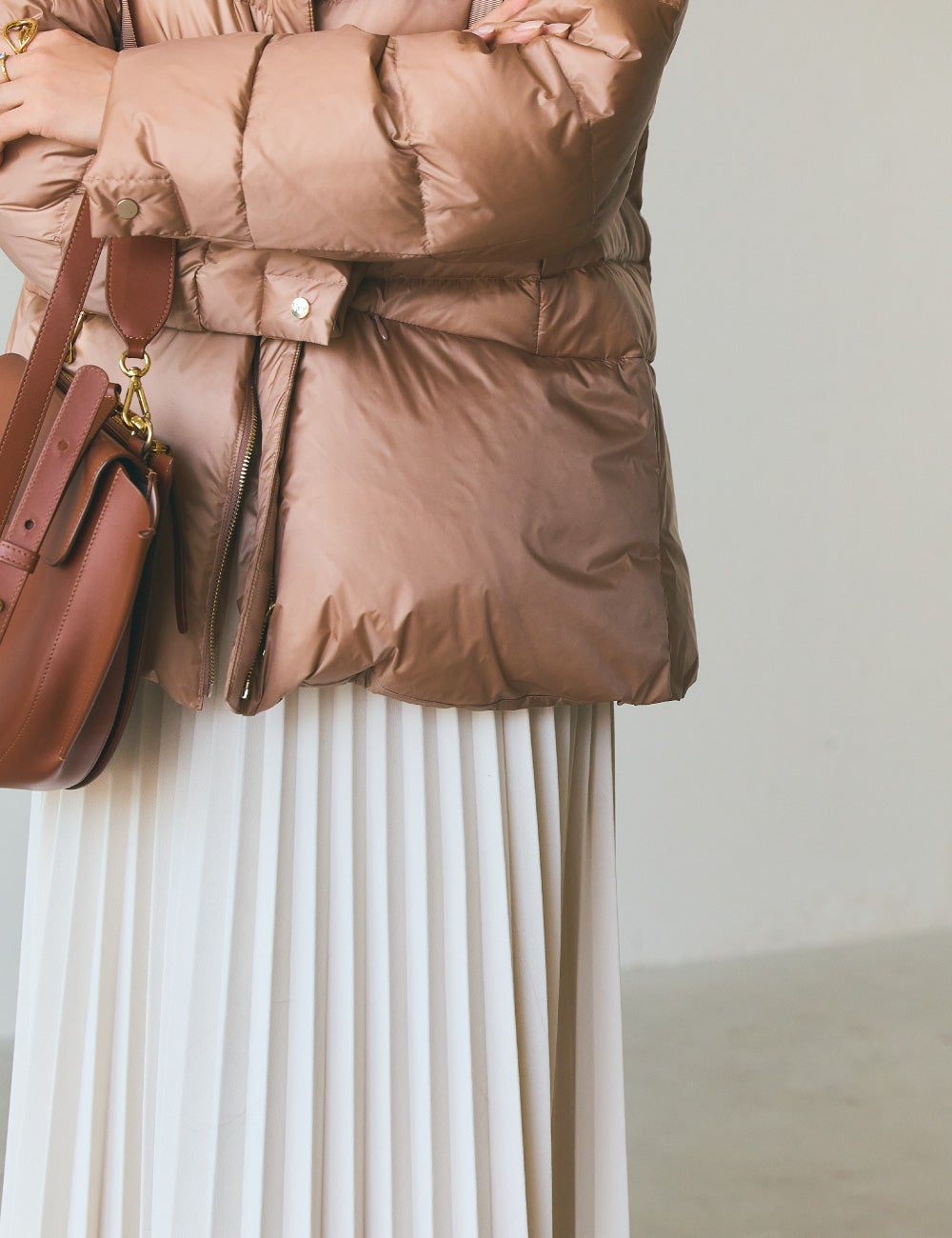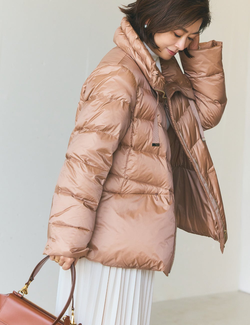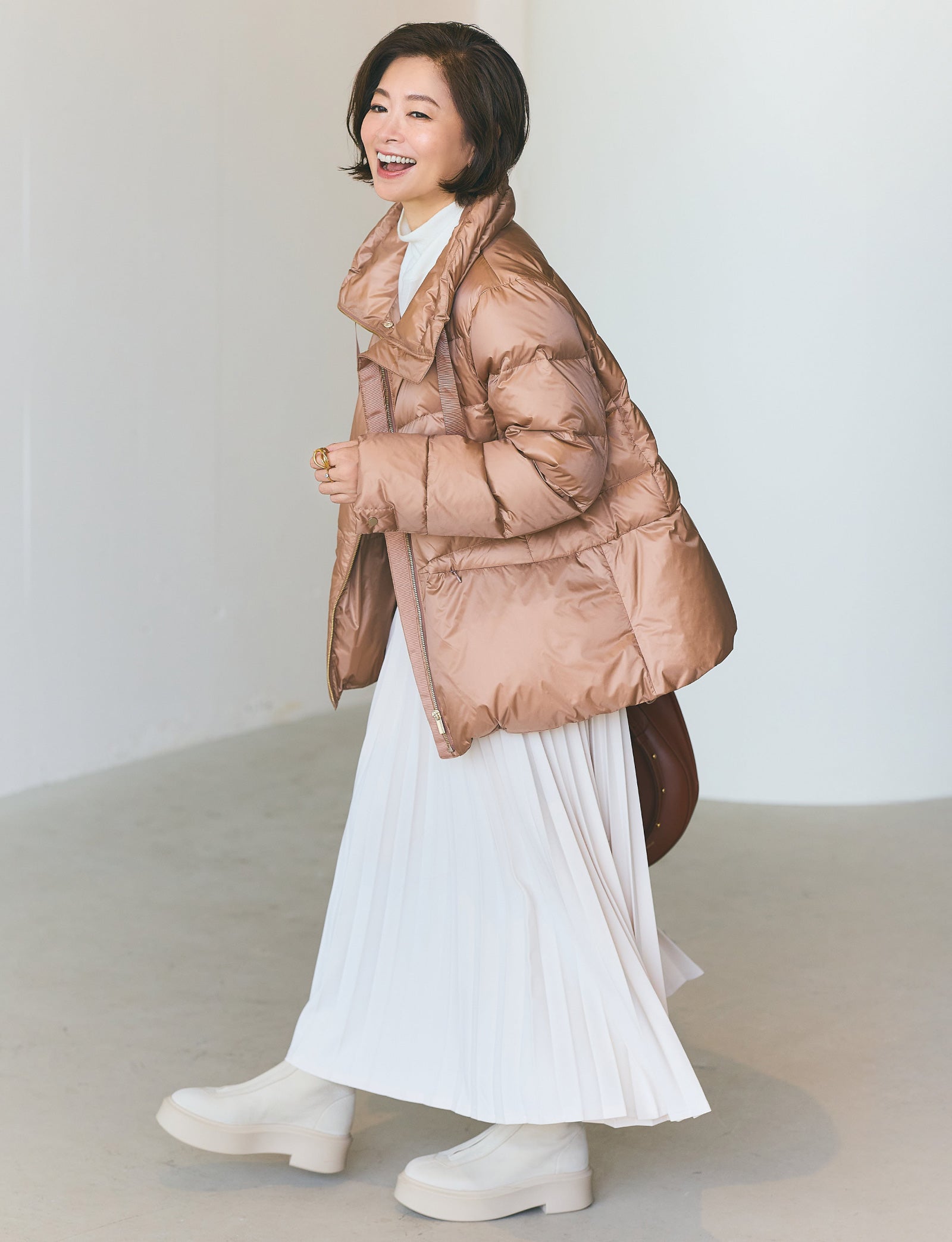 「リッチなモカベージュの表地、そしてリアルダウンの本格的な暖かさと軽さで、このプライスなのが本当に素晴らしい♡ フードではないスタンドカラーの襟元や、グログランのリボンテープのあしらいも、スポーティになりすぎず、きちんと大人の仕様になっていますよね。リュクスな印象を生かしたくて、ニットとプリーツスカートはホワイトできれいめに。足元はあえてスピード感のあるエッジィなブーツで、メリハリを効かせて。」