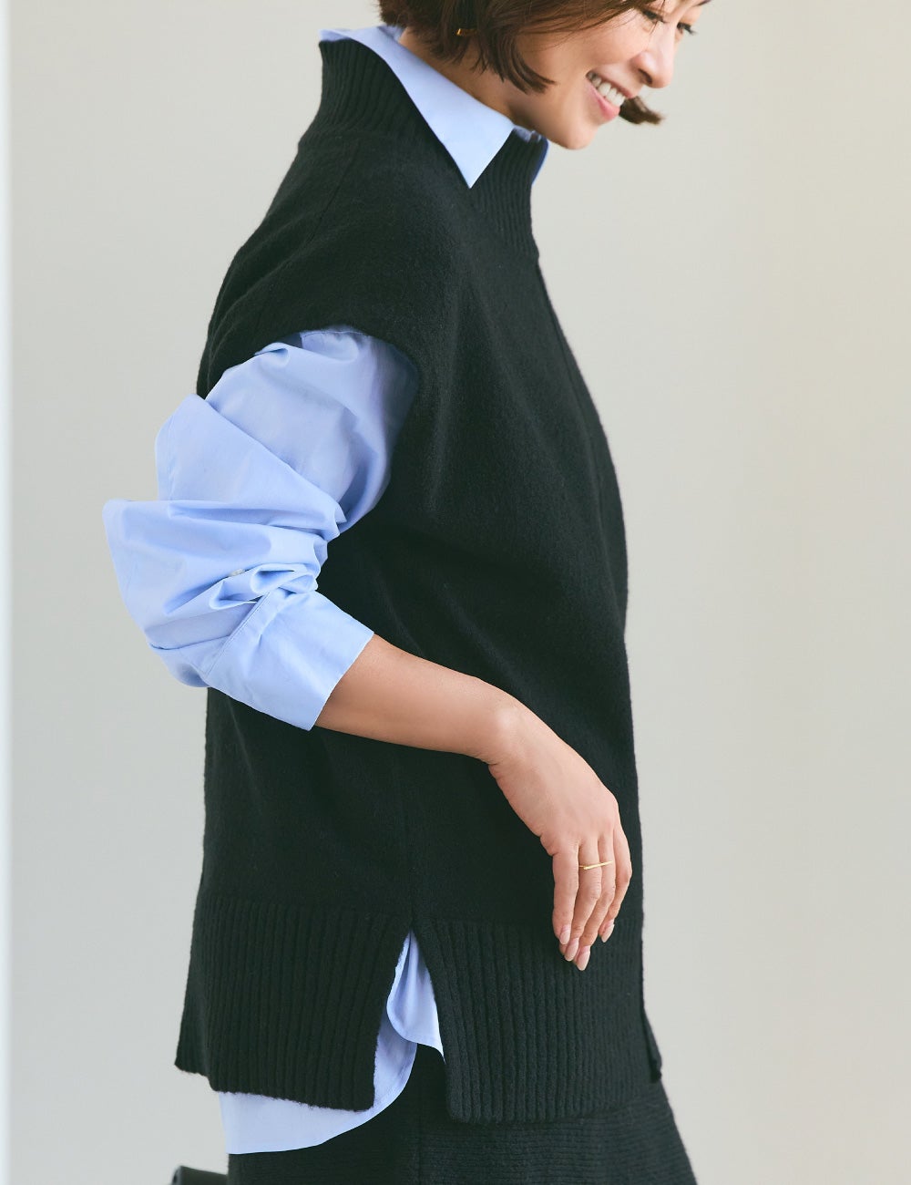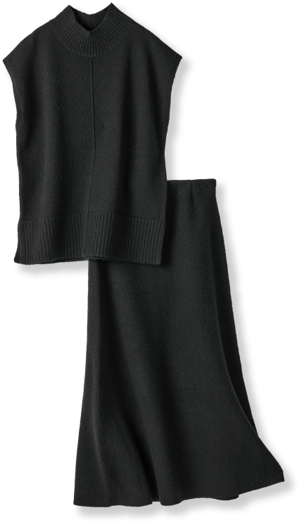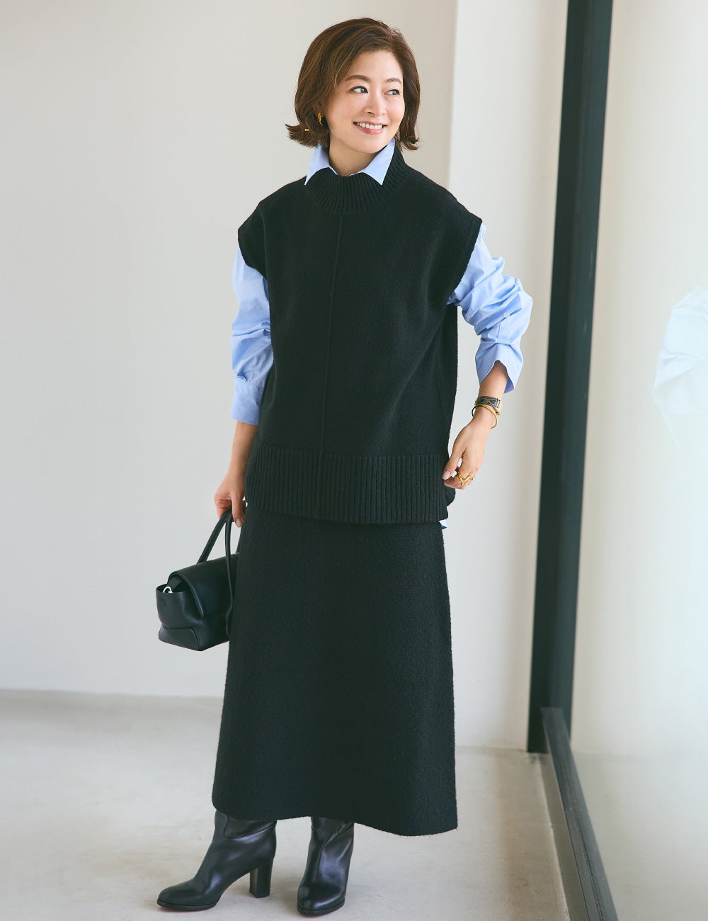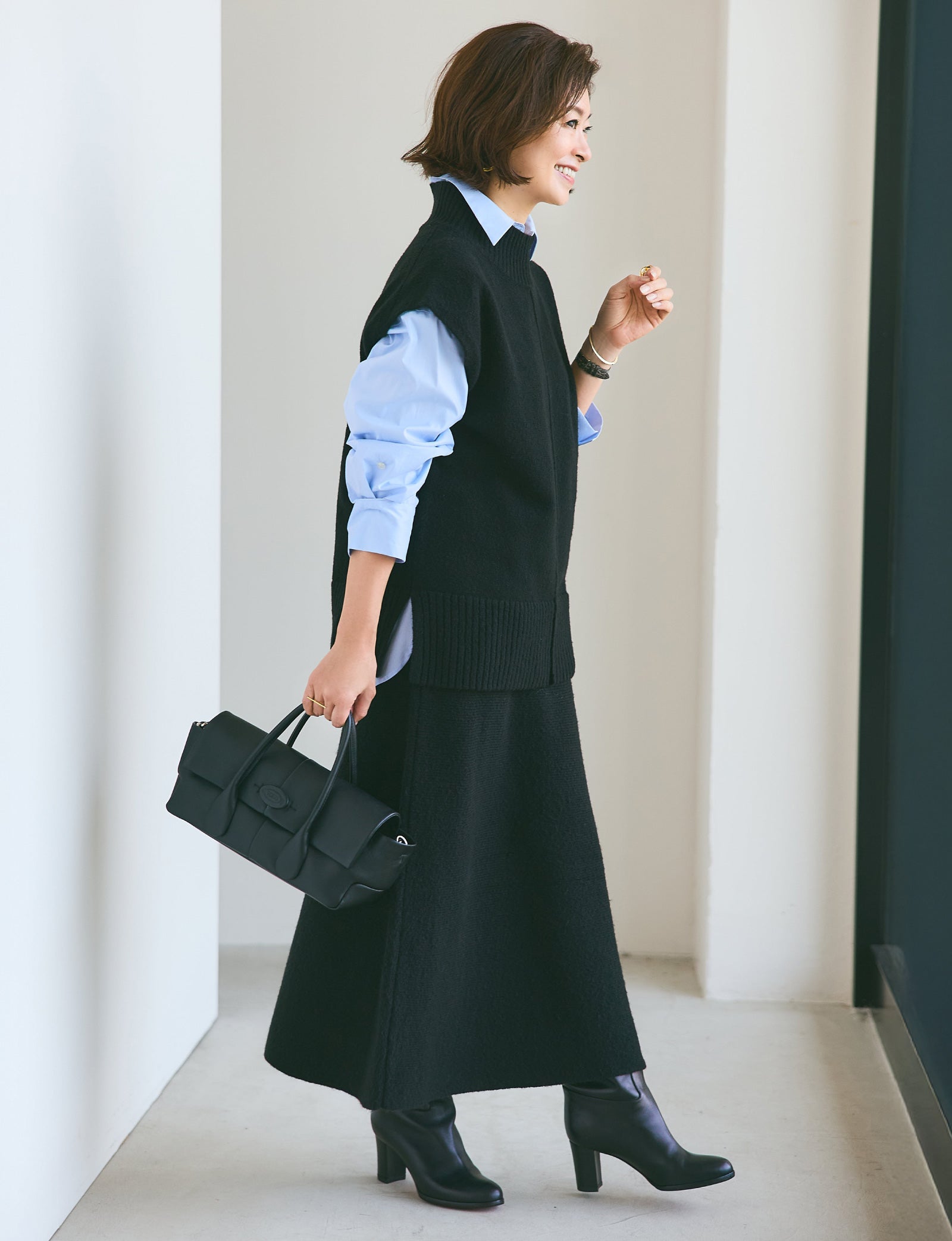 「ニットのベストとロングのフレアスカート。ひと目見て、このセットアップがあったら冬の着こなしが新鮮に回るな、と直感! ベストとスカートは異なる編み地で、やや張り出した肩先や、広がりすぎないスカートのラインなど、さりげない今どき感に惹かれました。凛とした清潔感のあるブルーのシャツを差して、今年らしいレイヤードスタイルに。サイドのスリットがレイヤードスタイルにキレ味を効かせてくれるのもいいです。このセットアップも驚きのプライスで、本当にお得。」