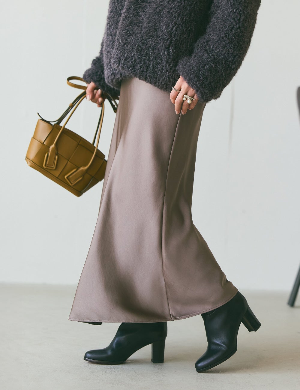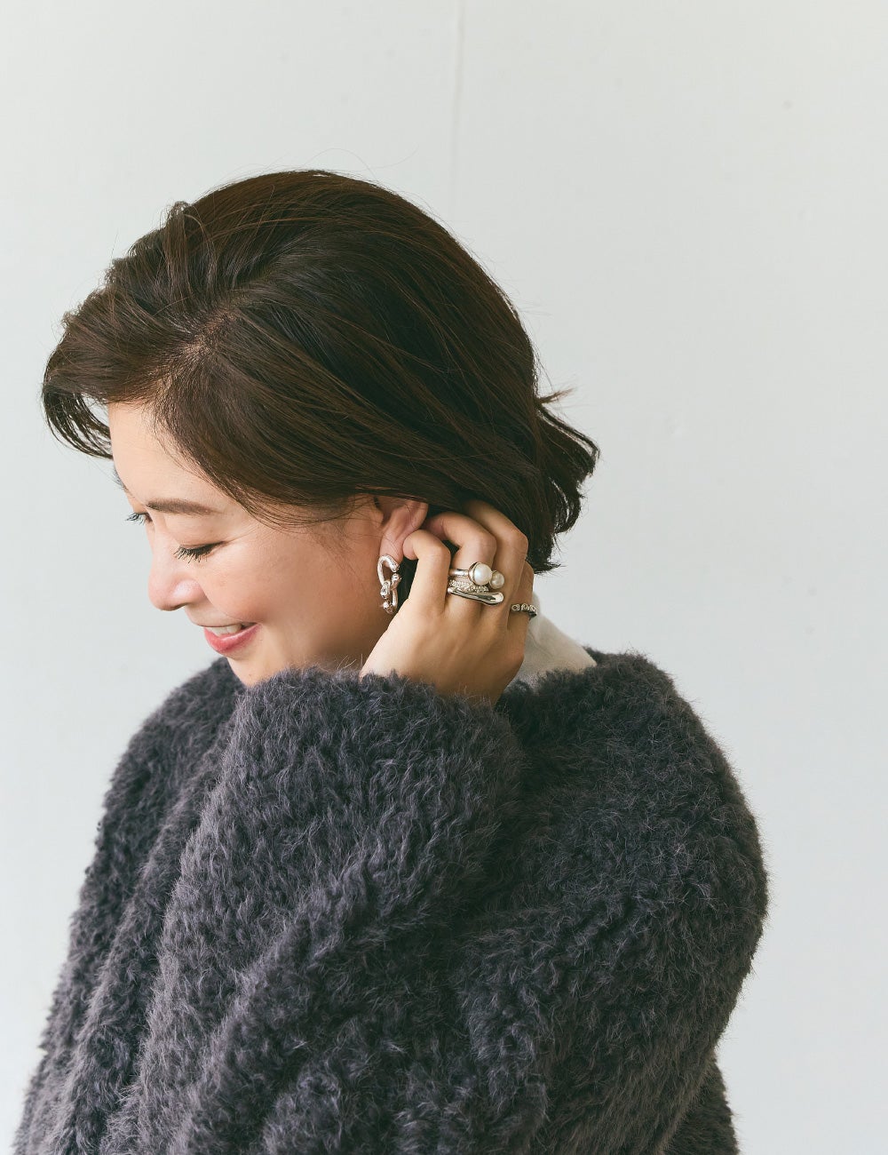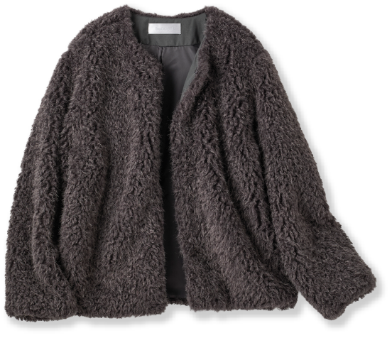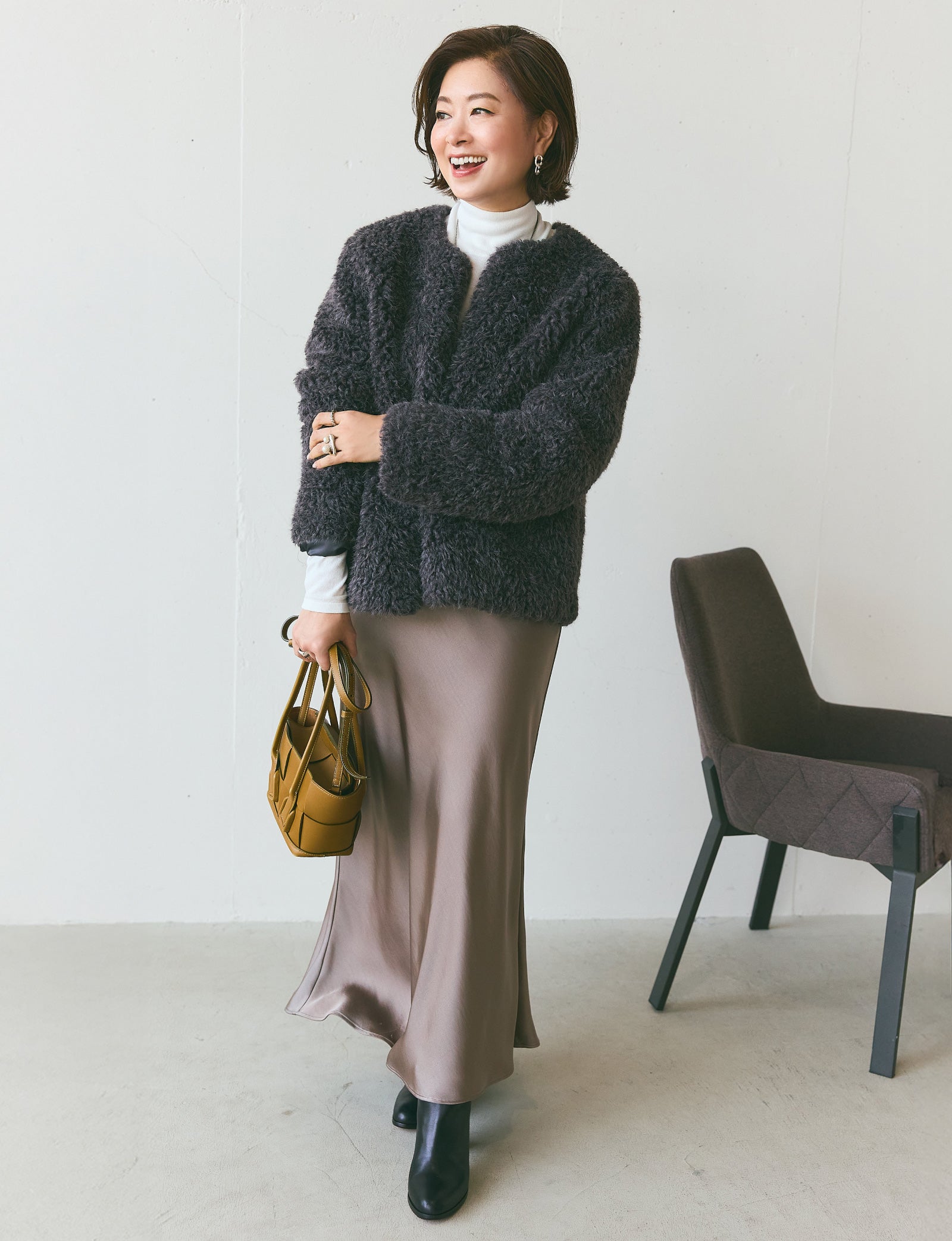 「毛足が密に詰まった、柔らかなボアの質感にうっとり。奥行きのあるグレーの色味と相まって、リッチなかわいげが生まれます。ノーカラーのシンプルなデザインで、気張らずにさっとはおれるのも魅力。サテンのナローフレアスカートを合わせて、素材感のコントラストをつけると軽やかに見えます。華やかなお出かけシーンでも、この一枚があると気分が上がりますね。インしたシアーニットも、とろんと柔らかくて、透け感も繊細。エレガントに振りたい時や、ジャケットのインナーにも重宝しそう。」