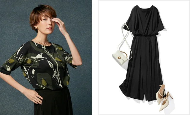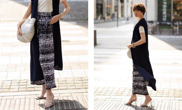 UVスラブ特有のすとんと落ちる質感と、ほのかな光沢で上品見えのコーディネート。同色&同柄で合わせてワンピース風にも着こなせます。