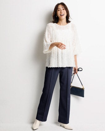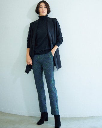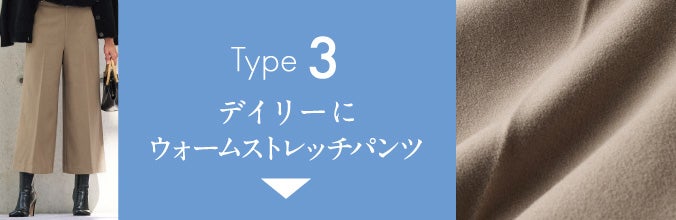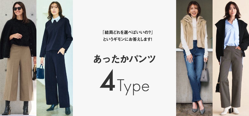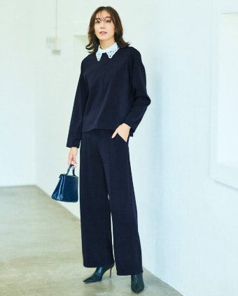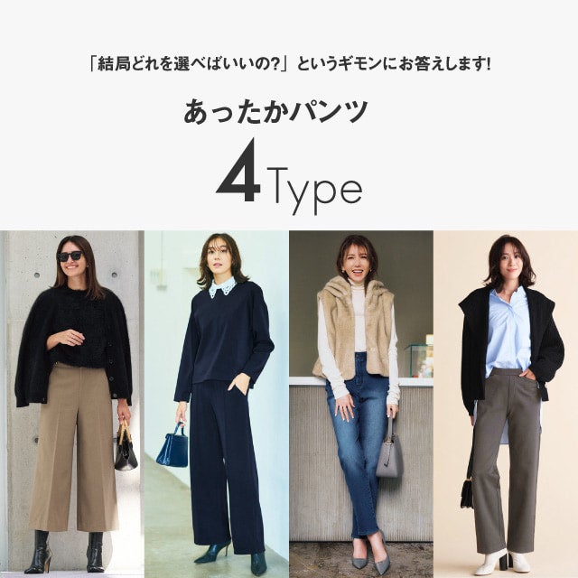見た目は上品で落ち着いた印象のジョーゼット風パンツですが、じつは楽に伸びてシワが気にならない、暖かな裏起毛のカットソーパンツ。適度なハリと厚みで脚のラインも拾いにくく、オフィスからカジュアルスタイルまで幅広く活躍します。