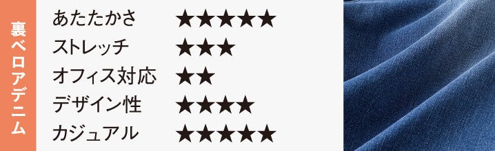大好きなデニムも、冬は寒くて手が伸びなくなる――。そんなお声をもとに誕生したのが、「裏ベロアデニム」です。 その名の通り、デニムの裏になめらかな毛足のベロア素材を貼りつけることで、冬場もOKの暖かな風合いに仕上げました。下にタイツなどを重ねなくても1枚ではけるから、着ぶくれることなくすっきり美脚見え。肌あたりもふんわり優しく、ストレスフリーなはき心地です。