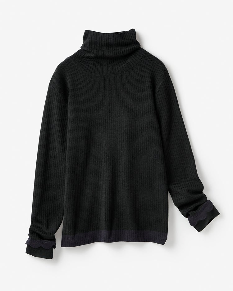 気を抜くと地味に見えしてしまう黒コーデには、異素材使いが印象的なコートでまわりと差が付く個性をプラス。袖のジップを開けたマント風の着こなしは、下半身を華奢見えさせる着痩せ効果もあります。