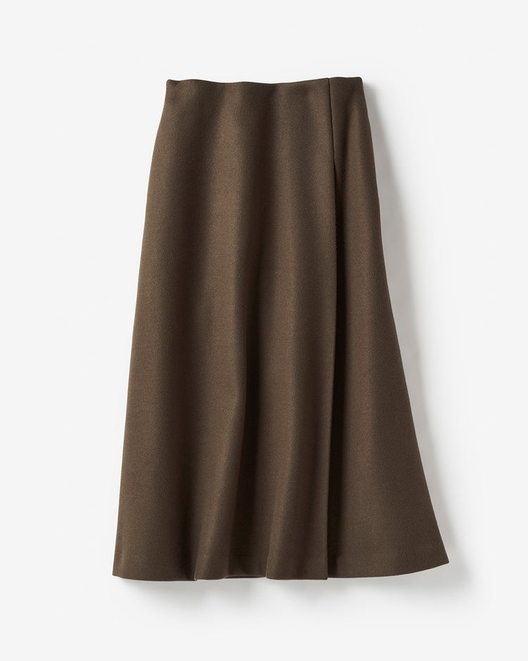 相性抜群の色合わせ、キャメル×カーキのナチュラル配色のコーデ。タートルニット×Aラインスカートという一見コンサバな着こなしも、カジュアル要素をプラスしたキルト使いのコートを羽織れば抜け感のある印象にまとまります。