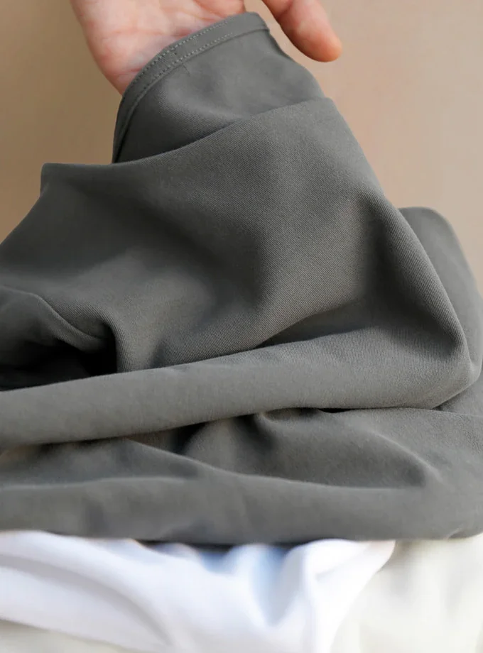 素材はコットン100%の「100番双糸」。高番手の超極細糸を2本どりで撚糸することで、ぬめりのある光沢感とシャリっと爽やかな肌触りを両立。